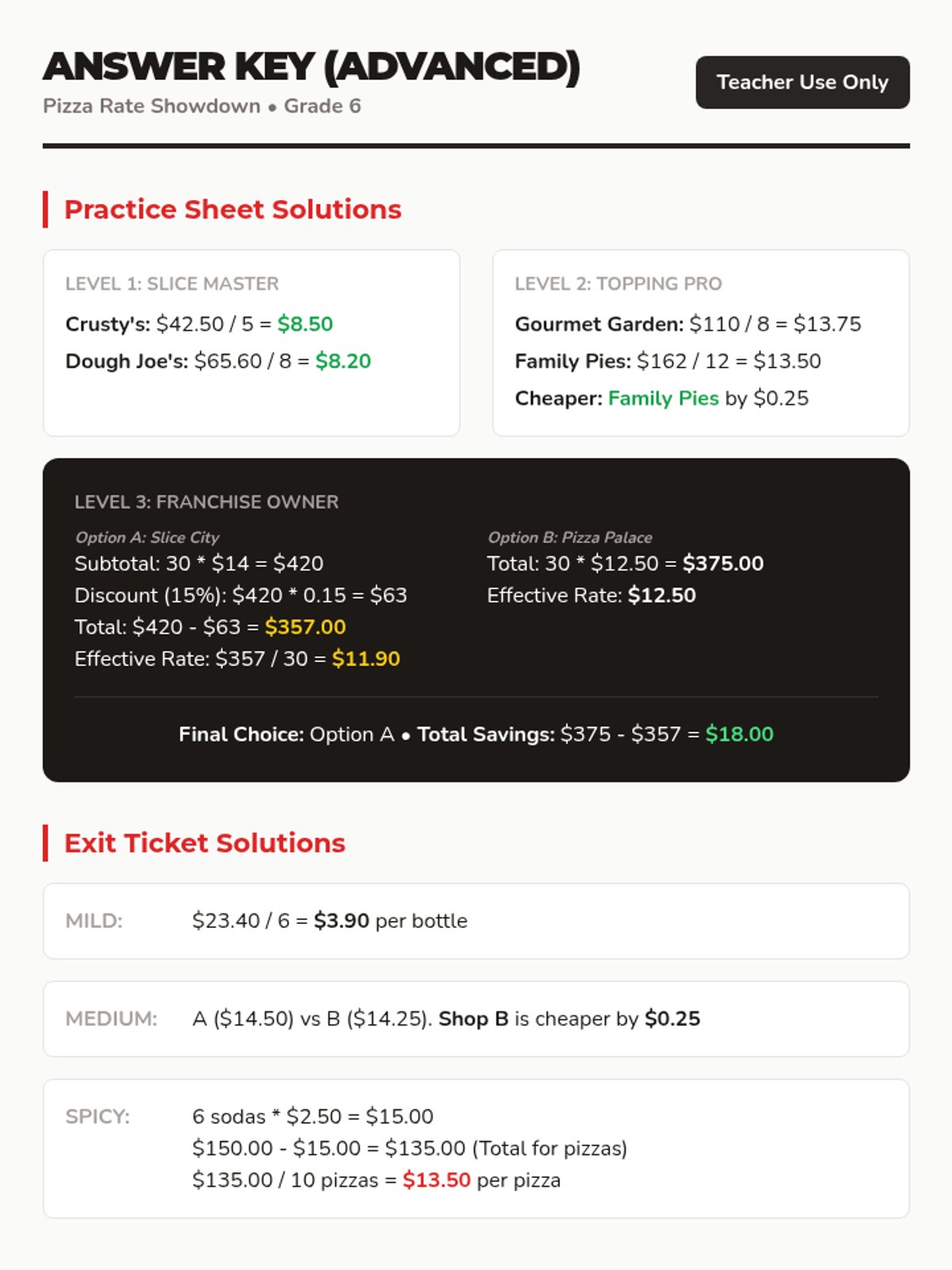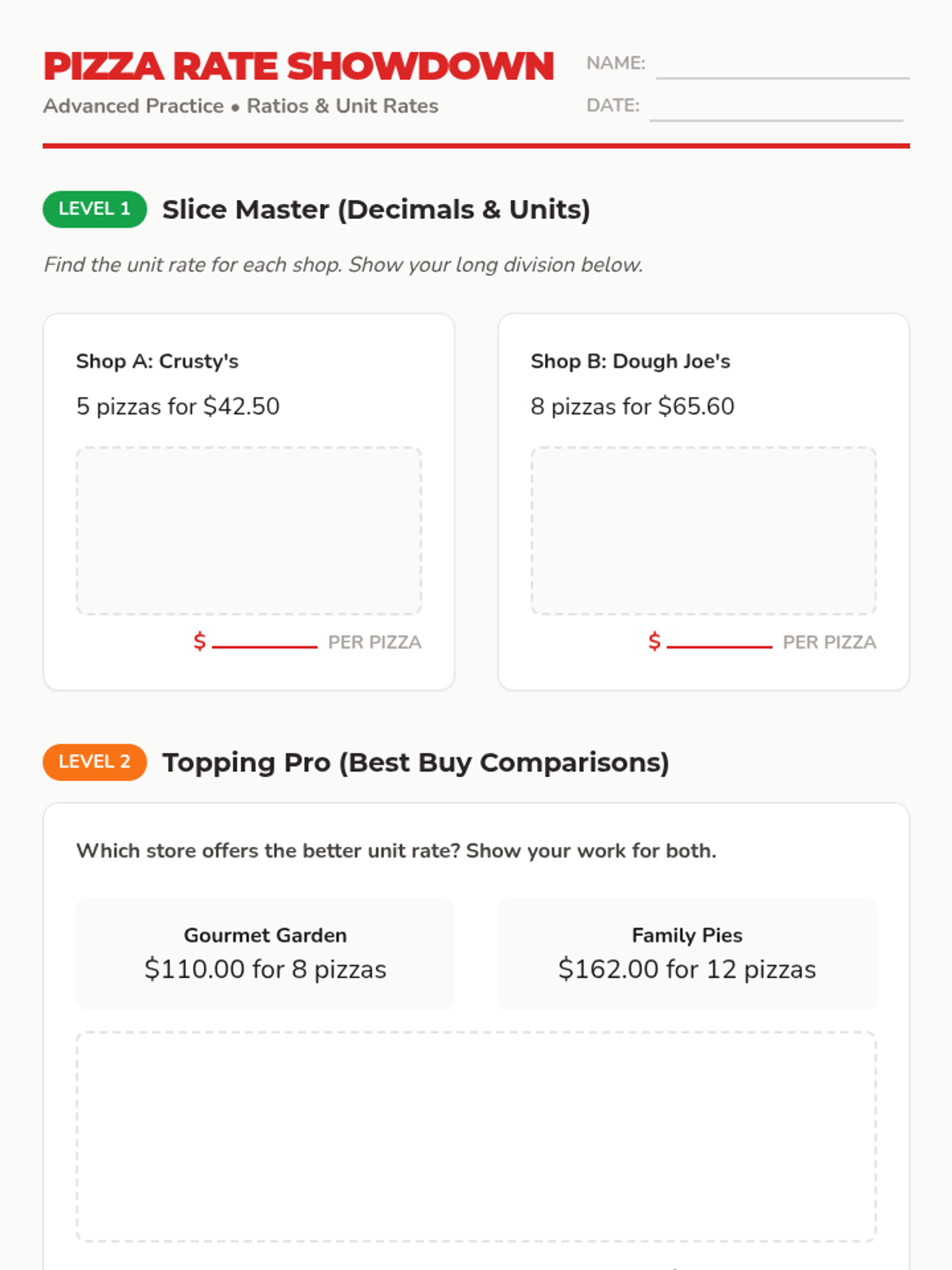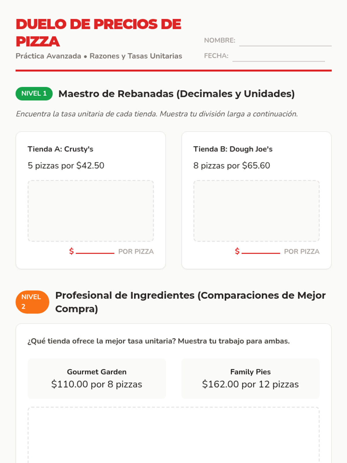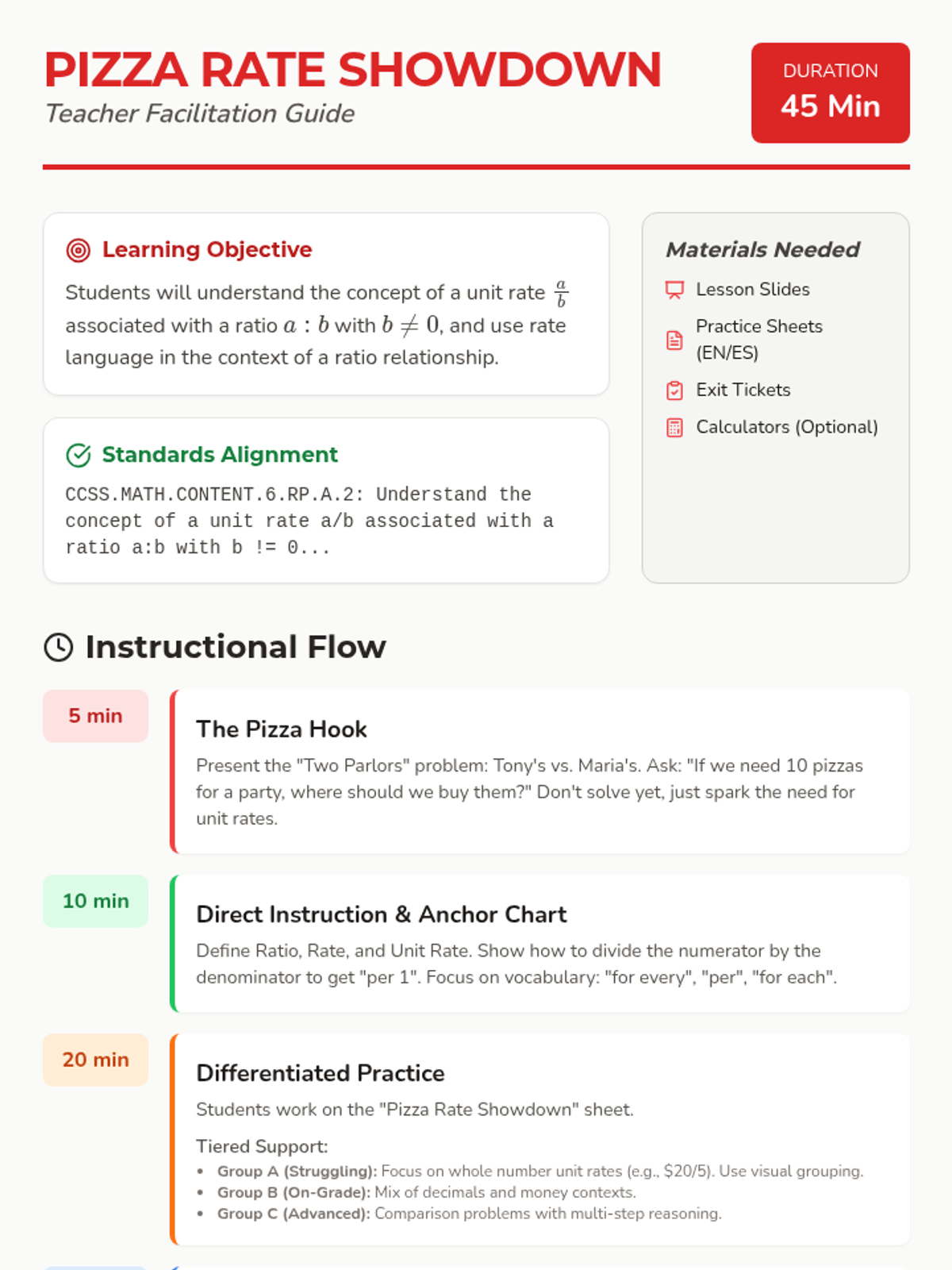 A 45-minute lesson focusing on calculating and comparing unit rates using a pizza delivery context. Includes differentiated practice and bilingual support for 6th grade students.
