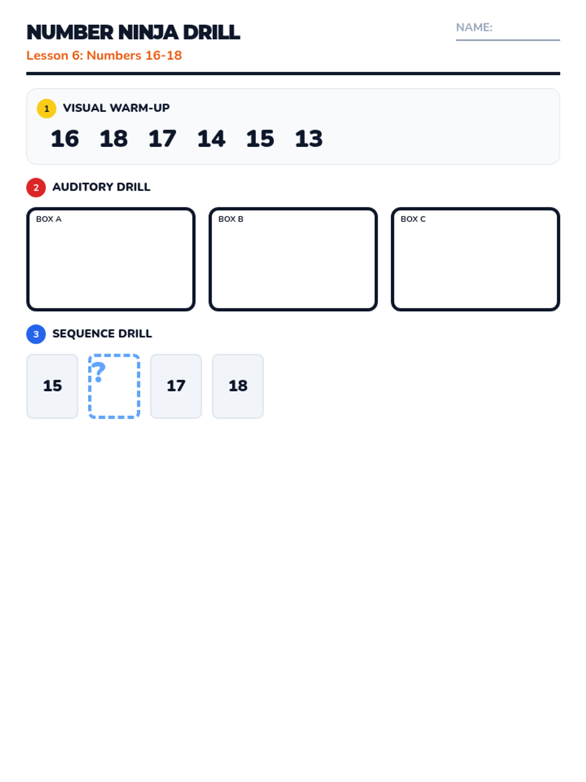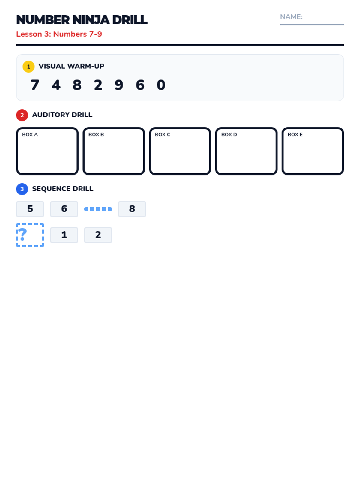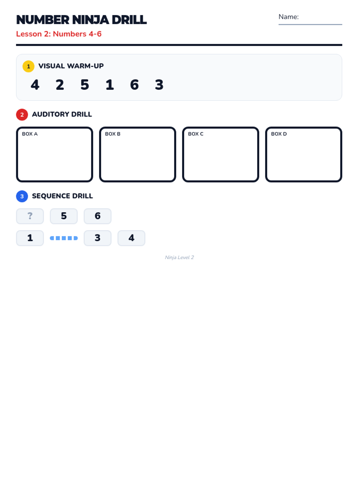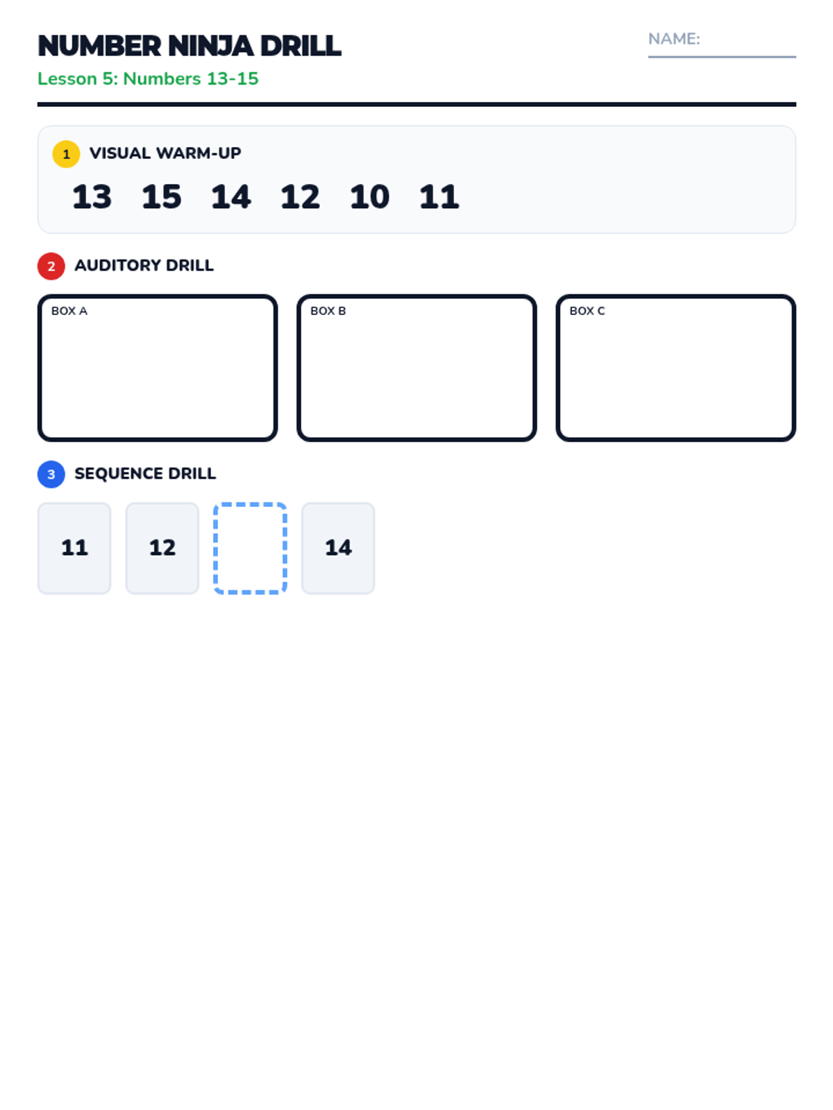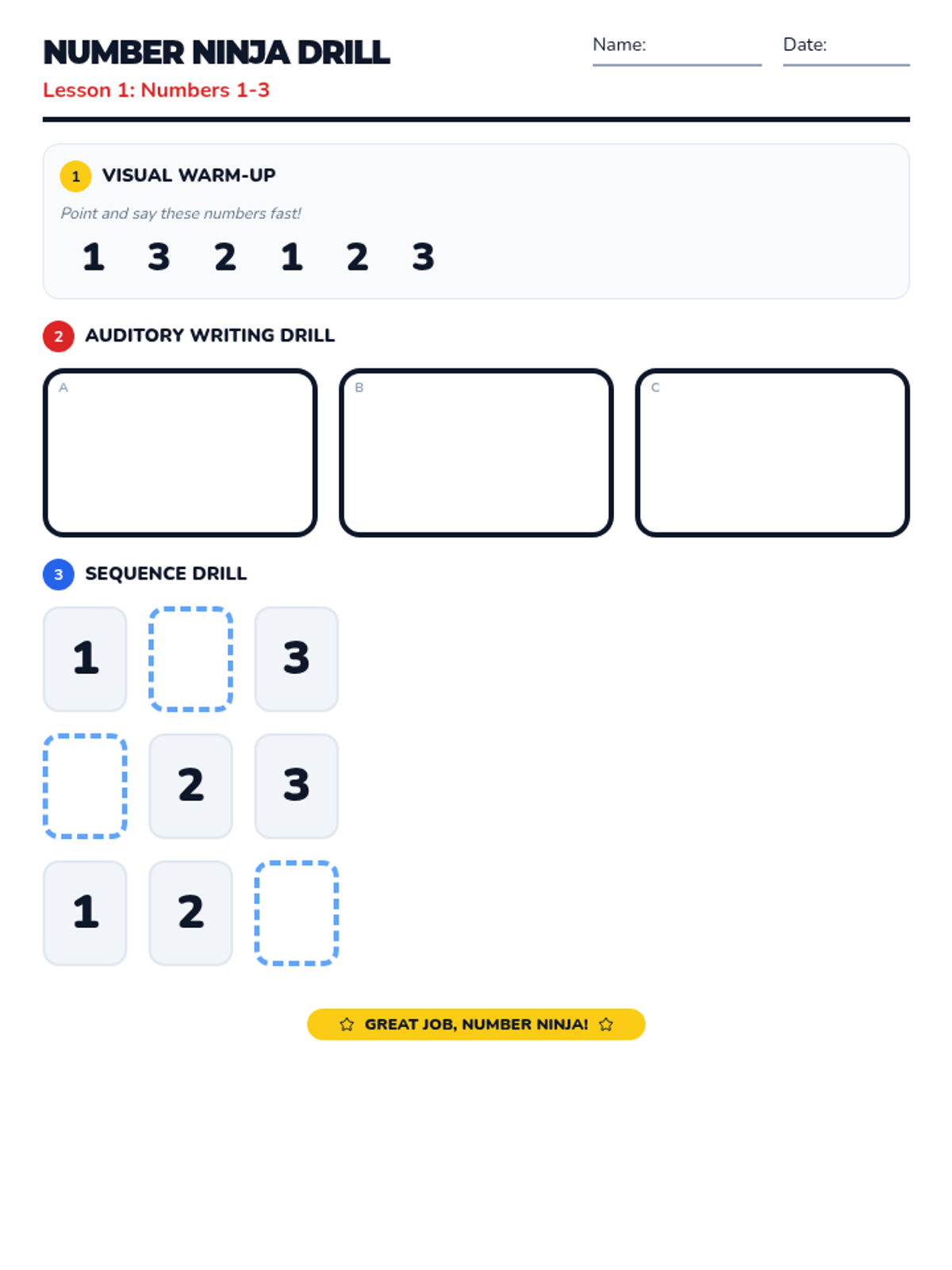 Focus on identification and writing of numbers 1-5, featuring a 3-part drill for visual, auditory, and sequential skills.