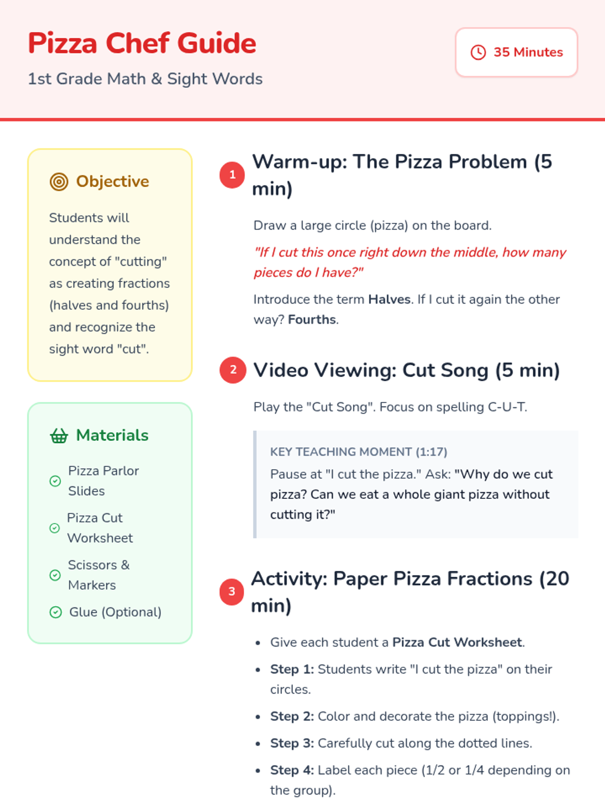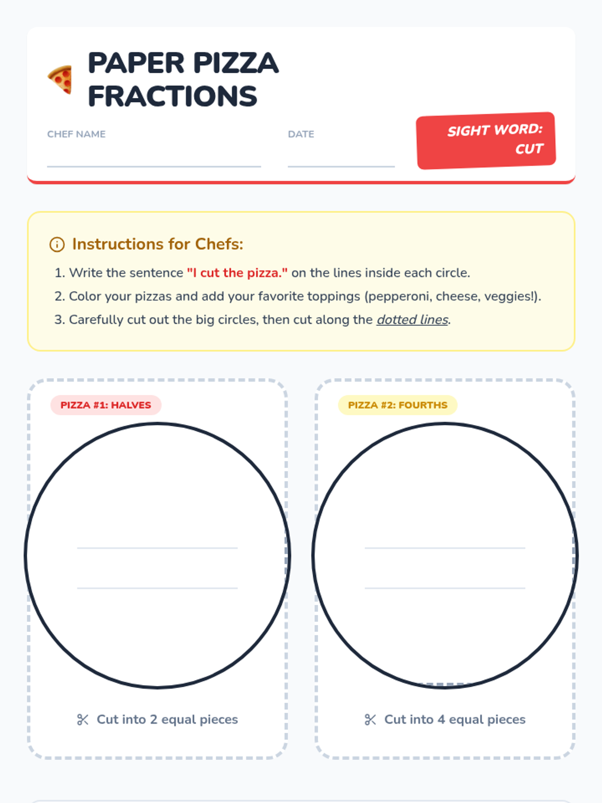 A hands-on introduction to fractions (halves and fourths) using the concept of cutting pizza, featuring a catchy sight-word song and a creative paper-cutting activity.