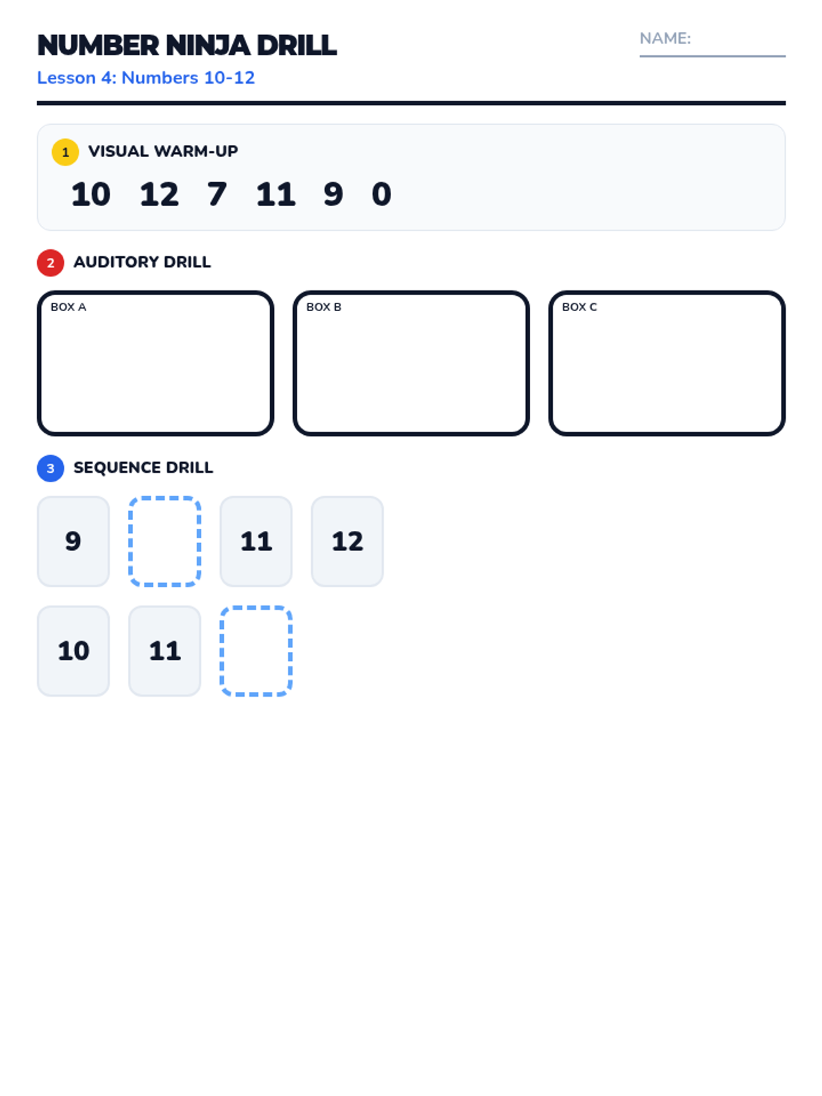 Focuses on numbers 10-12, introducing the teen number structure while reviewing 1-9.