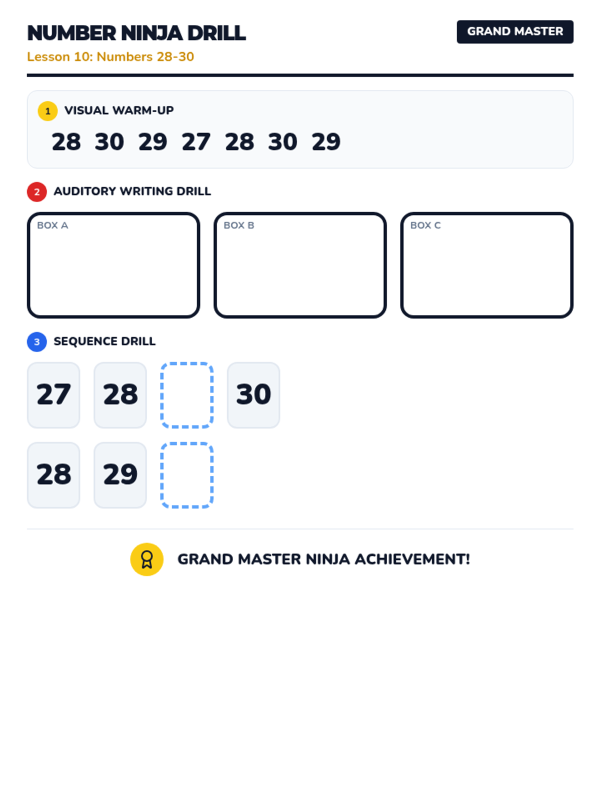 Focuses on numbers 28-30 and a comprehensive review of all numbers 1-30.