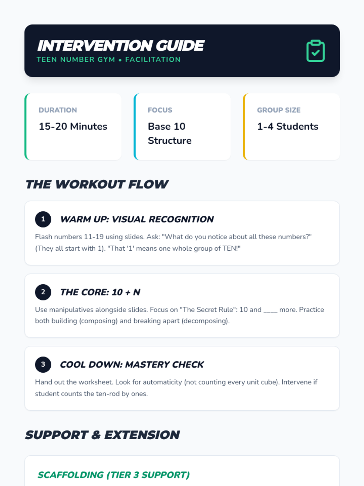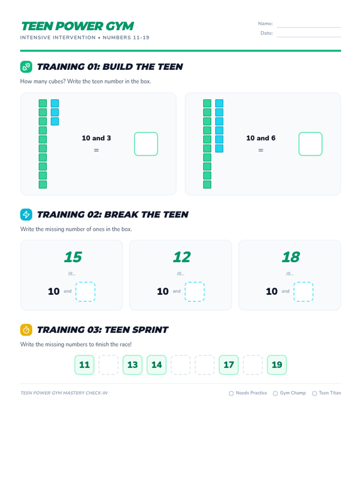 A high-energy intensive intervention designed to help kindergarten students master teen numbers through the lens of a "number gym," focusing on composition, decomposition, and identification.