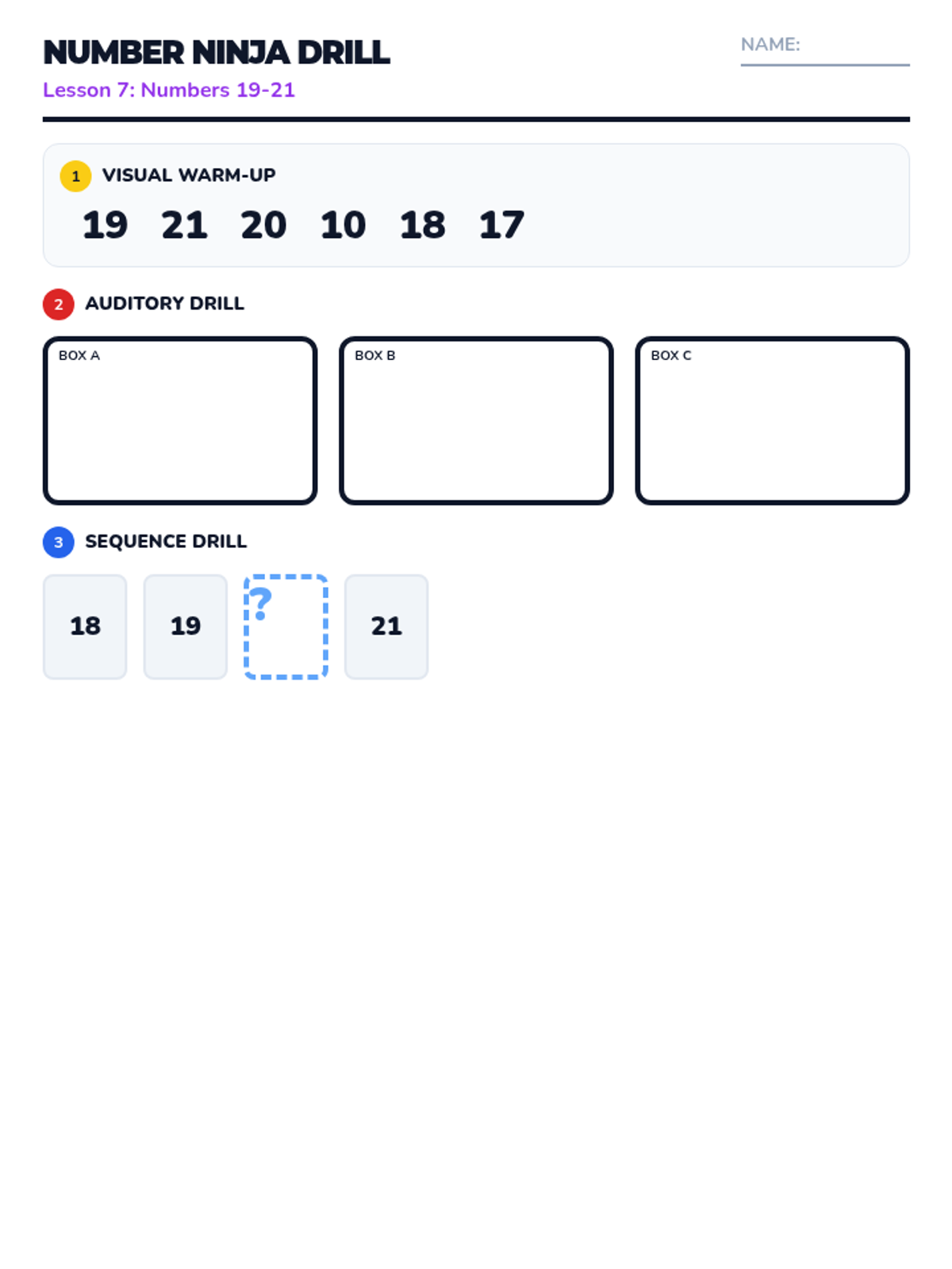 Lesson Day 7 of the Number Gym routine. Practice across decades (0-30).