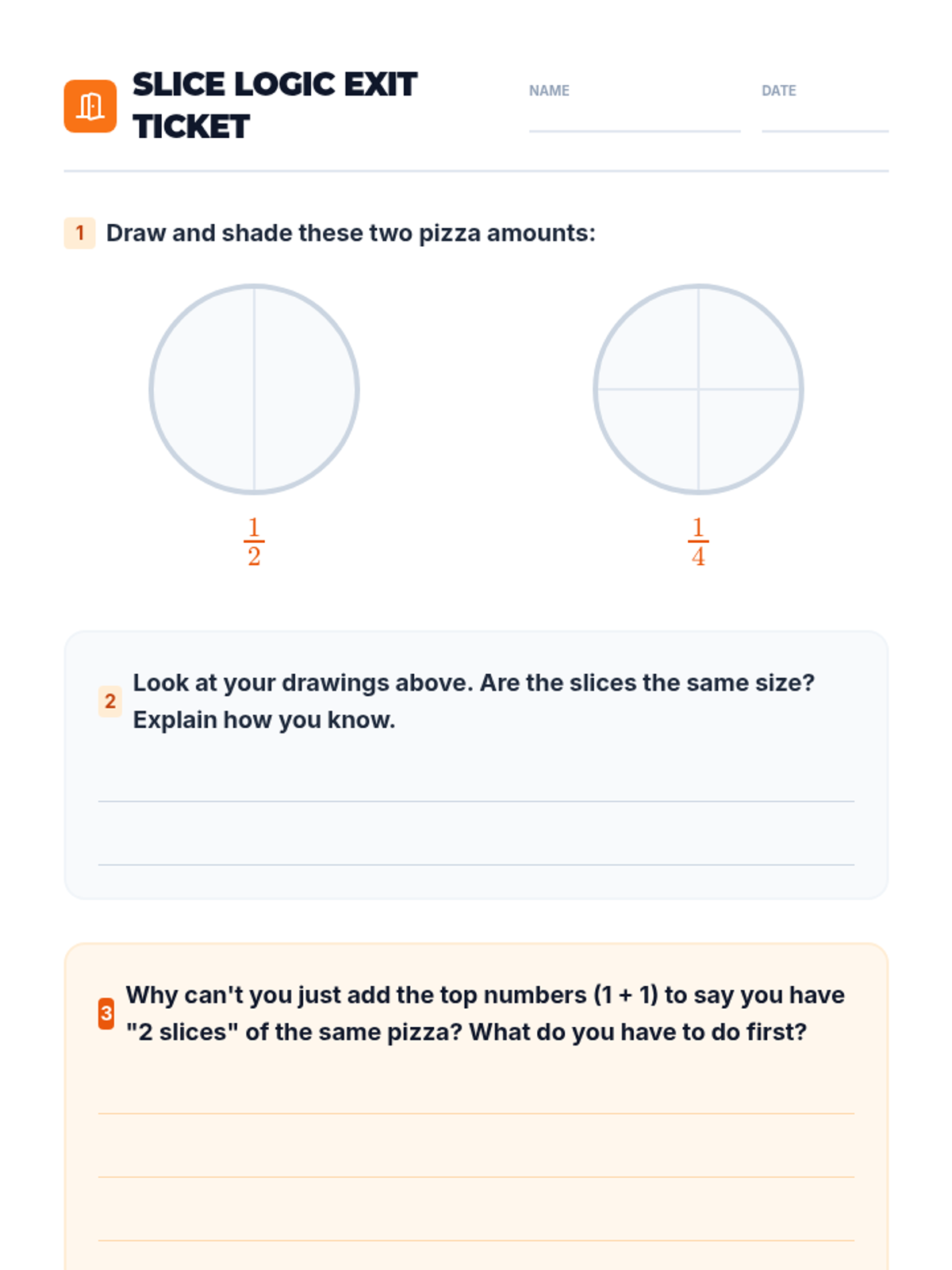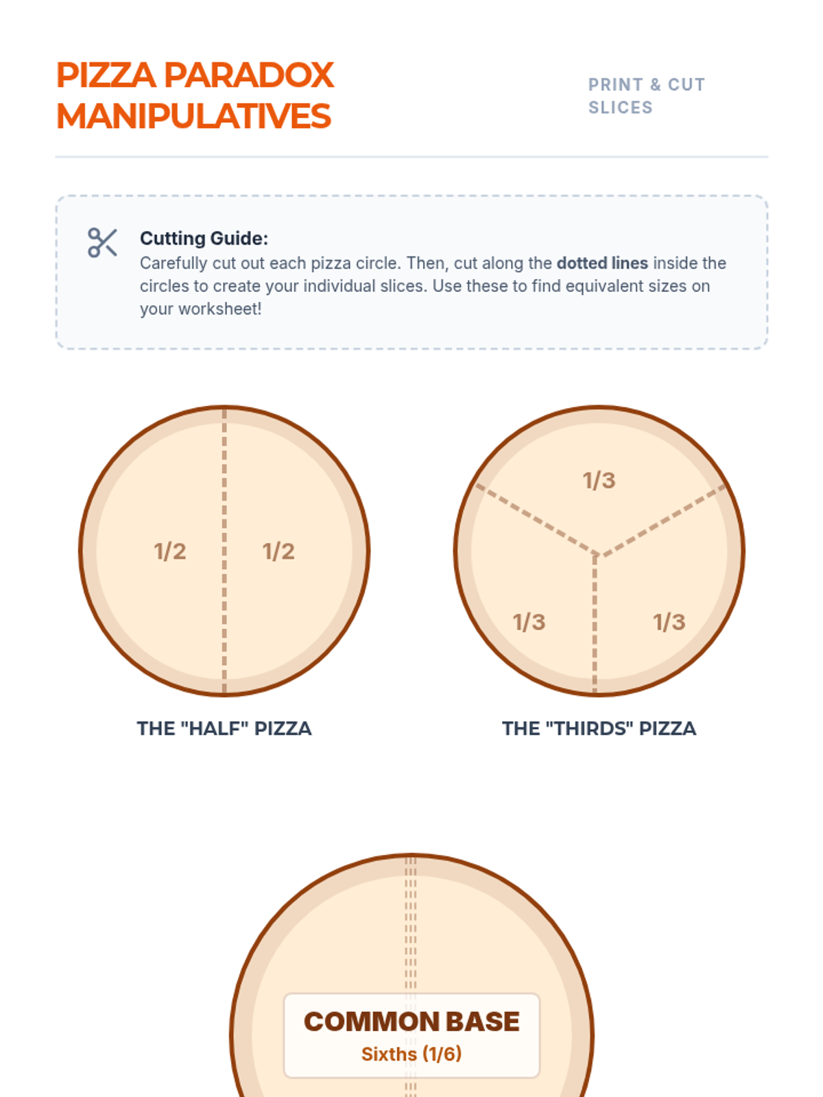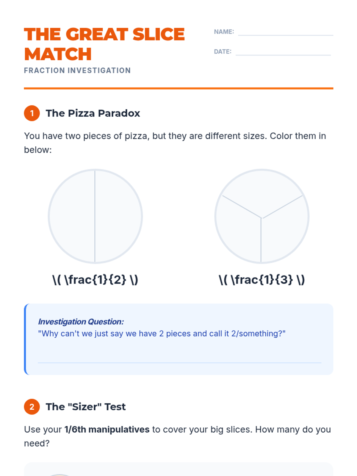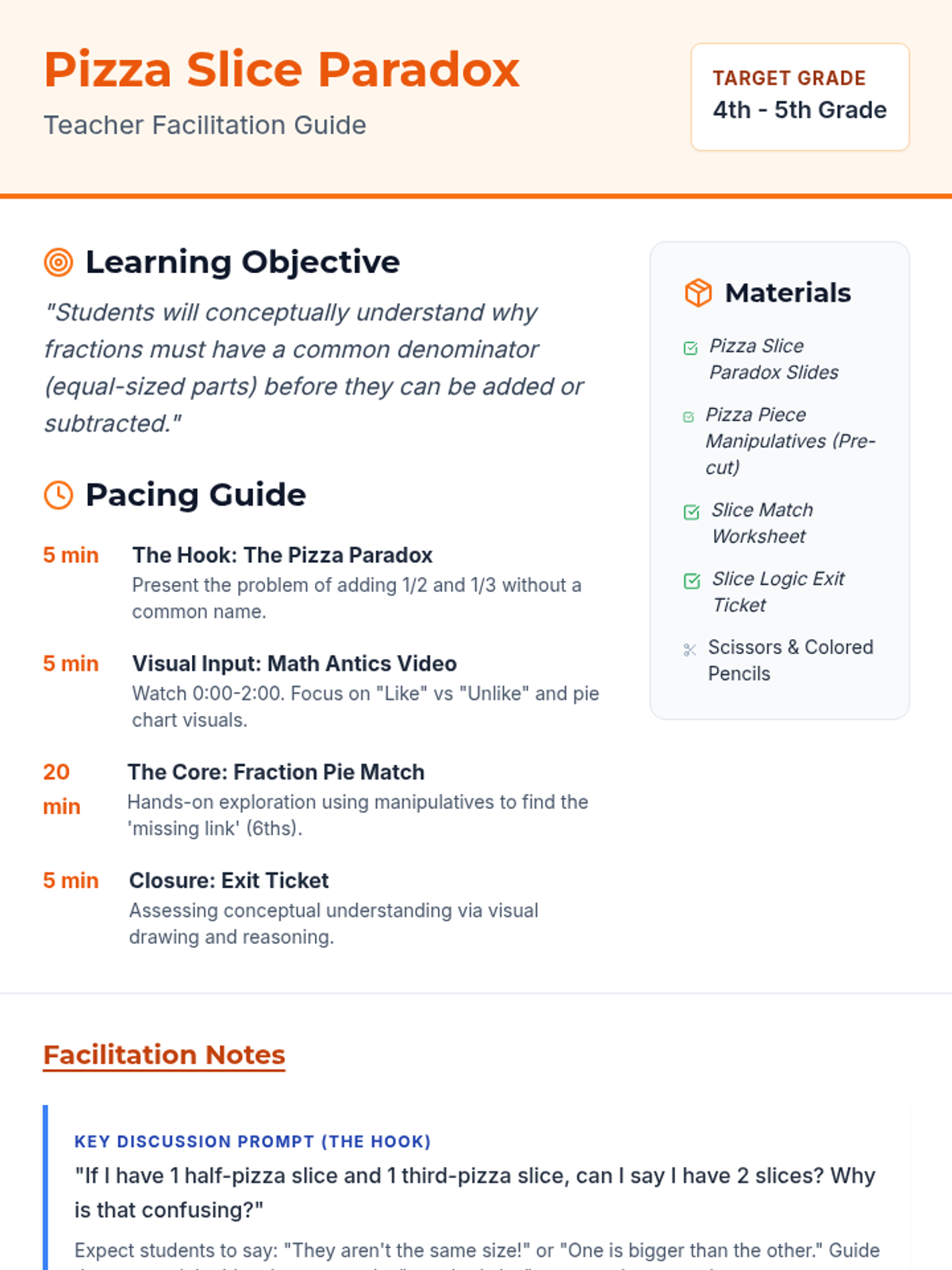 Students explore the conceptual necessity of common denominators through a pizza-themed inquiry, using physical manipulatives to bridge the gap between 'unlike' slices and 'like' units.