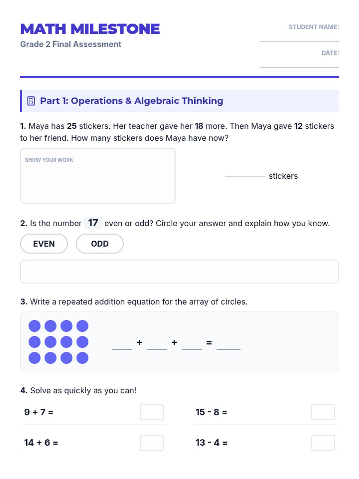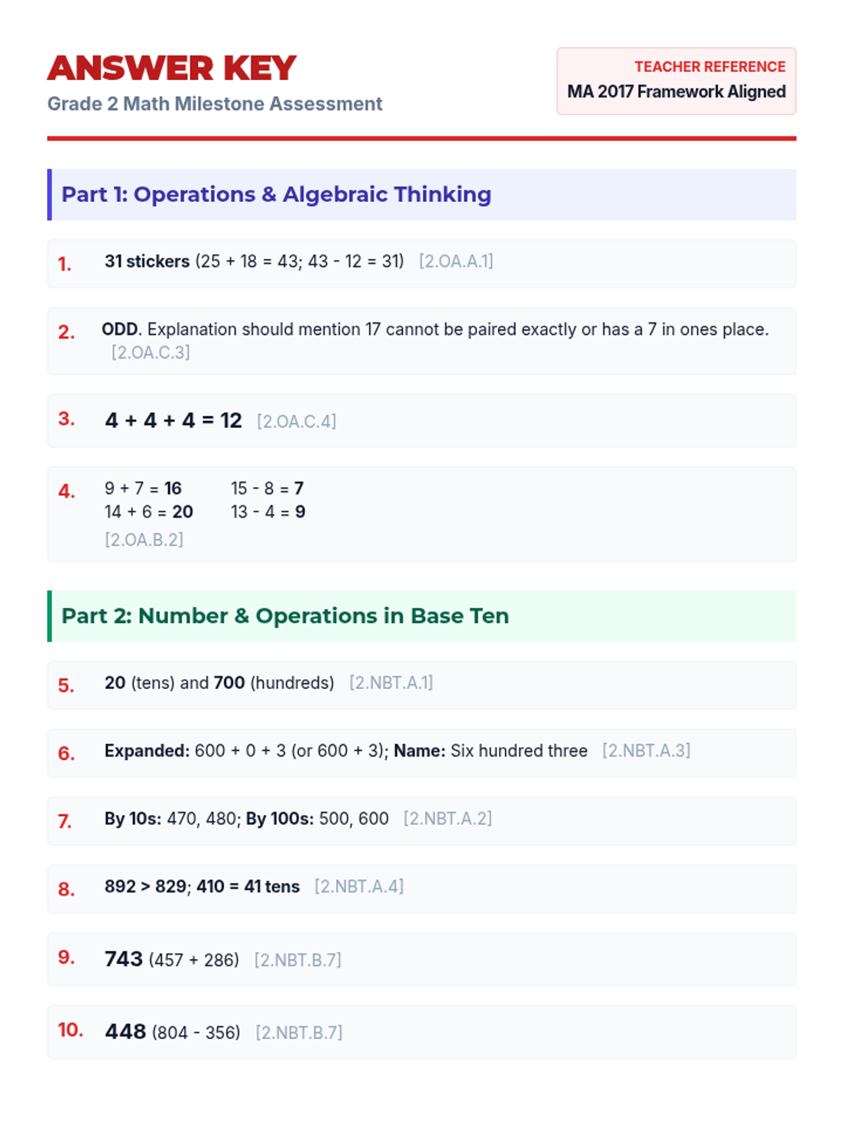 A comprehensive end-of-year assessment for second-grade students, covering all Massachusetts Mathematics Curriculum Framework standards including Operations and Algebraic Thinking, Number and Operations in Base Ten, Measurement and Data, and Geometry.