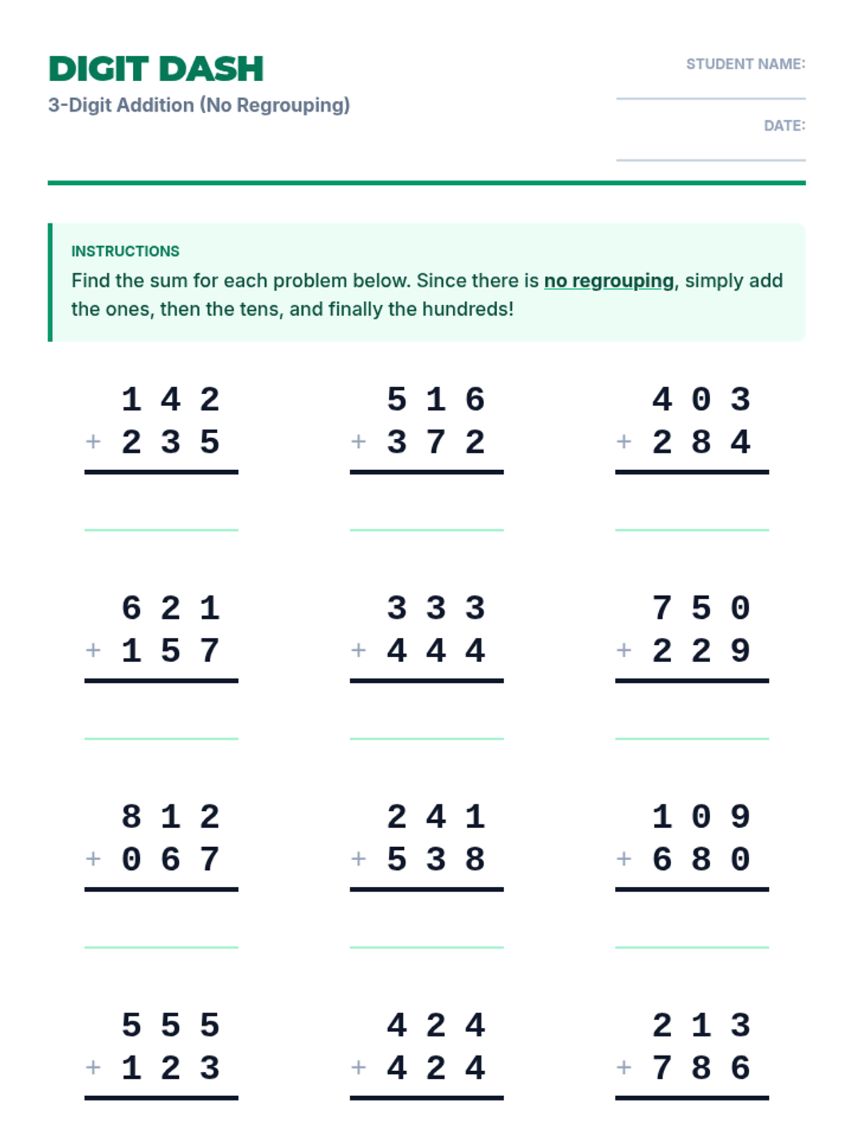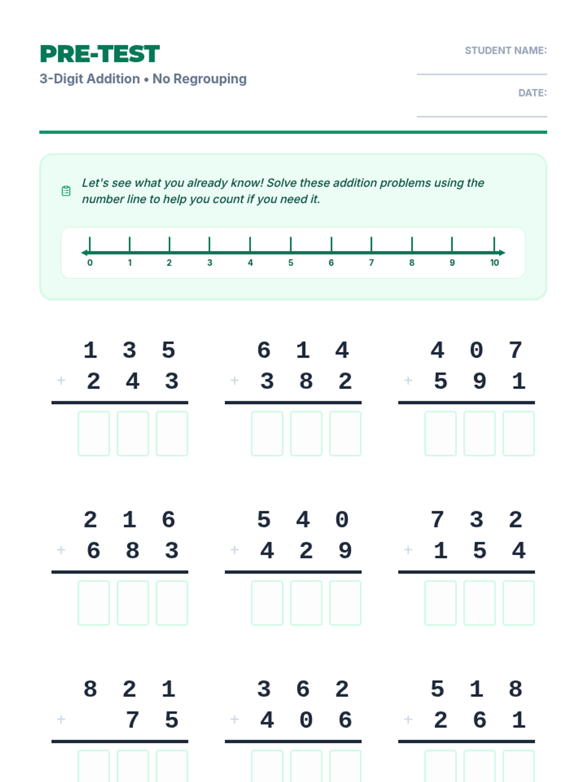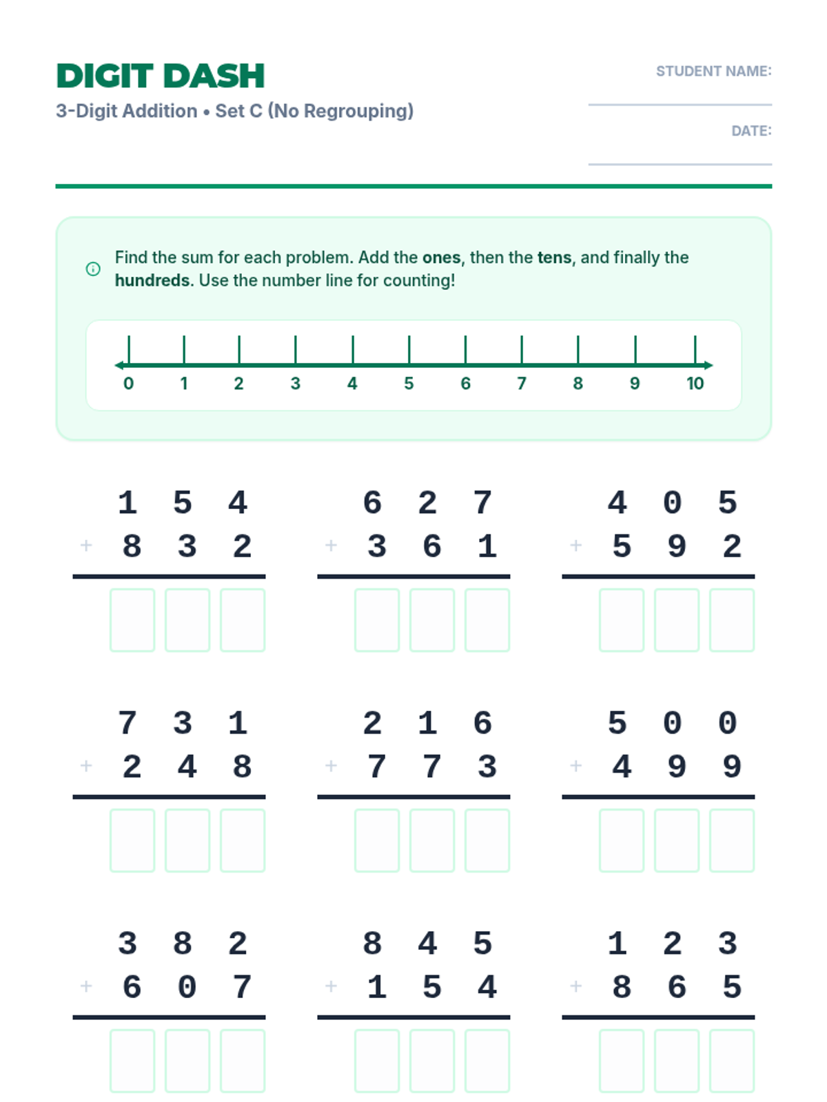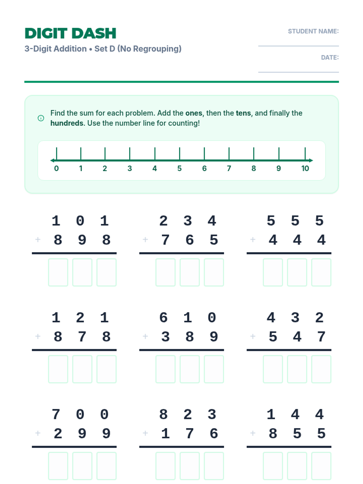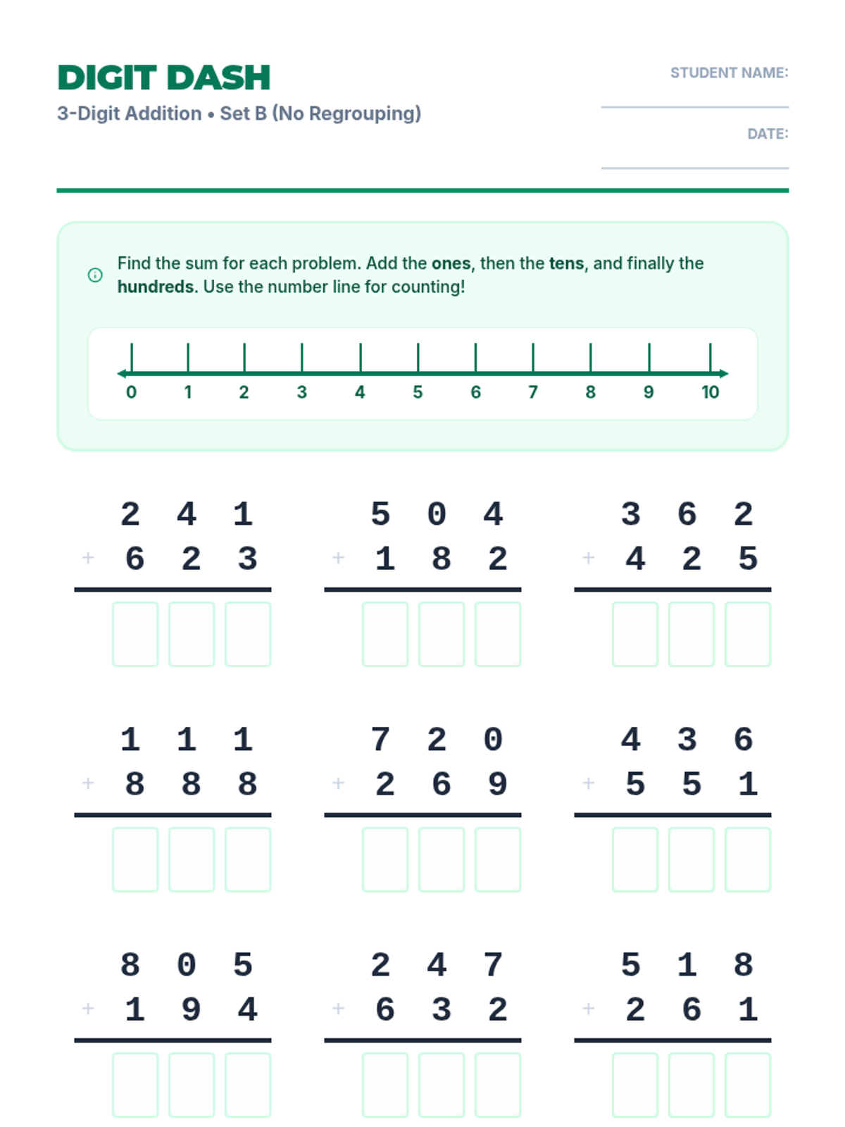 A series of practice worksheets focused on three-digit subtraction without regrouping, featuring a visual number line to assist with mental math and place value visualization.