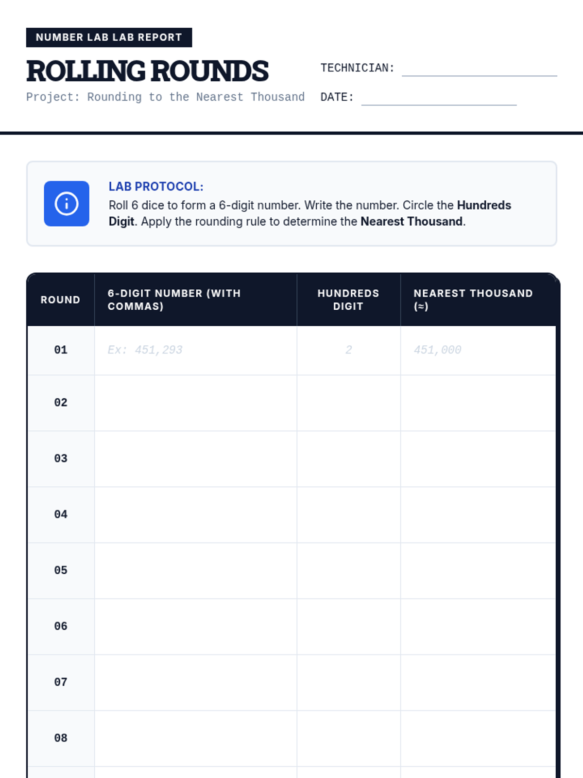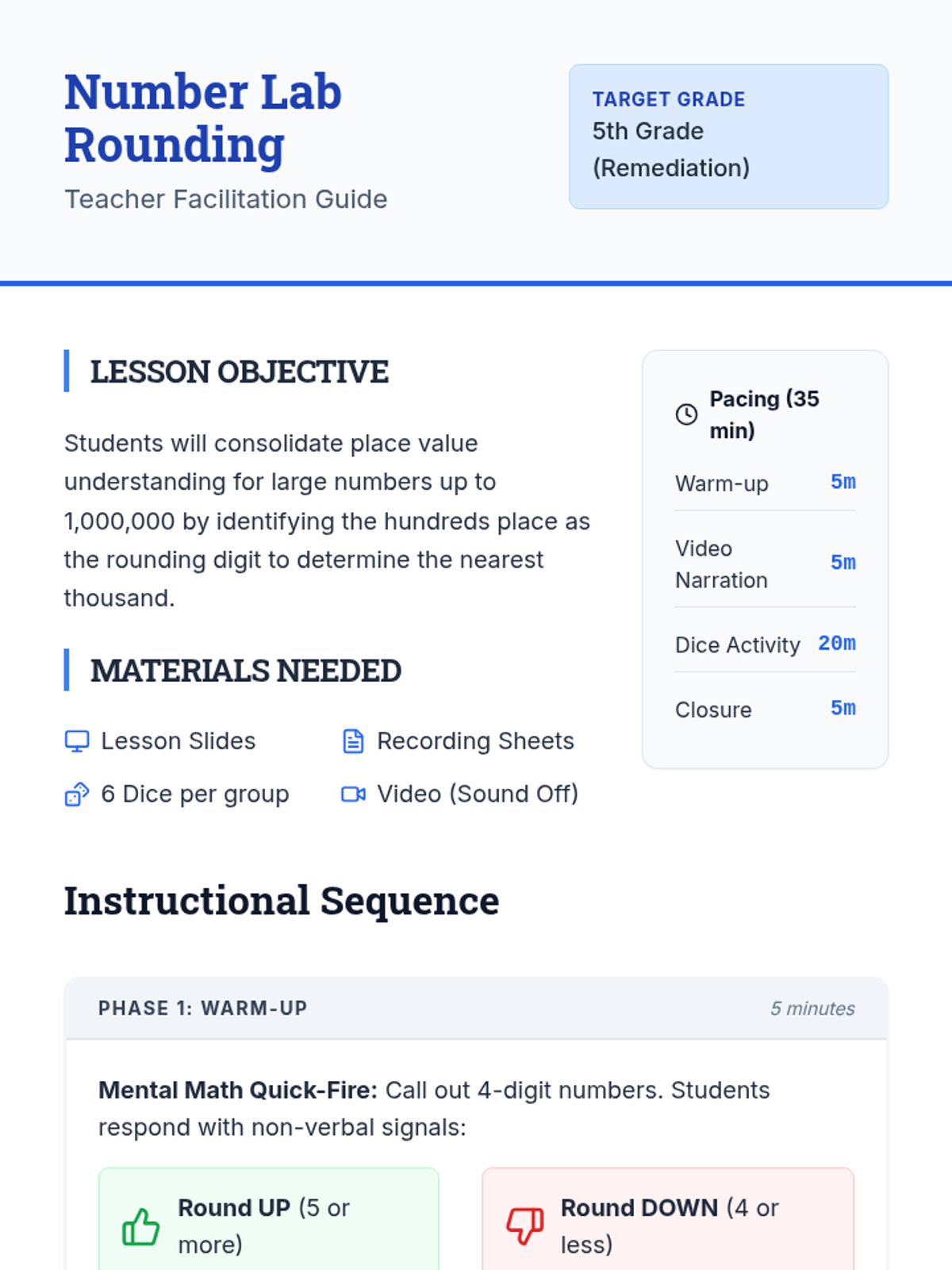 A remediation lesson for 5th graders to master rounding 6-digit numbers to the nearest thousand using a 'Number Lab' theme. Includes a student-narrated video activity and a hands-on dice rolling simulation.
