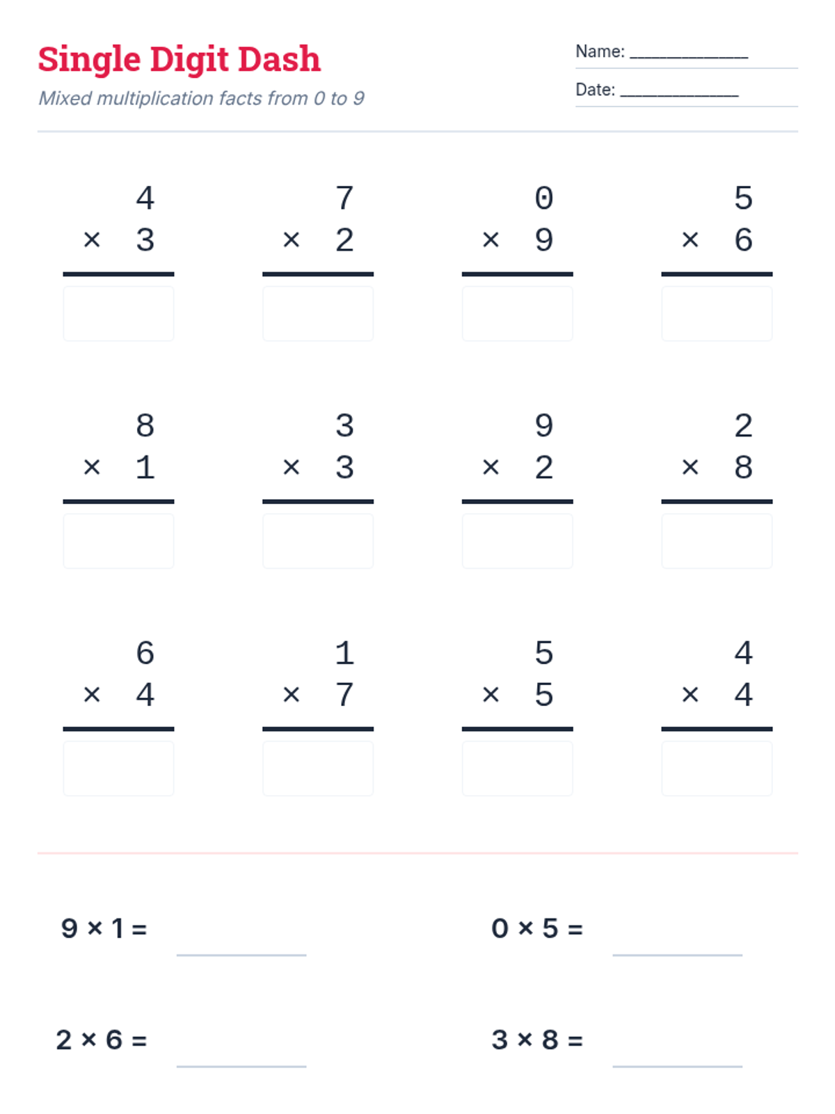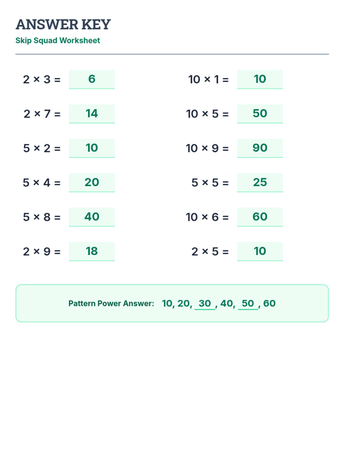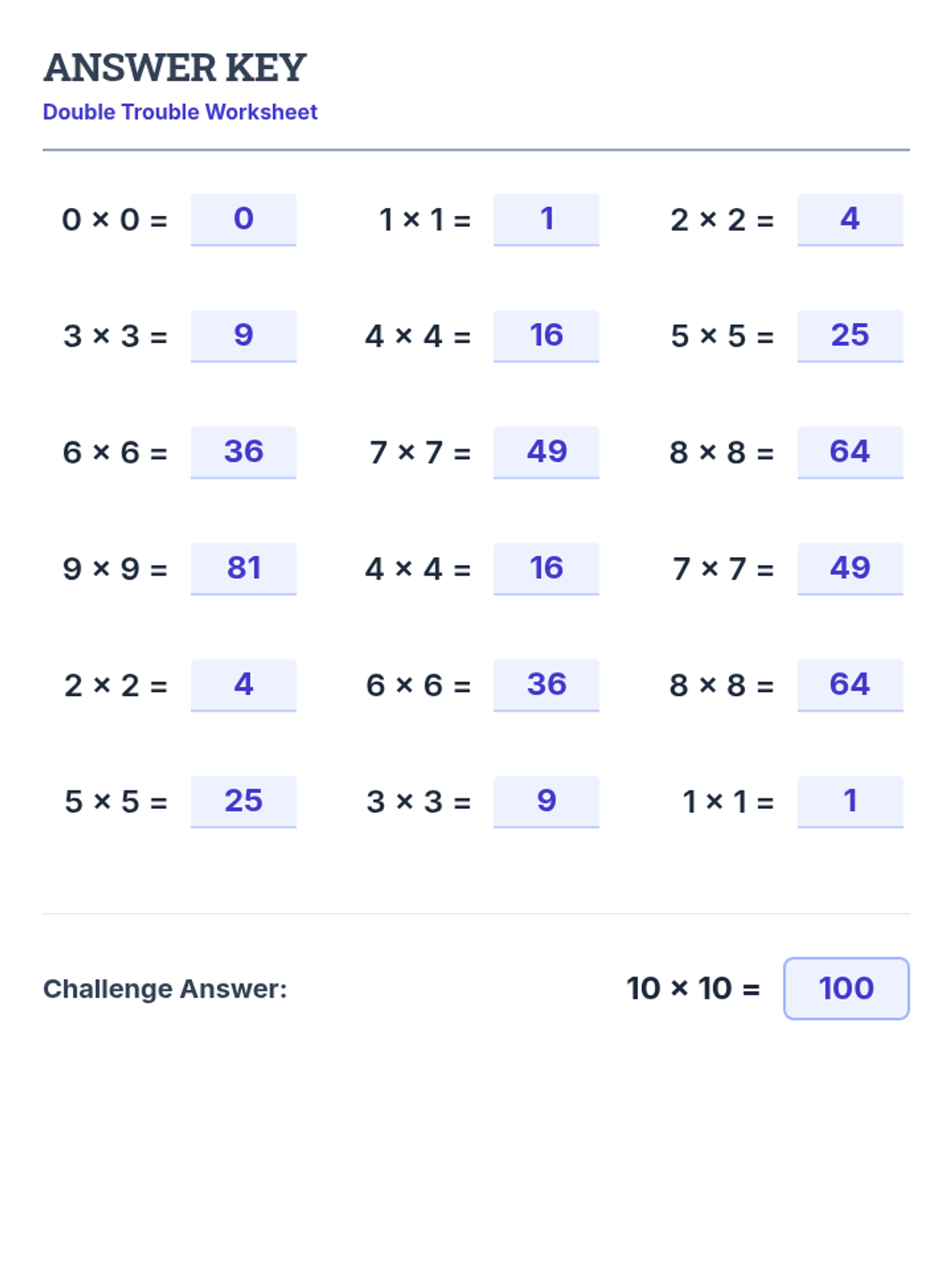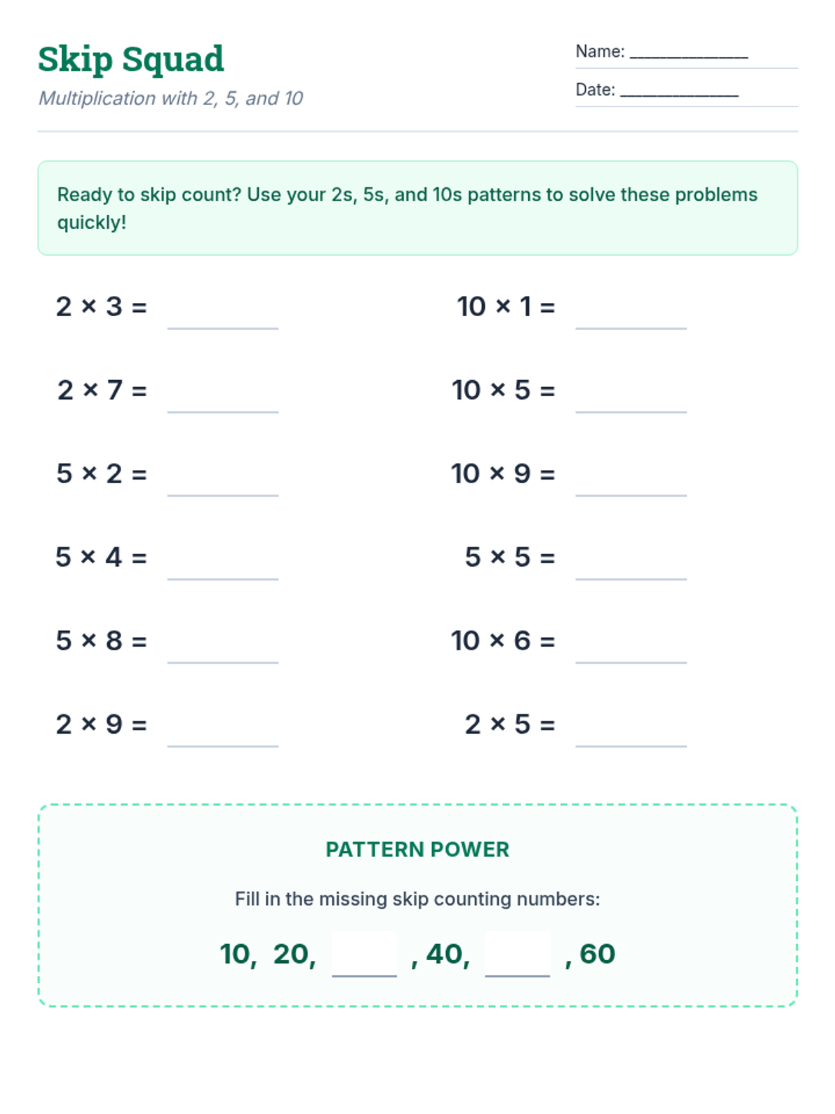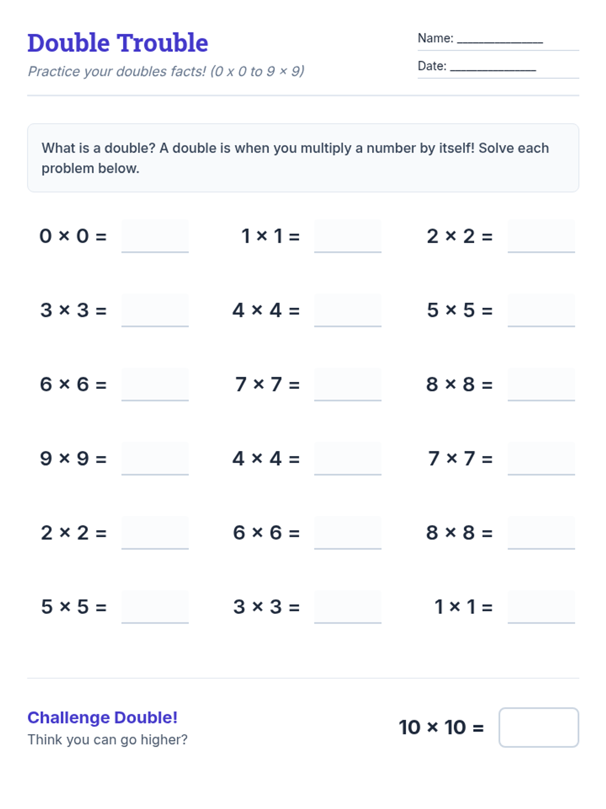 A foundational multiplication lesson focusing on doubles, skip counting patterns (2s, 5s, 10s), and single-digit facts through 9. Includes focused practice worksheets and answer keys for skill building.