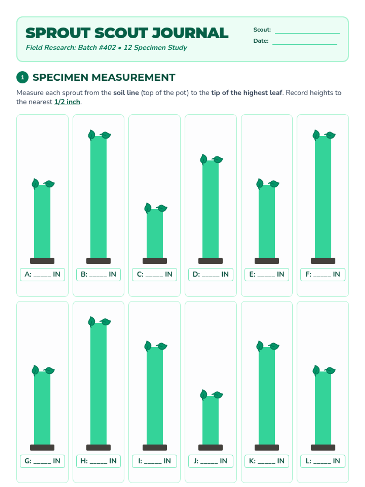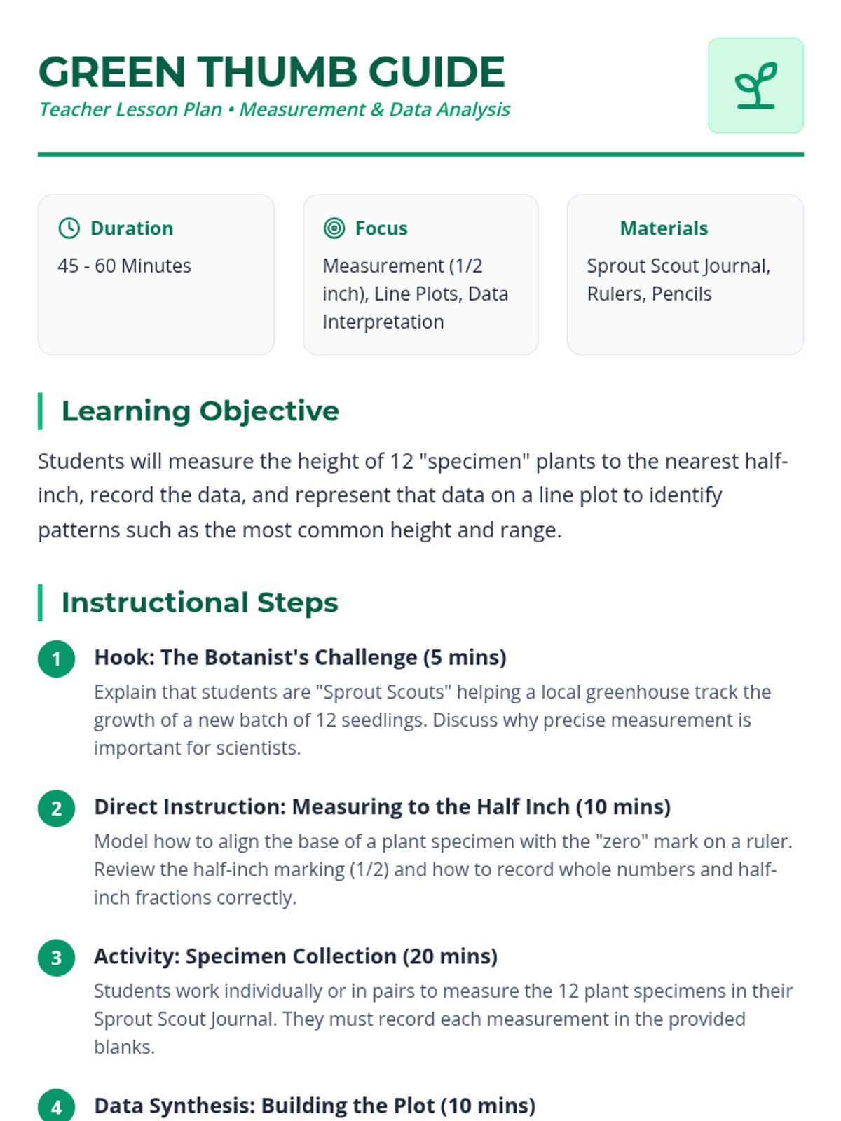 A hands-on measurement activity where students measure plant growth specimens, record data, and create a line plot to analyze their findings.