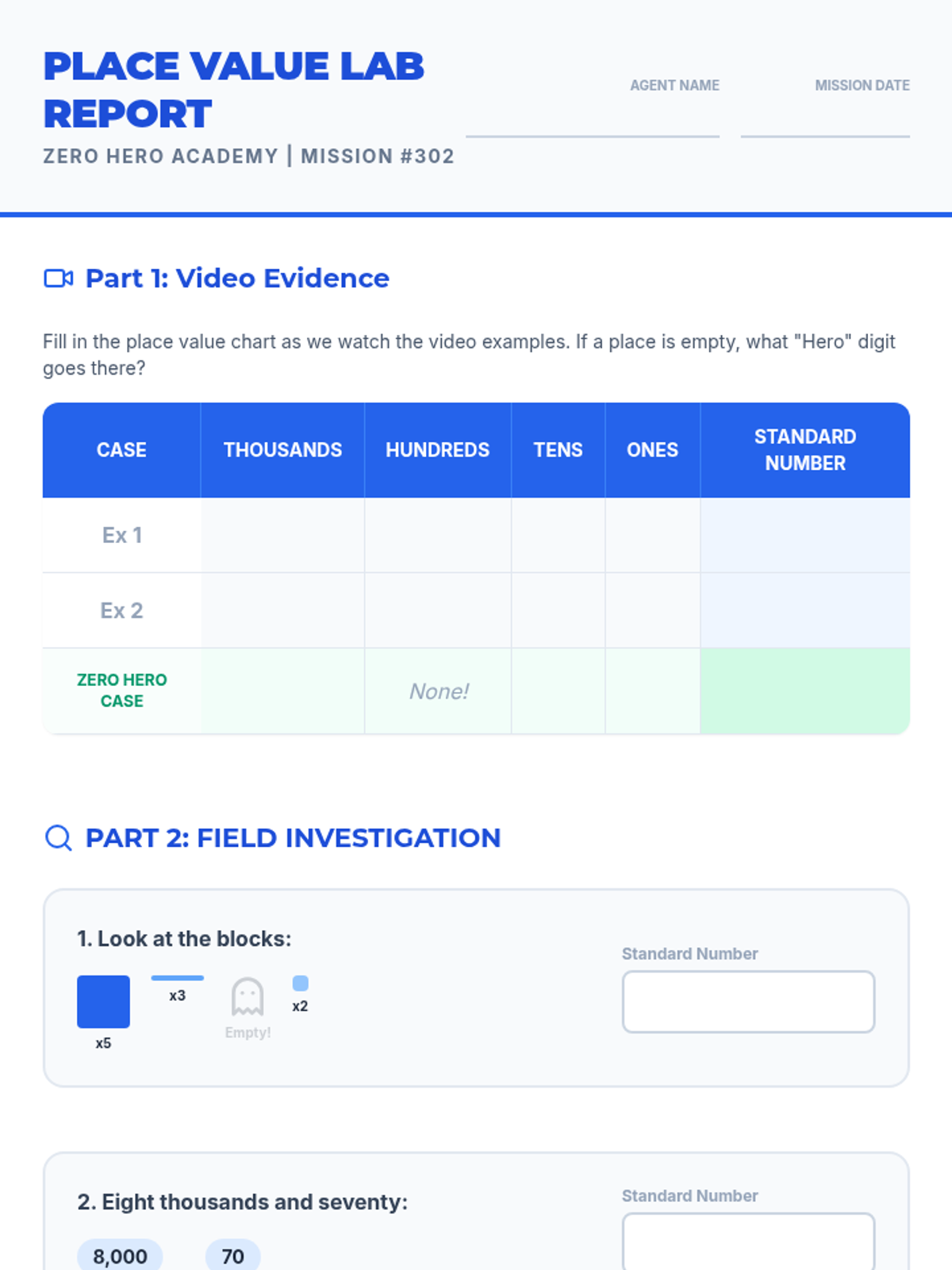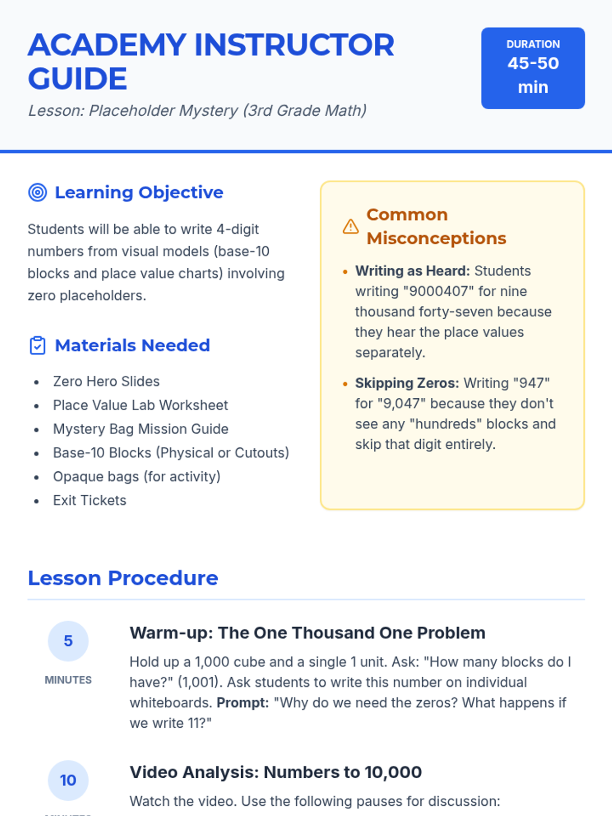 Students will master 4-digit numbers with zero placeholders through visual models, video analysis, and a hands-on 'Mystery Bag' building activity.