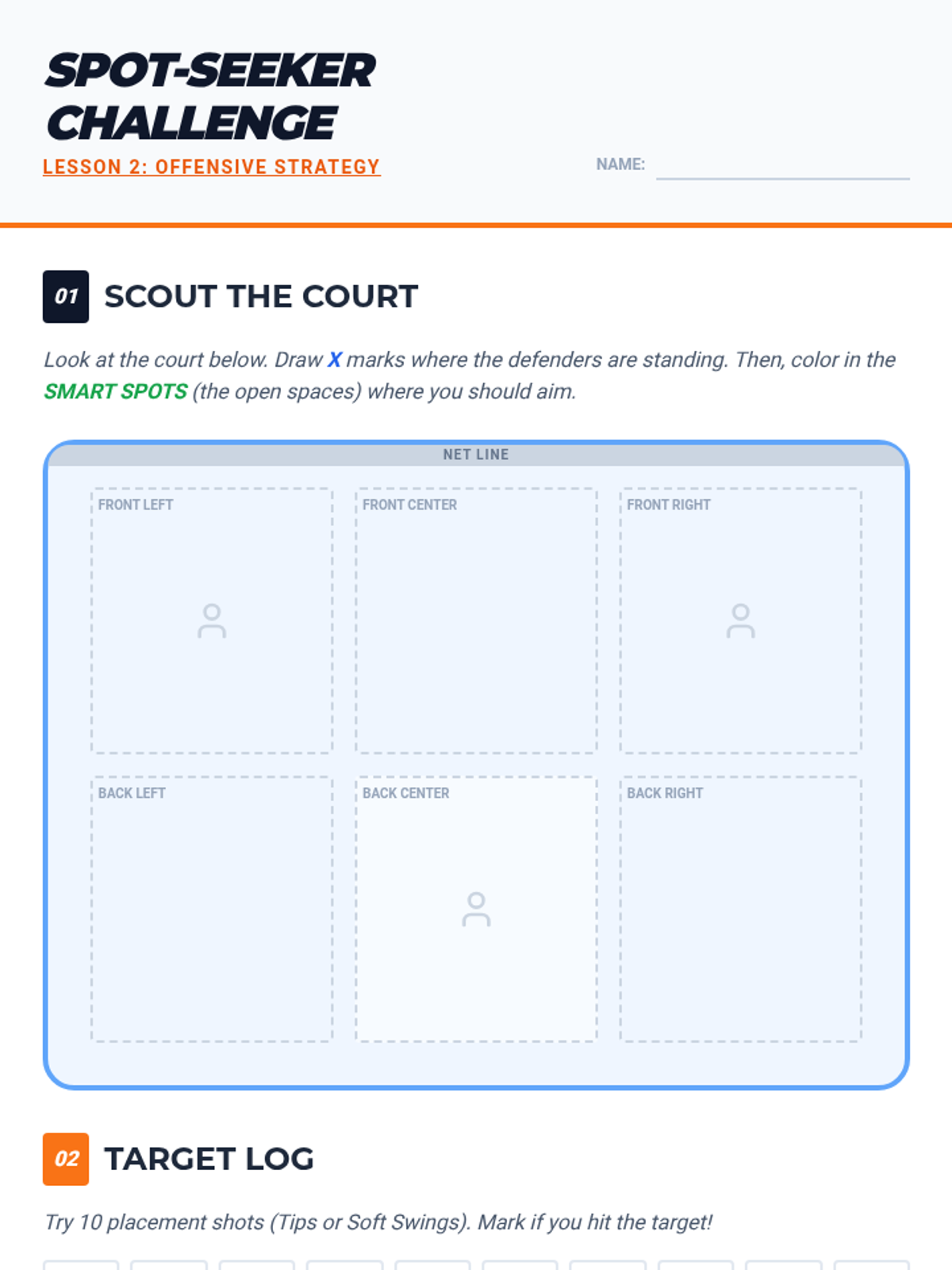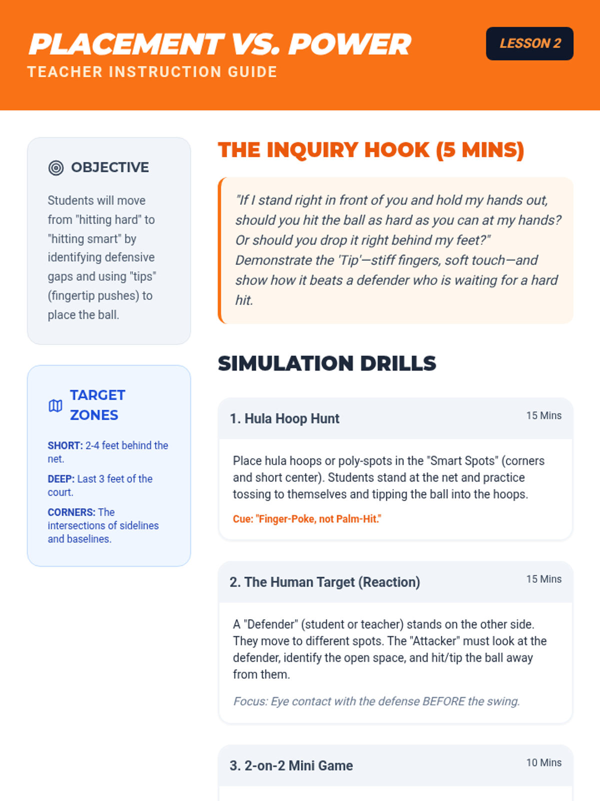 Teaches students to identify open spaces on the court and choose strategic 'tips' or placement over raw power.