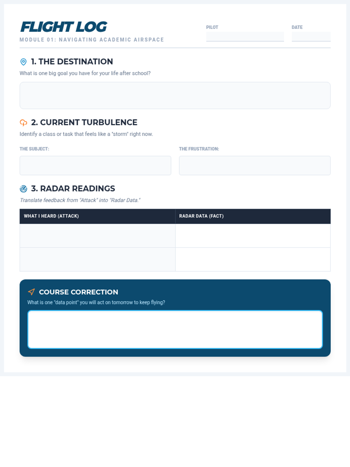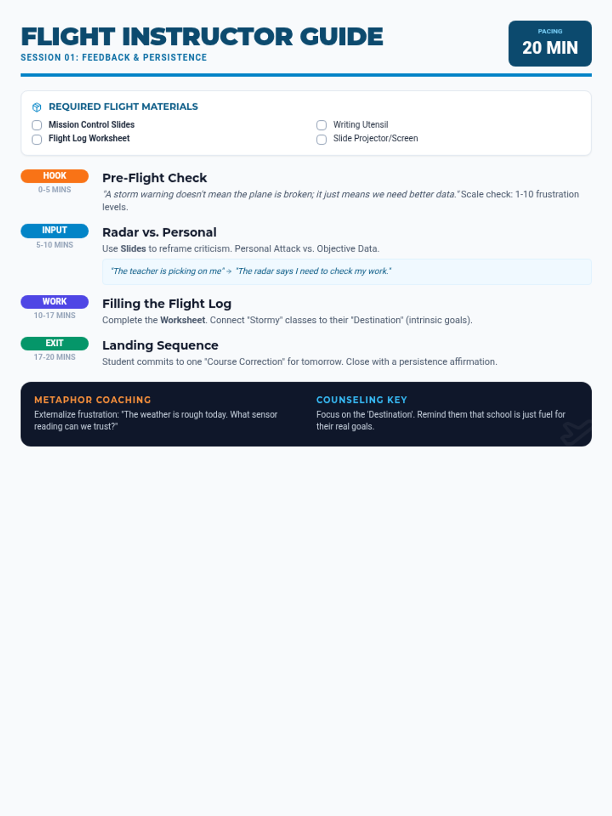 A 20-minute counseling session designed to help students reframe feedback as navigational data, build frustration tolerance, and connect academic tasks to personal goals.