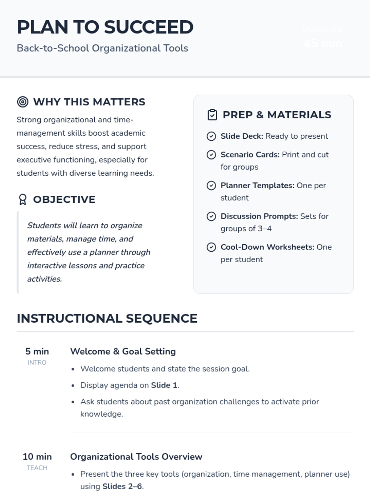 A 45-minute lesson for incoming 9th graders on essential organization, time management, and planner skills to ensure a successful transition to high school.