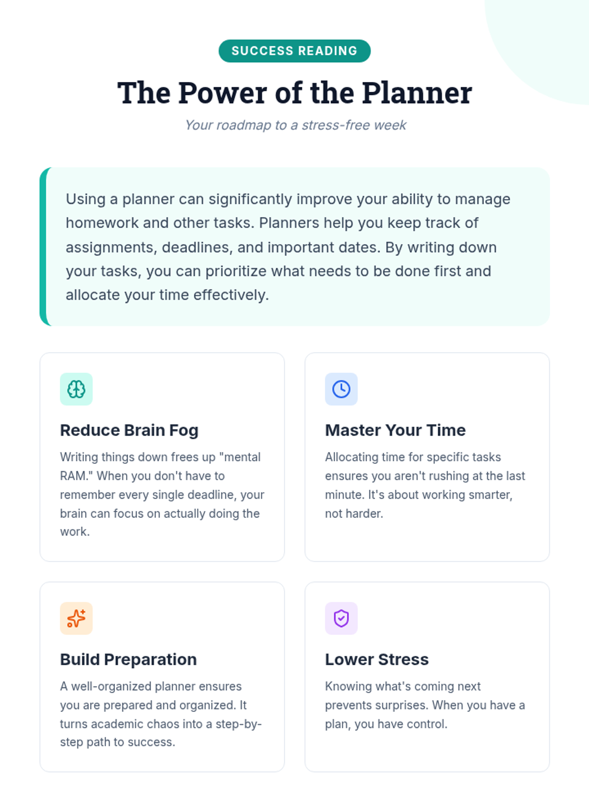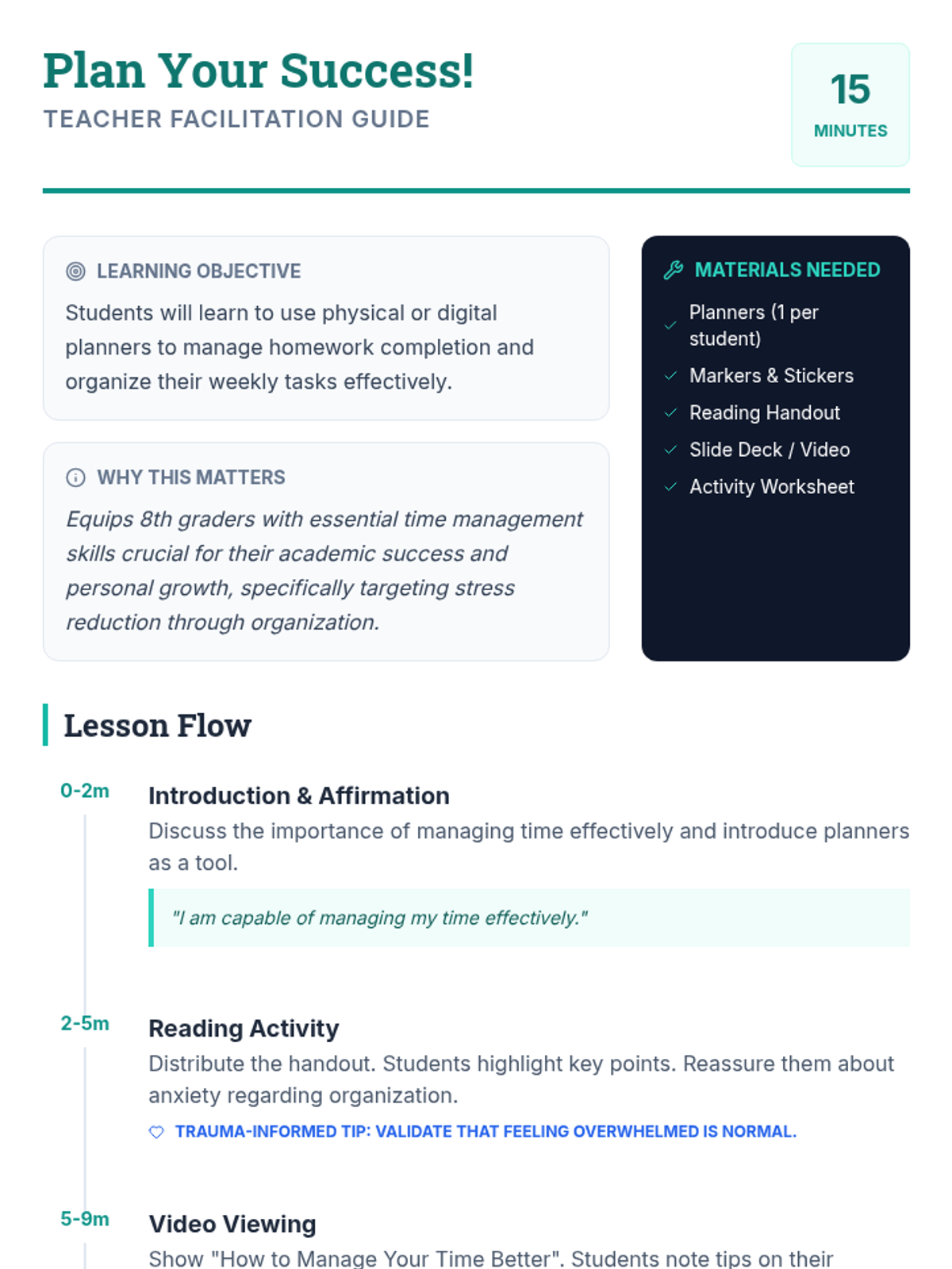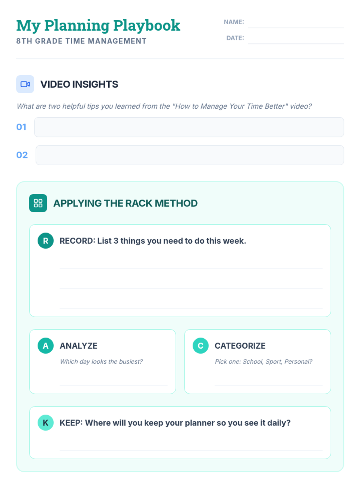This lesson teaches 8th-grade students effective planner use to manage homework and tasks, reducing stress and improving academic performance through the RACK method.