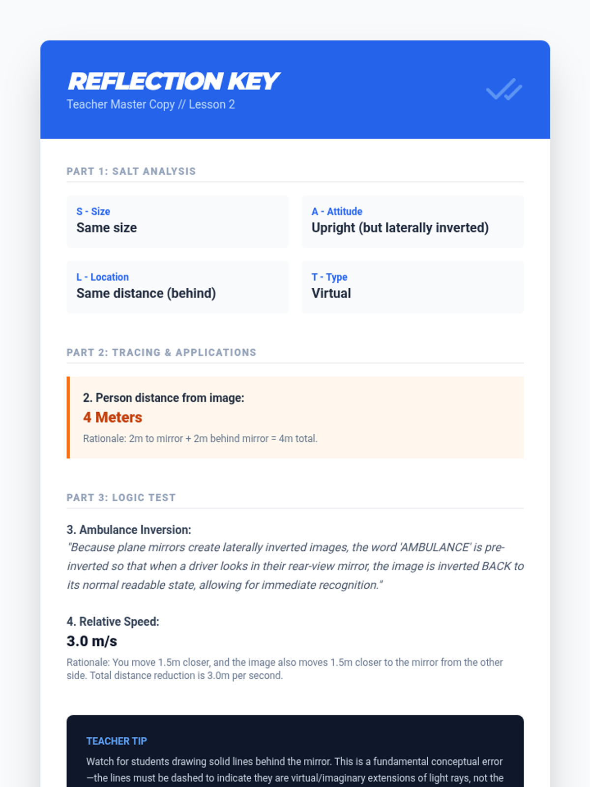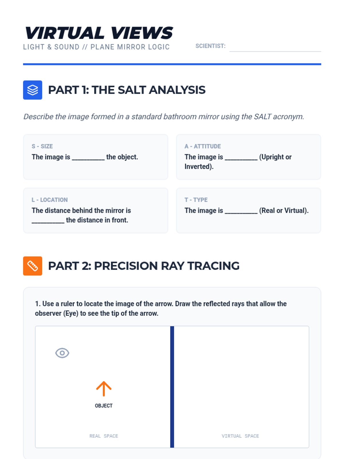Students explore image formation in plane mirrors, identifying the four characteristics of images (S.A.L.T.) and understanding why images appear virtual and laterally inverted.