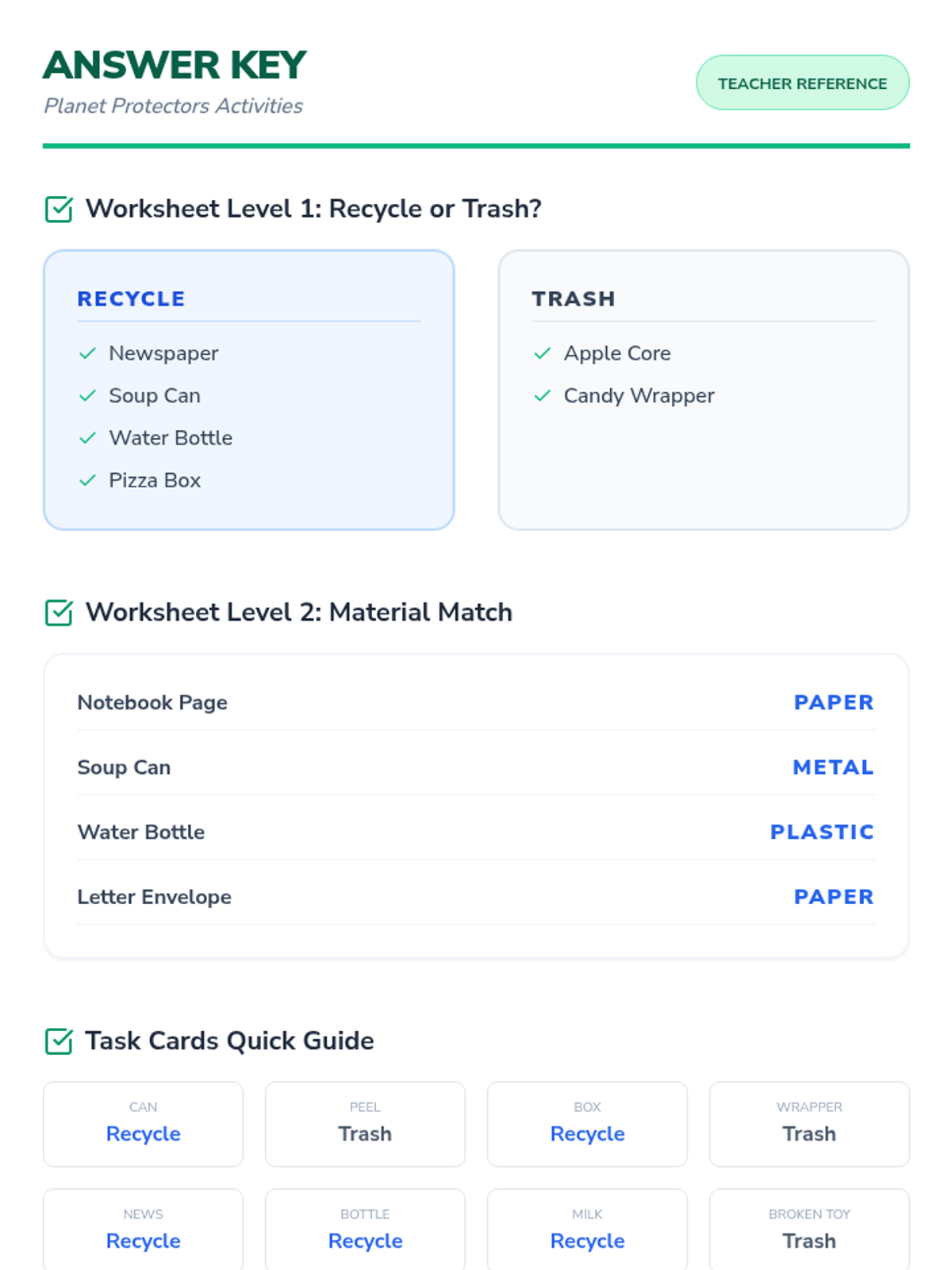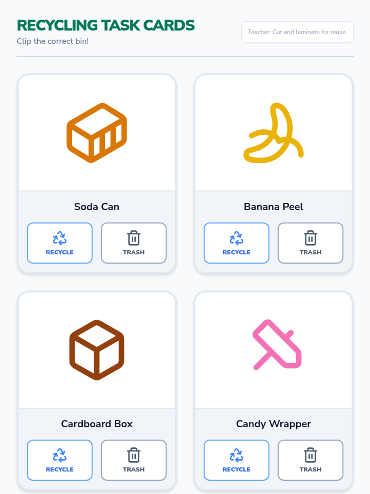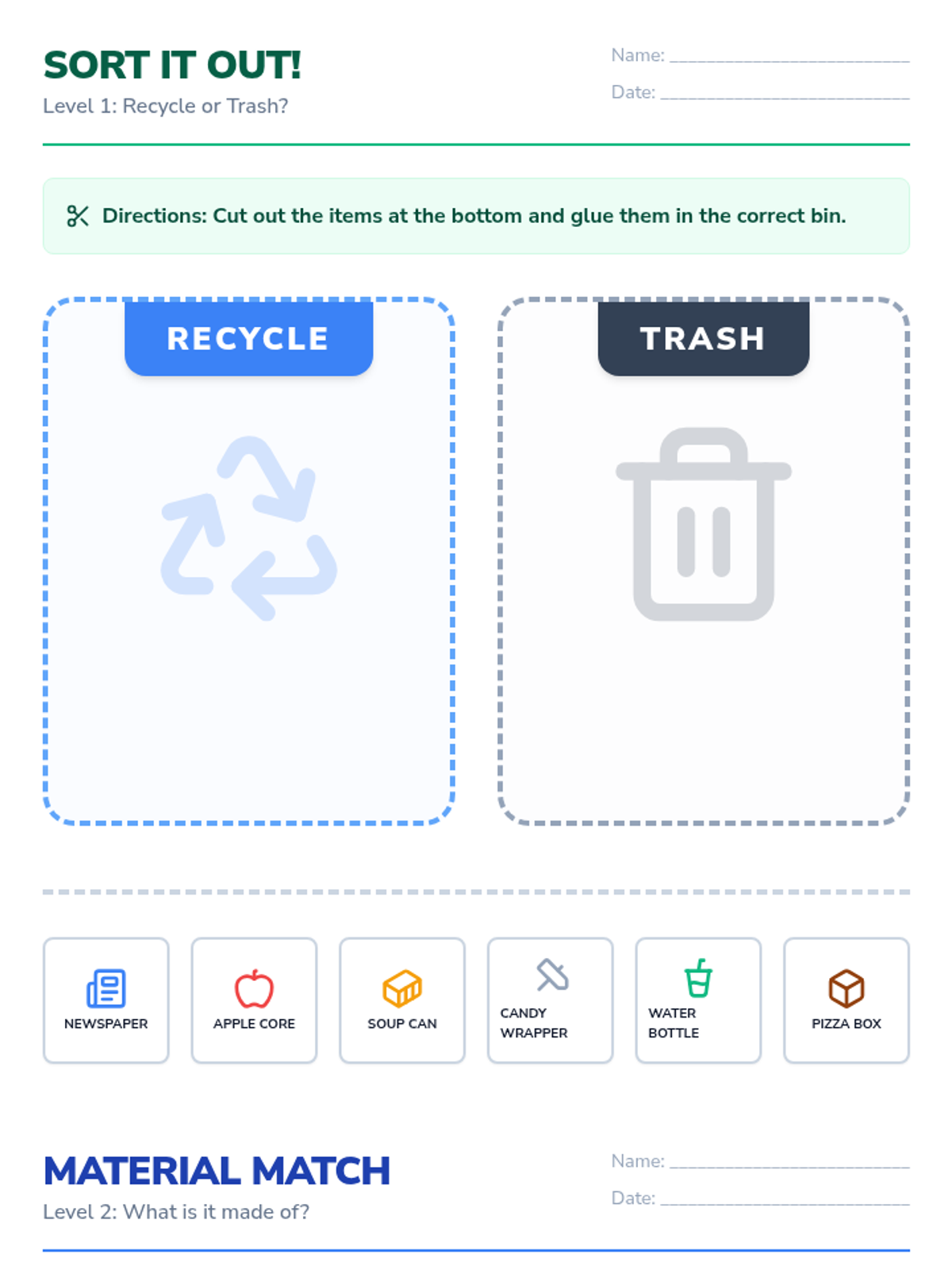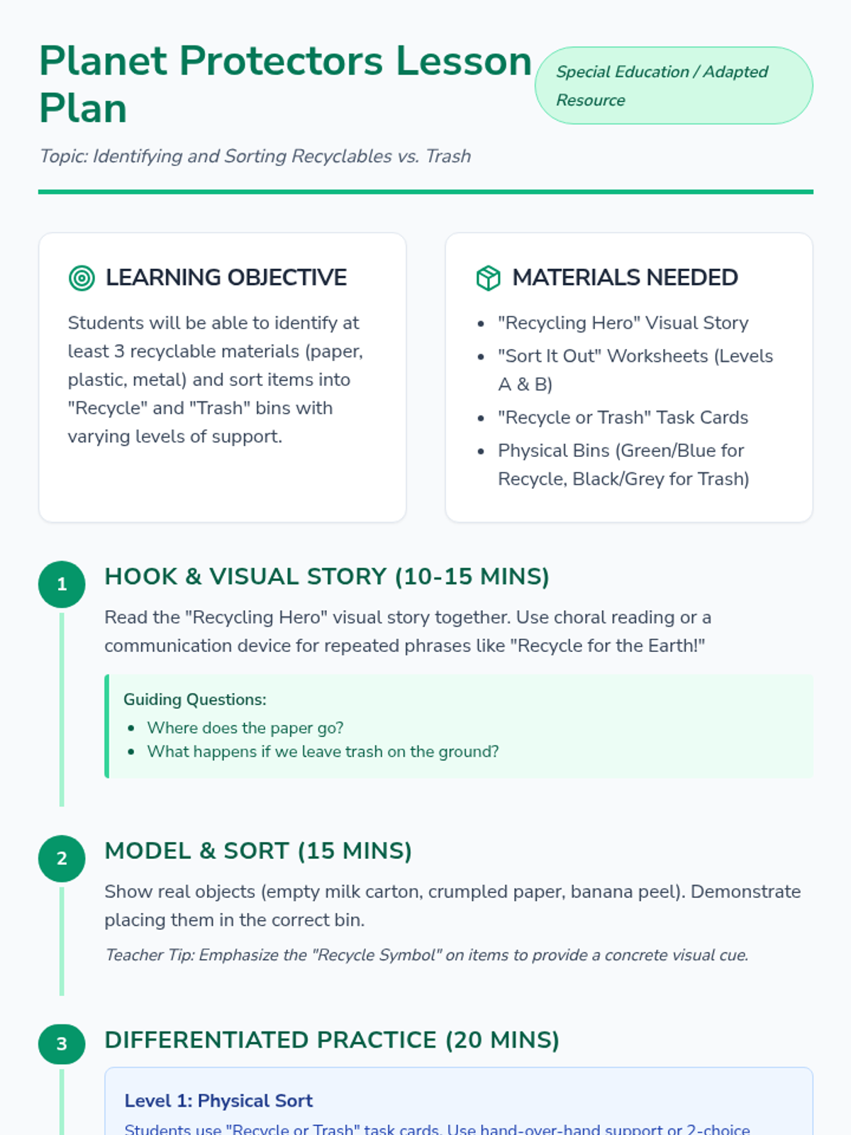 An adapted lesson for special education students focused on identifying and sorting recyclable materials versus trash. Includes a visual story, differentiated sorting activities, and hands-on task cards to build environmental awareness.