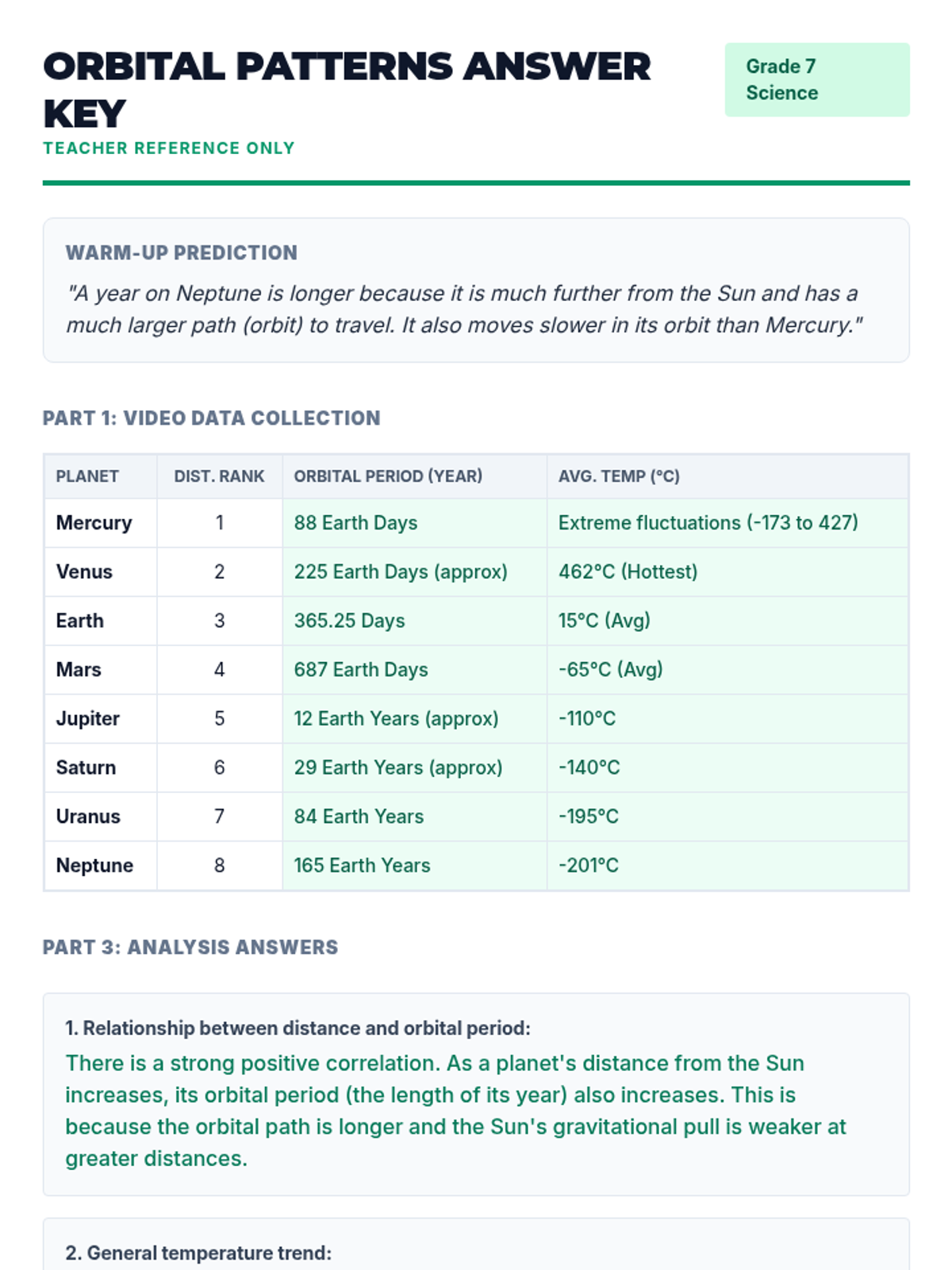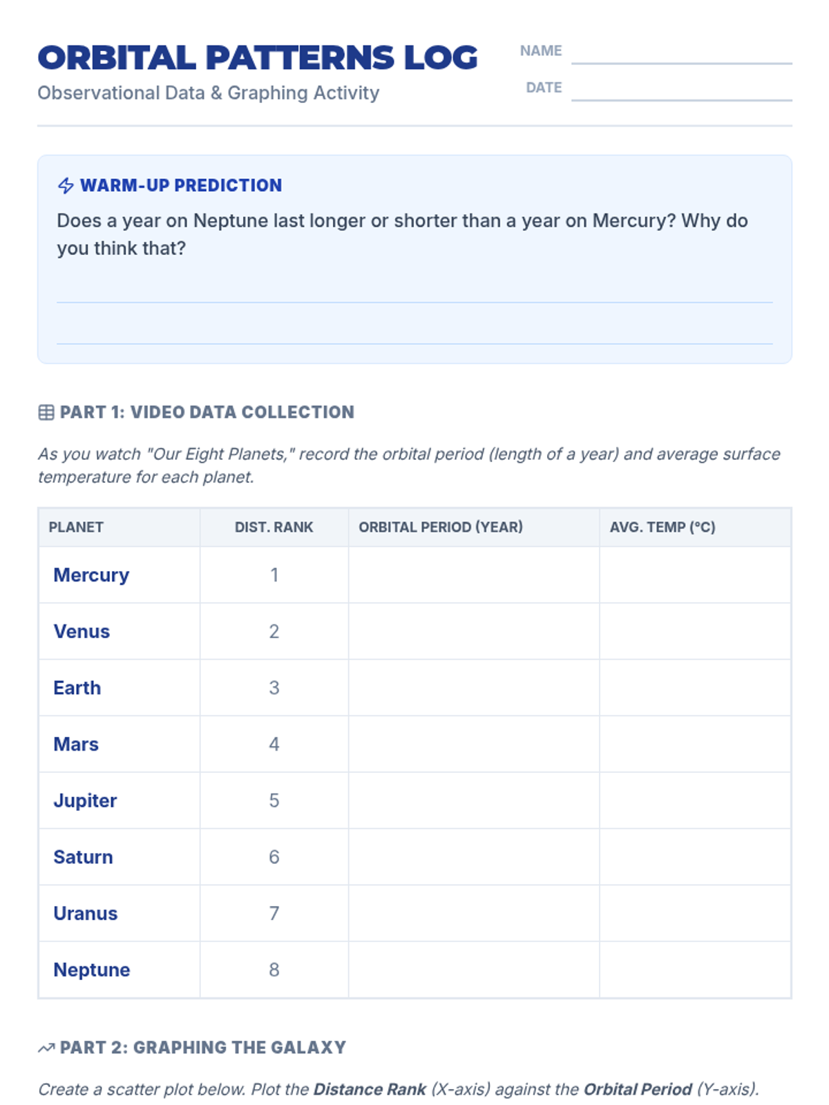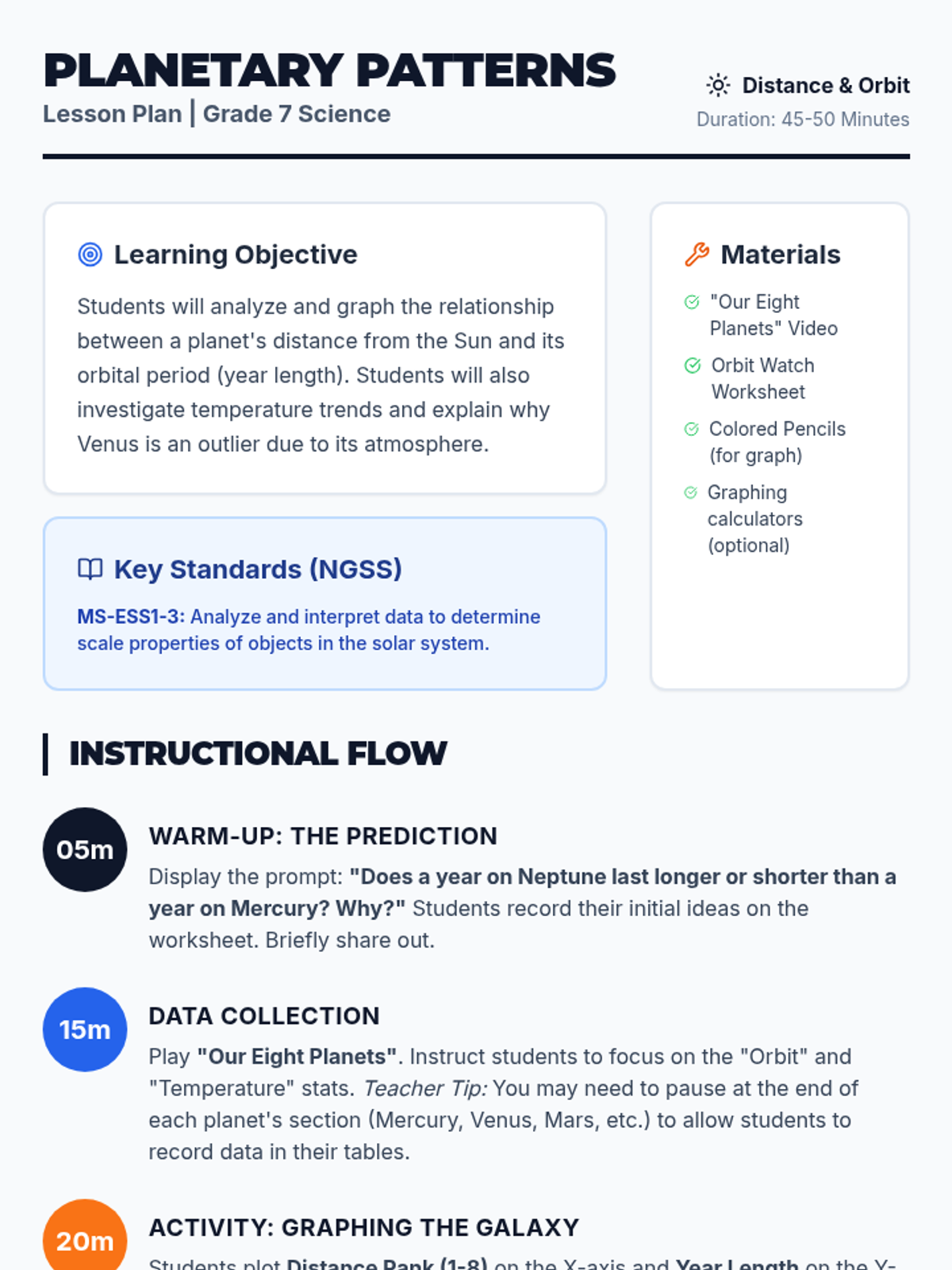 Students explore the relationship between planetary distance from the Sun, orbital period, and temperature using a structured video guide and graphing activity. They identify trends in the solar system and analyze outliers like Venus to understand the greenhouse effect.