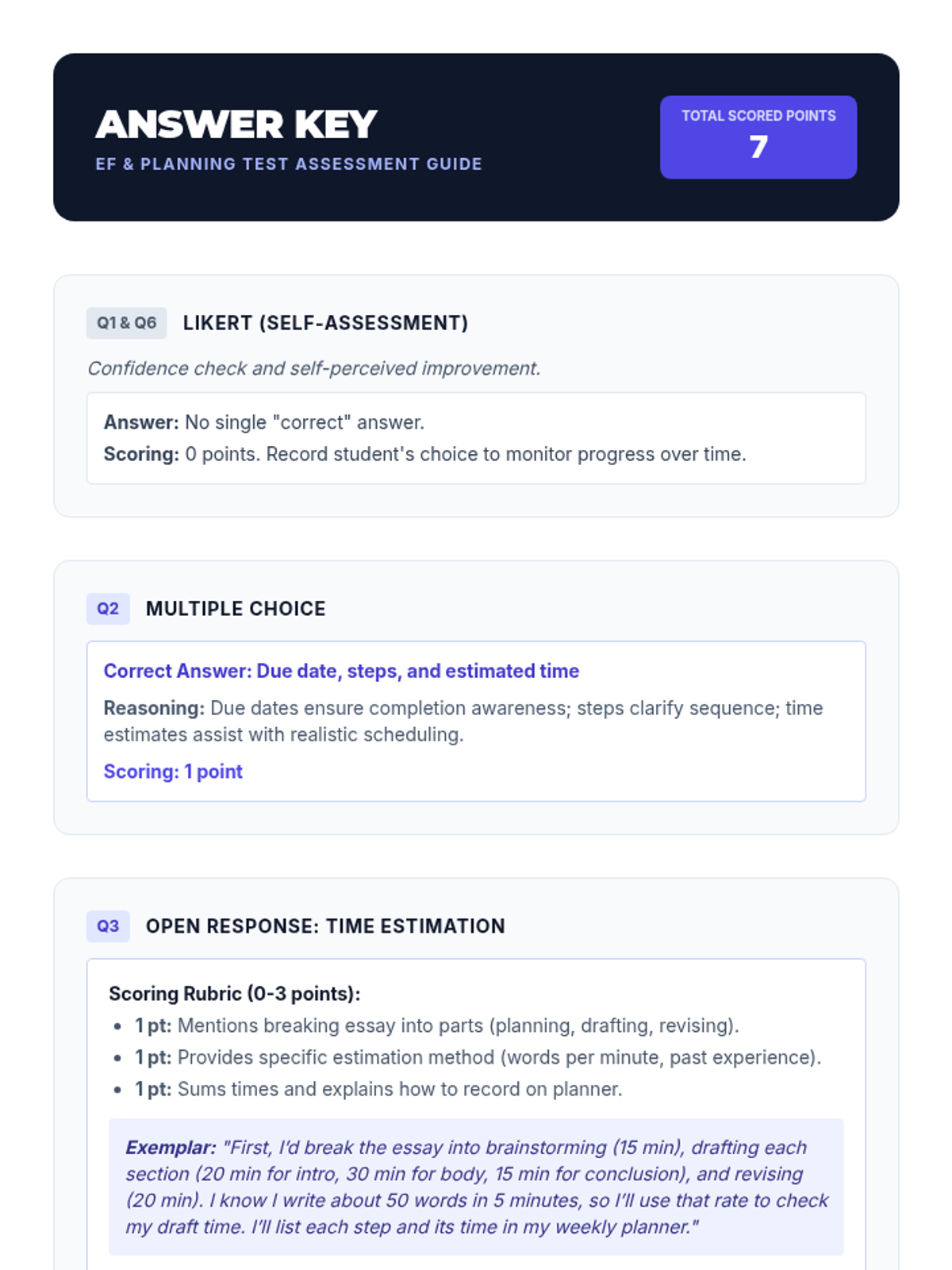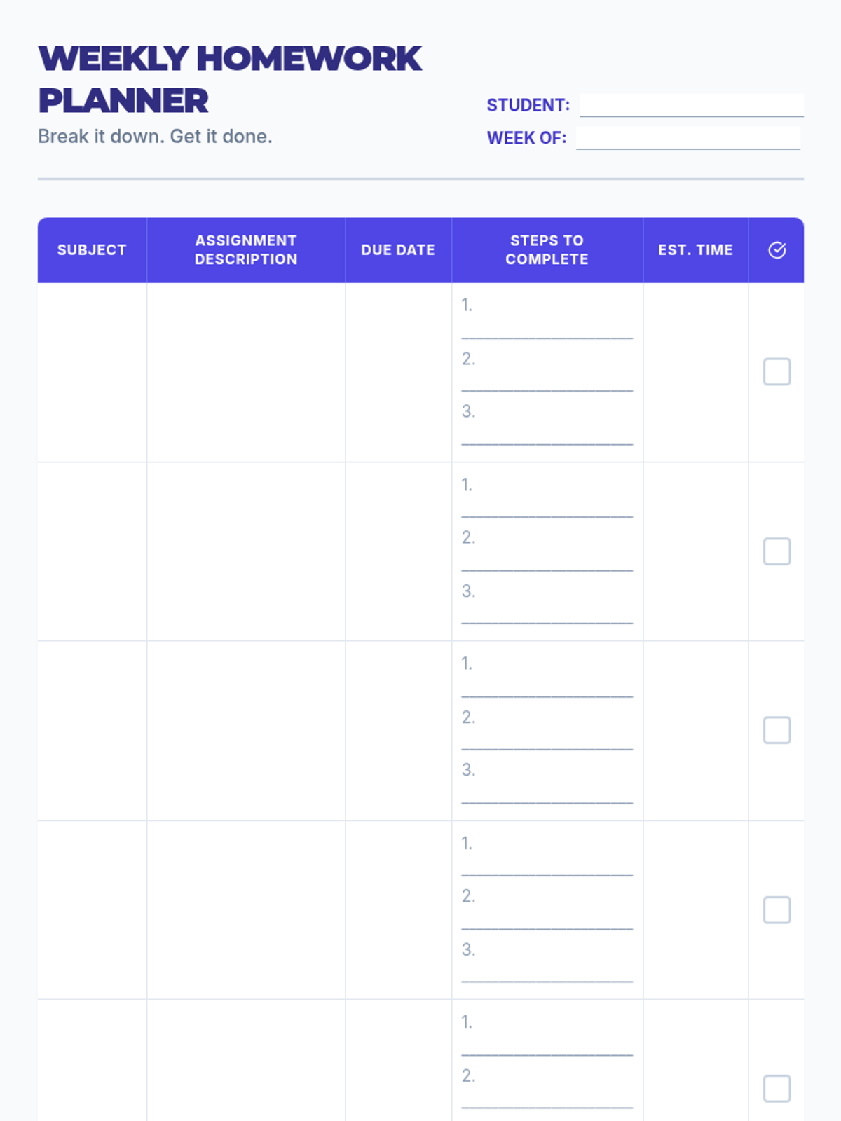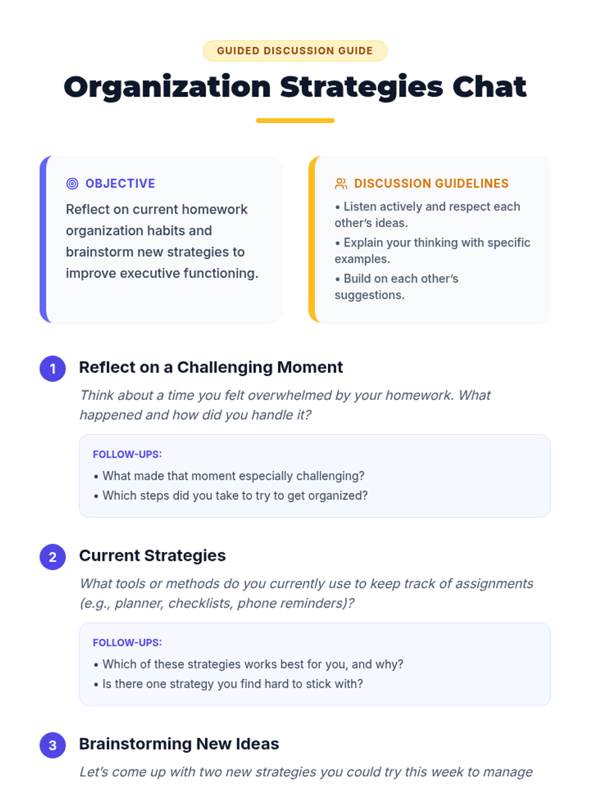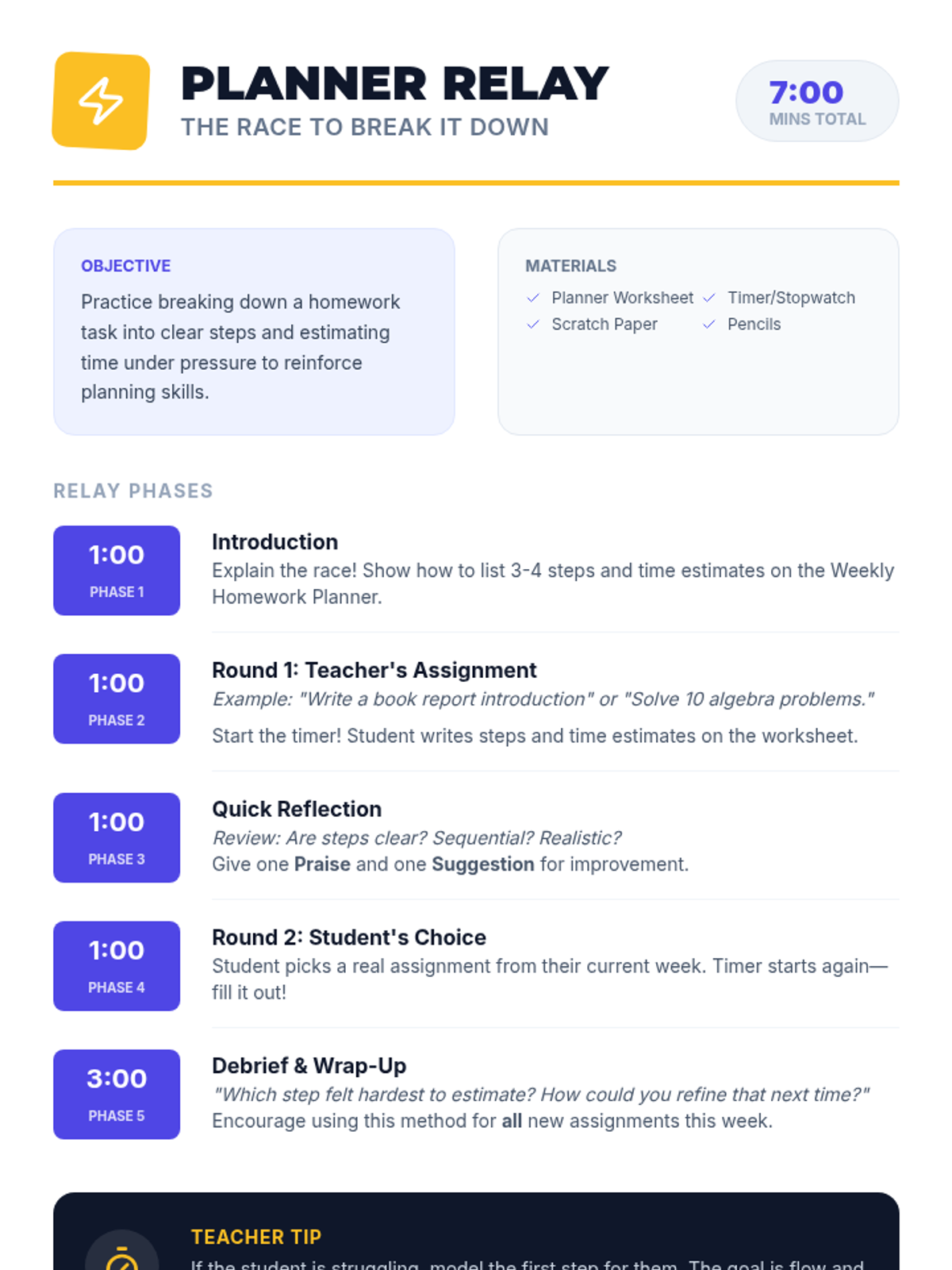 A 20-minute intensive session focused on breaking down complex homework tasks into manageable steps and accurate time estimation.