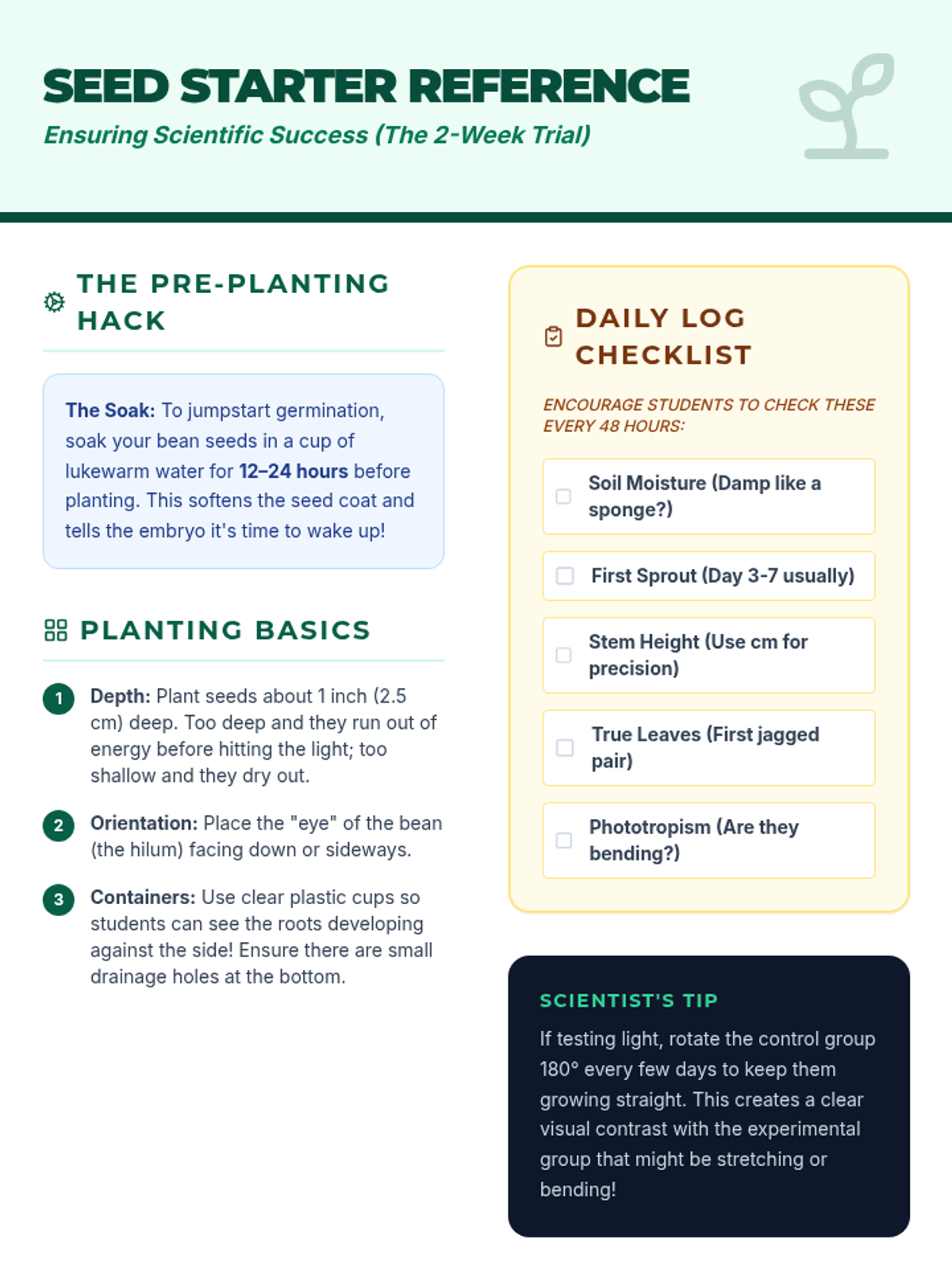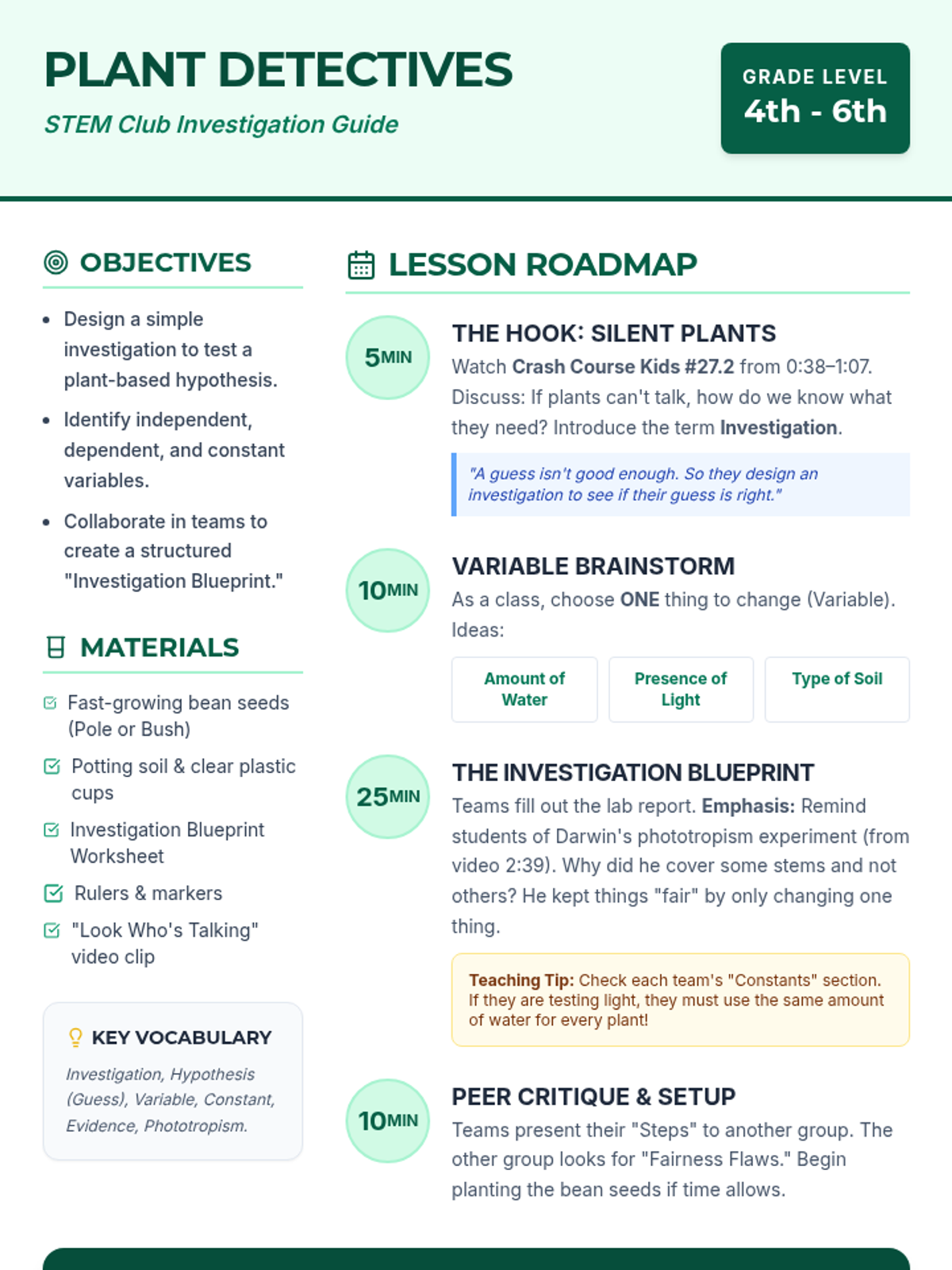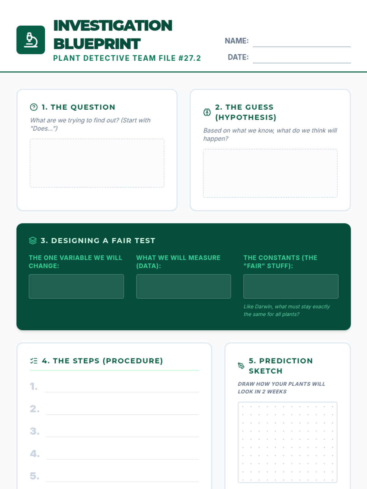 A STEM investigation lesson where students design experiments using fast-growing bean seeds, inspired by Charles Darwin's plant studies. Students move from asking big questions to creating structured 'Investigation Blueprints' that emphasize variables and fair testing.