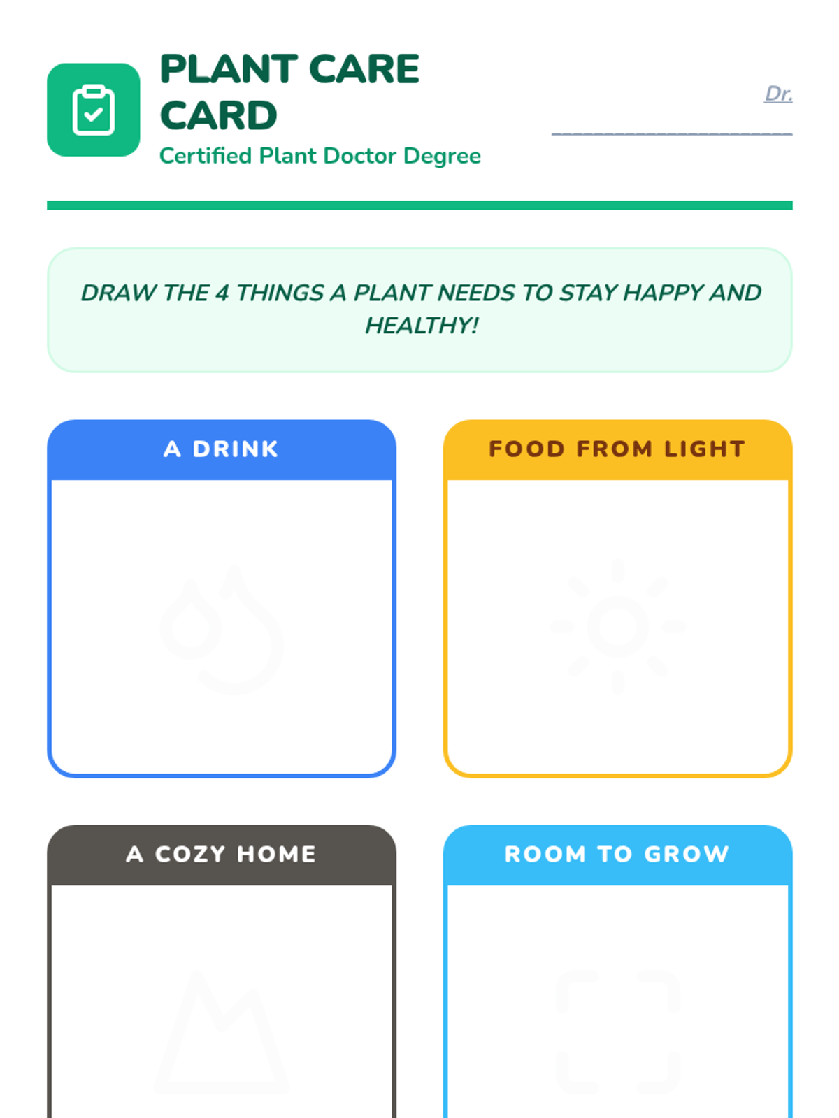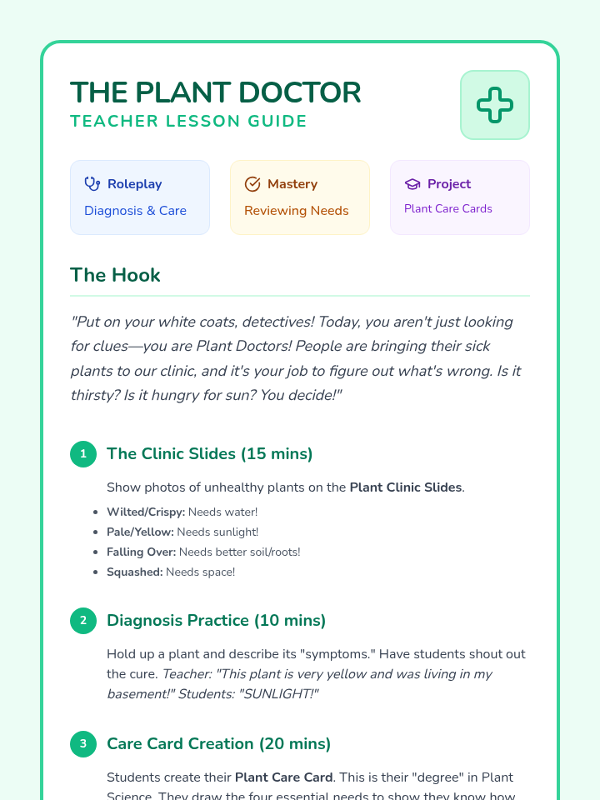 Students apply their knowledge to diagnose 'sick' plants and create a care guide for keeping plants healthy, demonstrating mastery of essential plant needs.