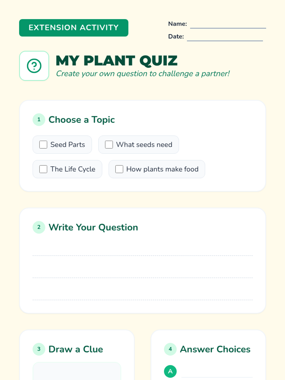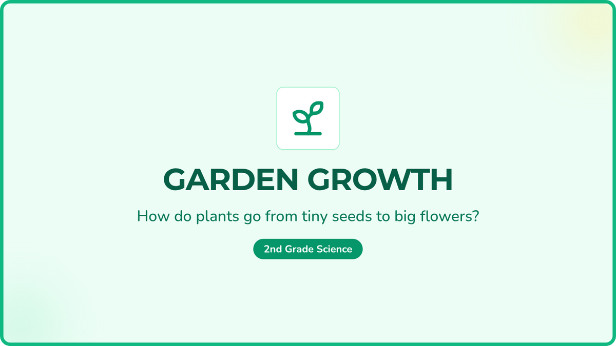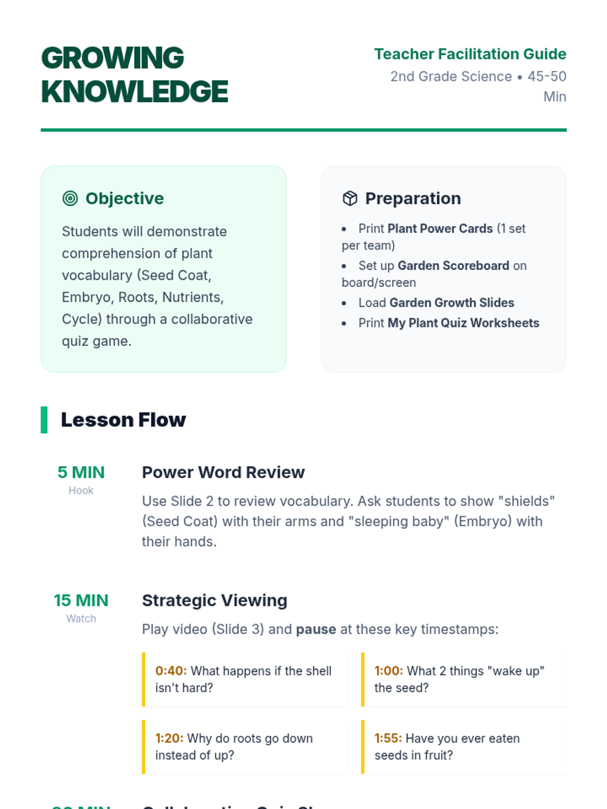 A collaborative lesson for 2nd graders focused on plant vocabulary and growth cycles through an interactive video quiz game. Students learn about seed parts, germination, and photosynthesis before competing in teams to answer quiz questions.