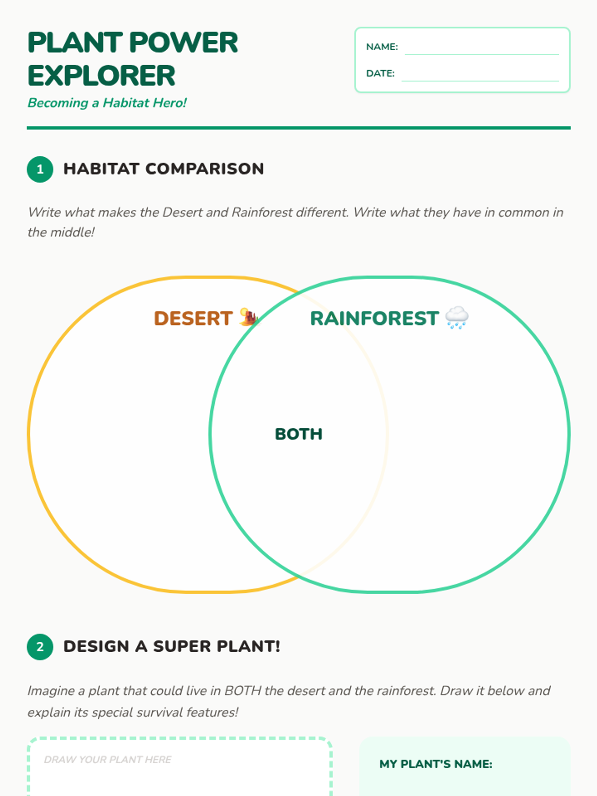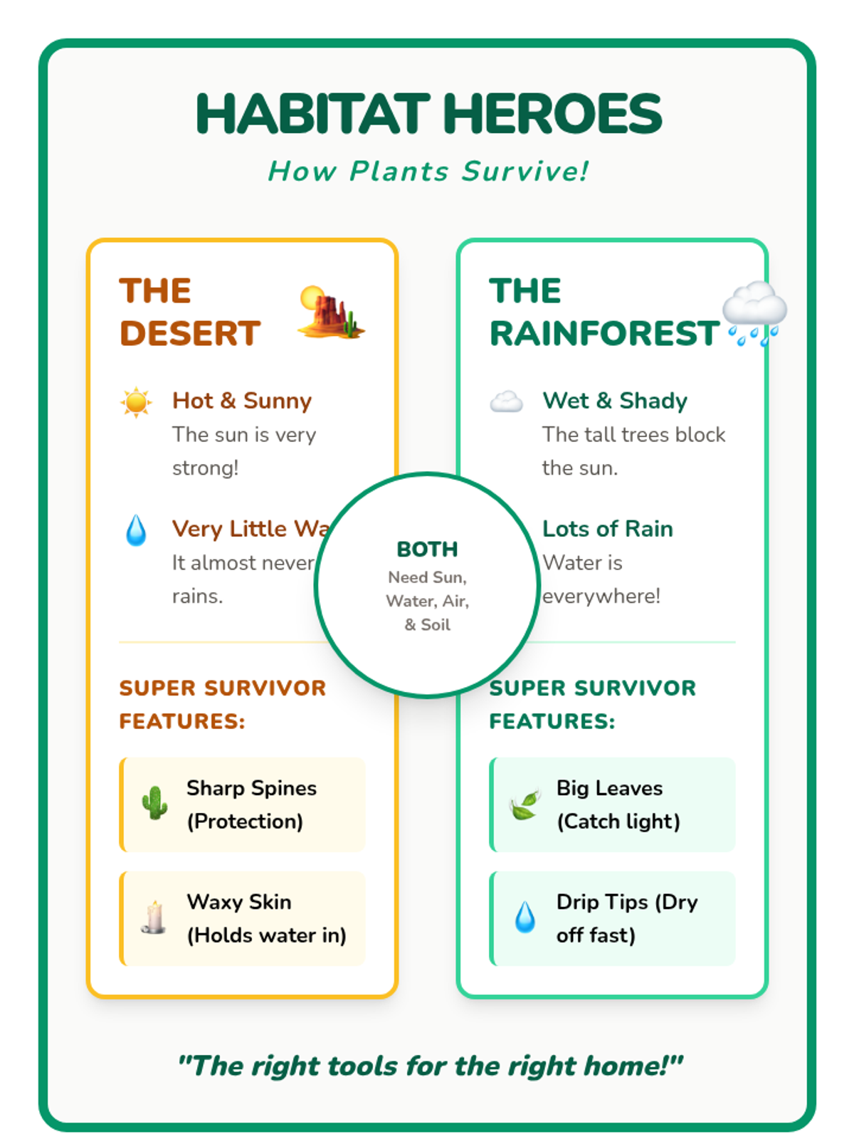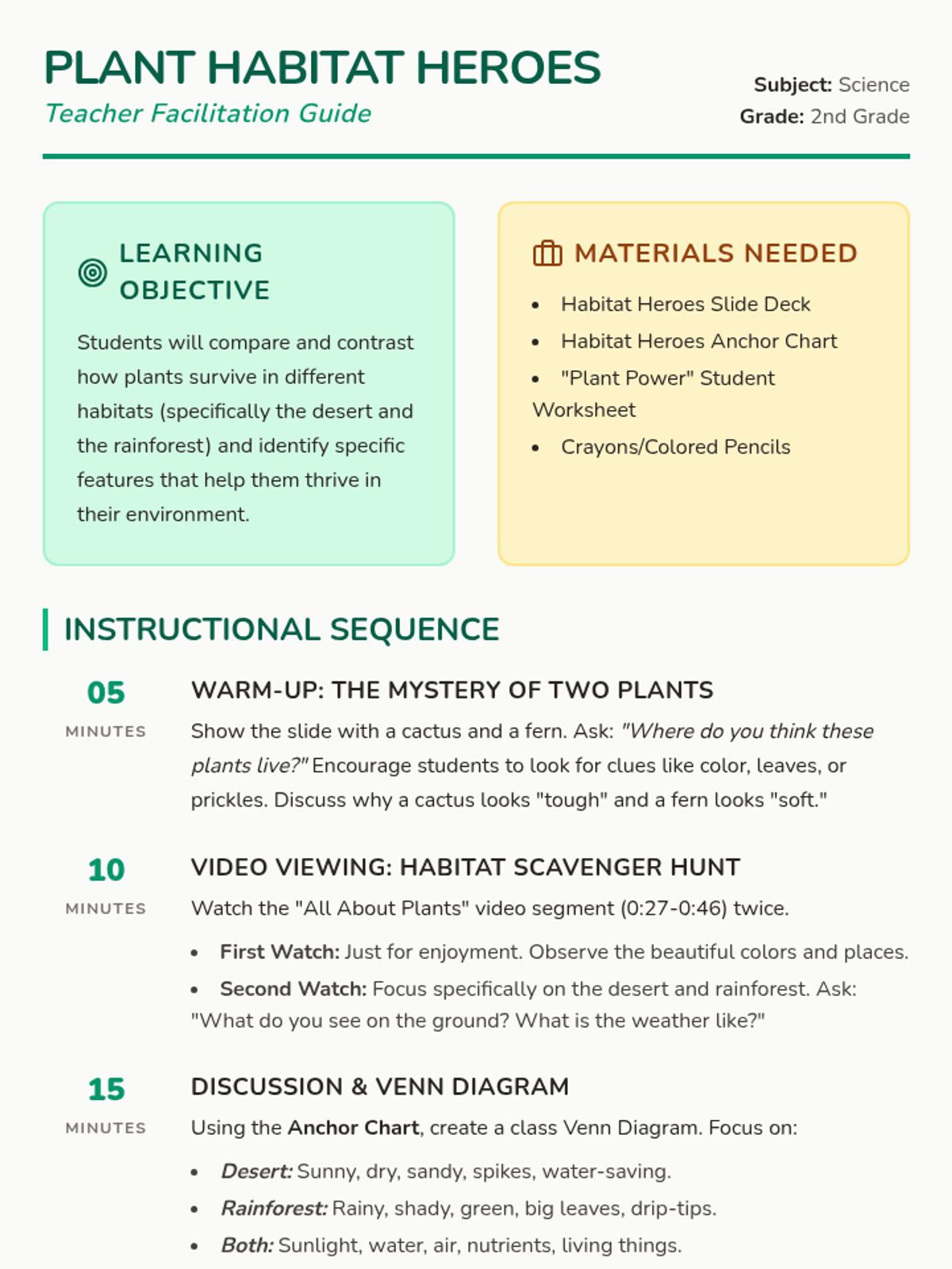 A 2nd-grade science lesson where students compare and contrast plant survival in the desert and the rainforest using video analysis, discussion, and creative design.