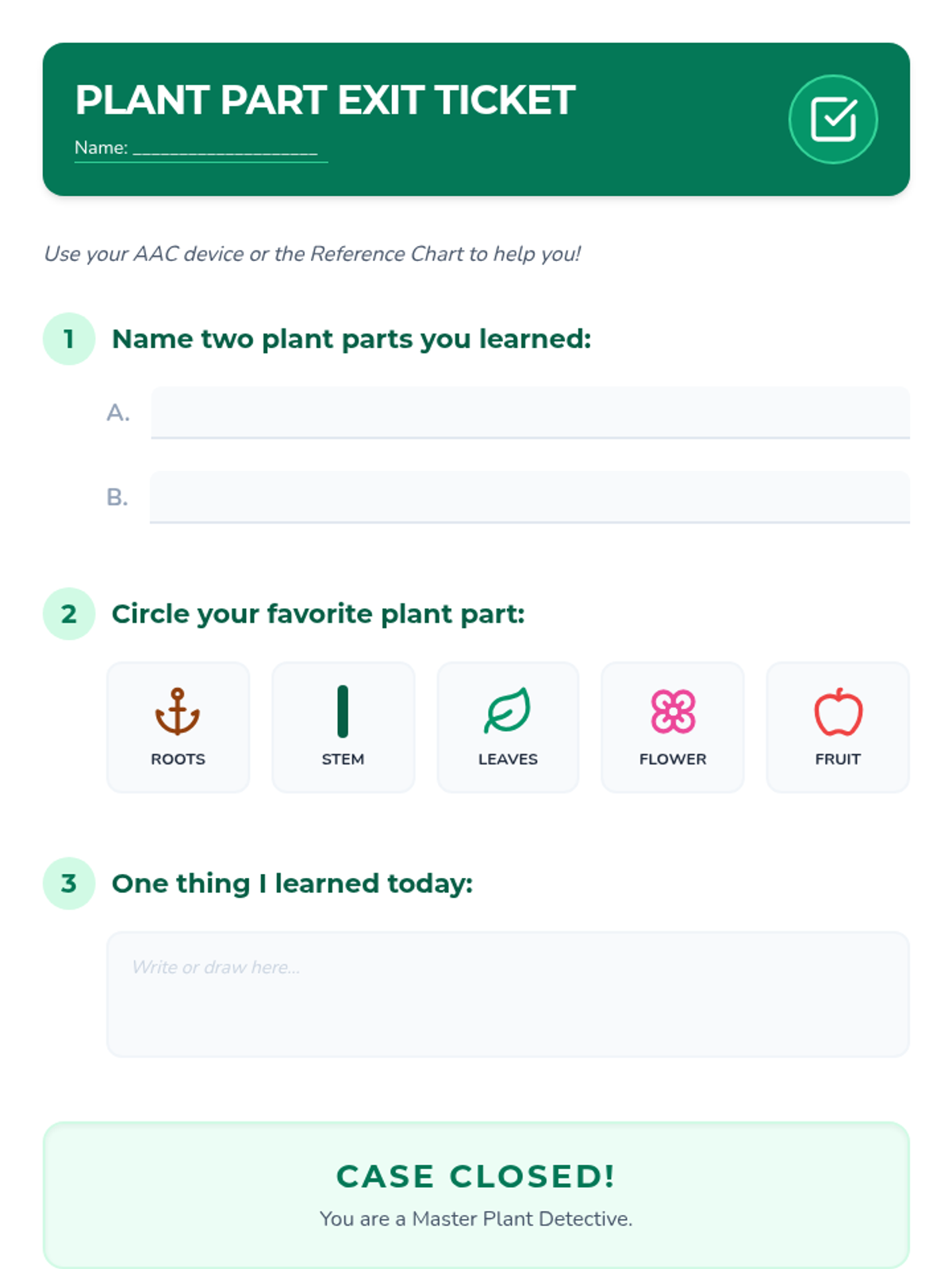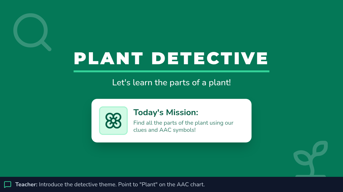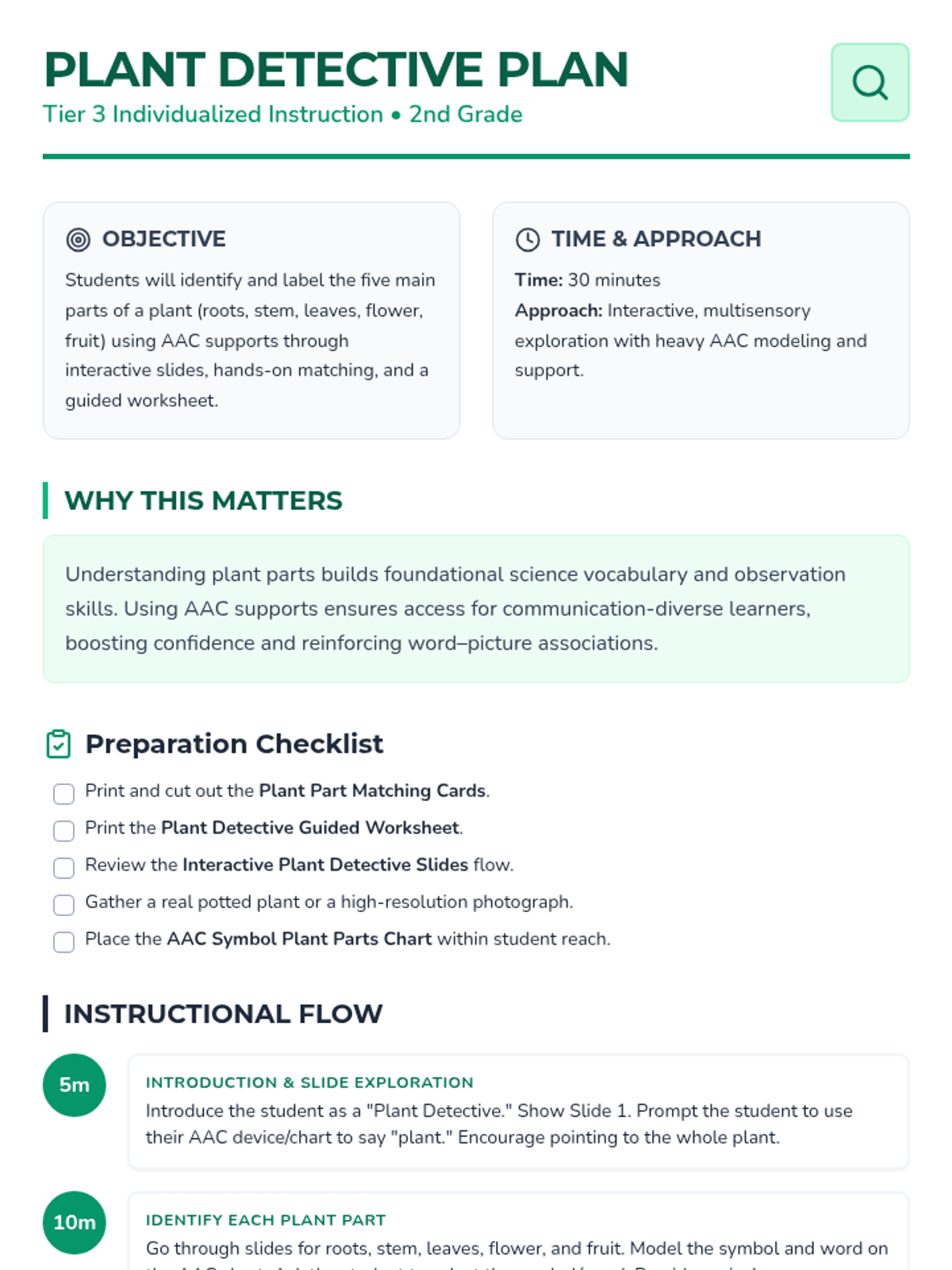 A 30-minute individualized Tier 3 lesson for 2nd-grade AAC users to identify and label plant parts (roots, stem, leaves, flower, fruit) using visual supports and hands-on matching.