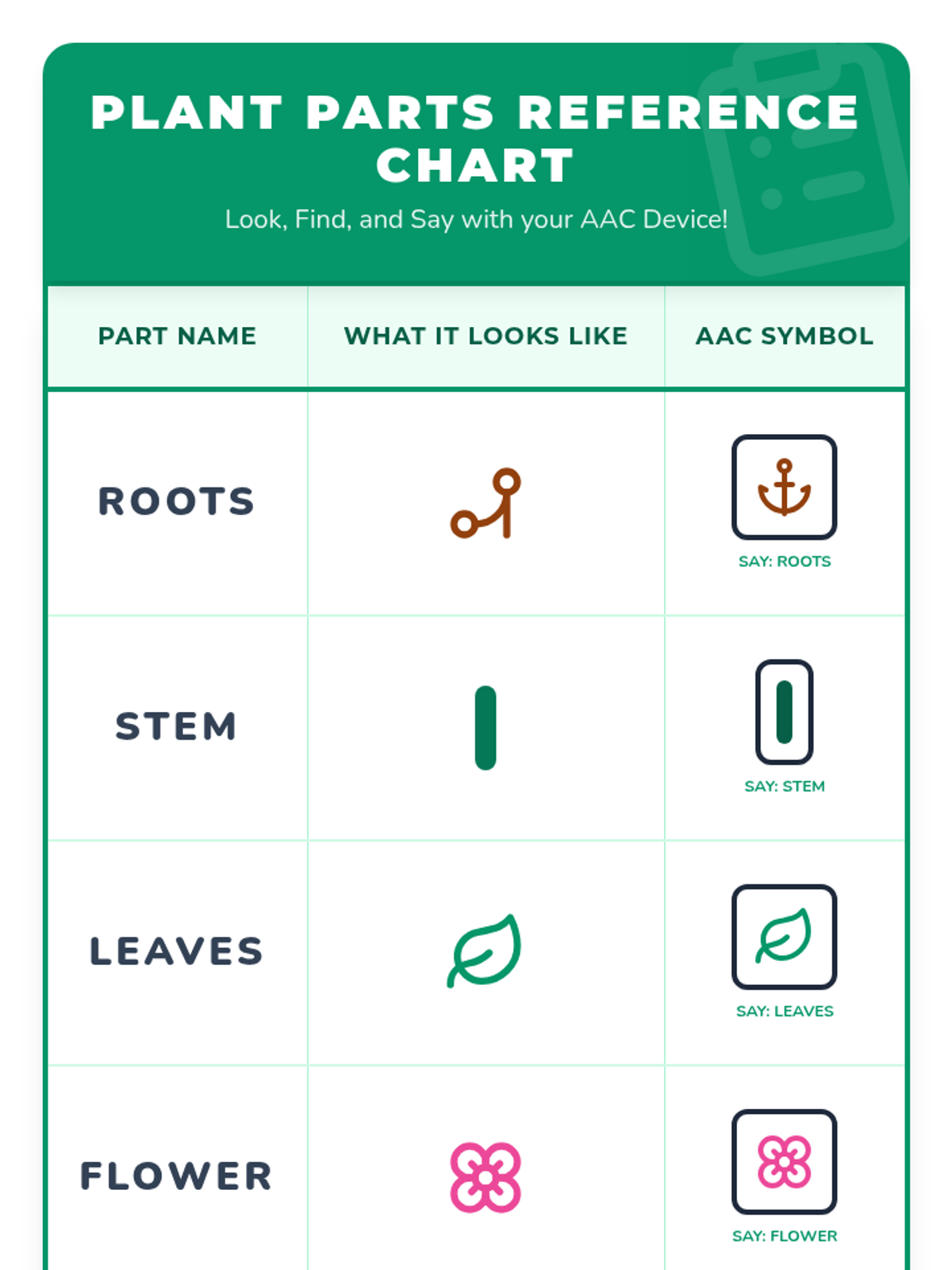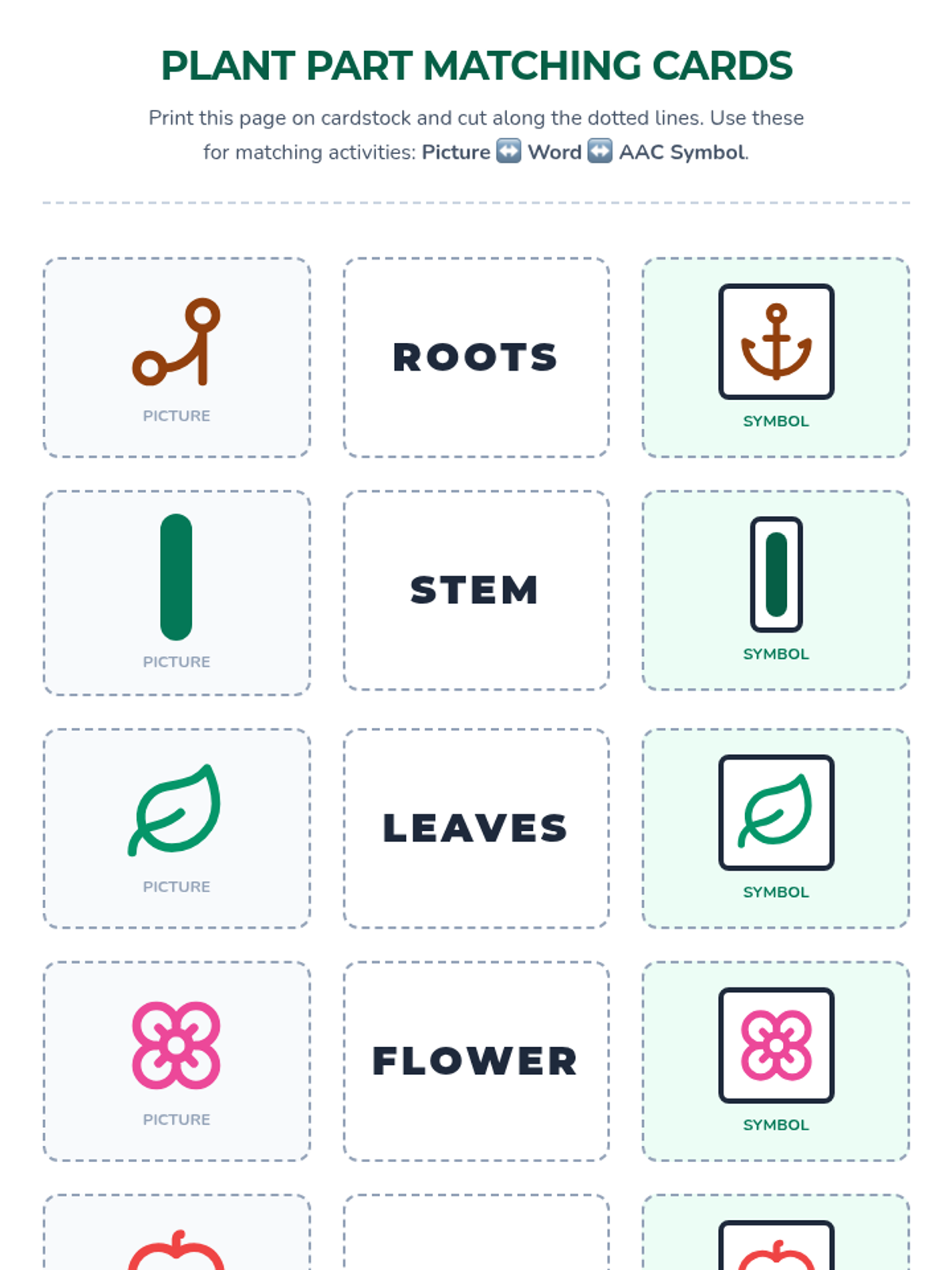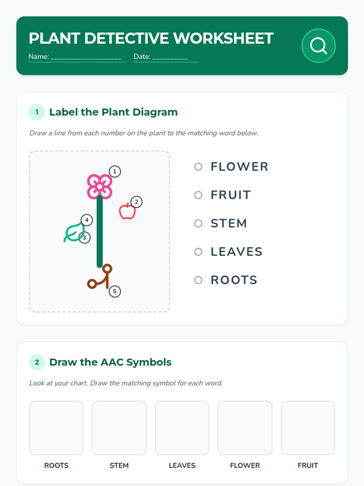 A 30-minute individualized Tier 3 lesson for 2nd-grade AAC users to identify and label plant parts (roots, stem, leaves, flower, fruit) using visual supports and hands-on matching.