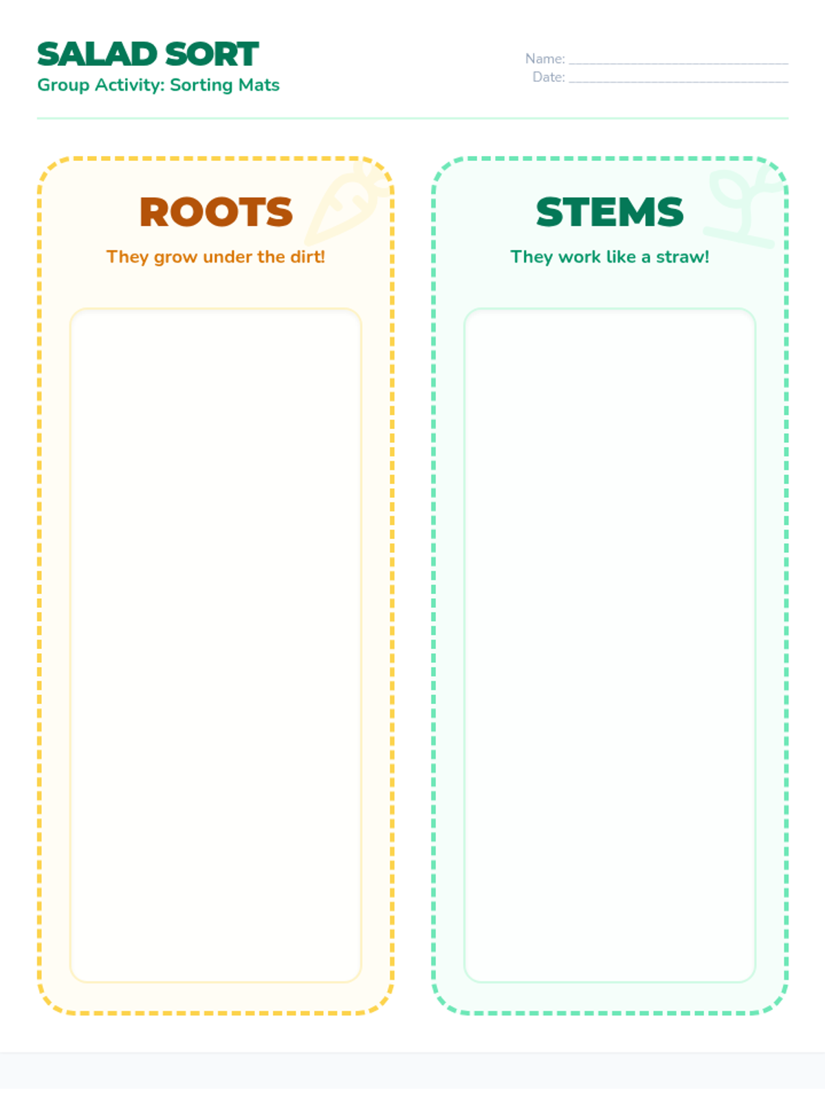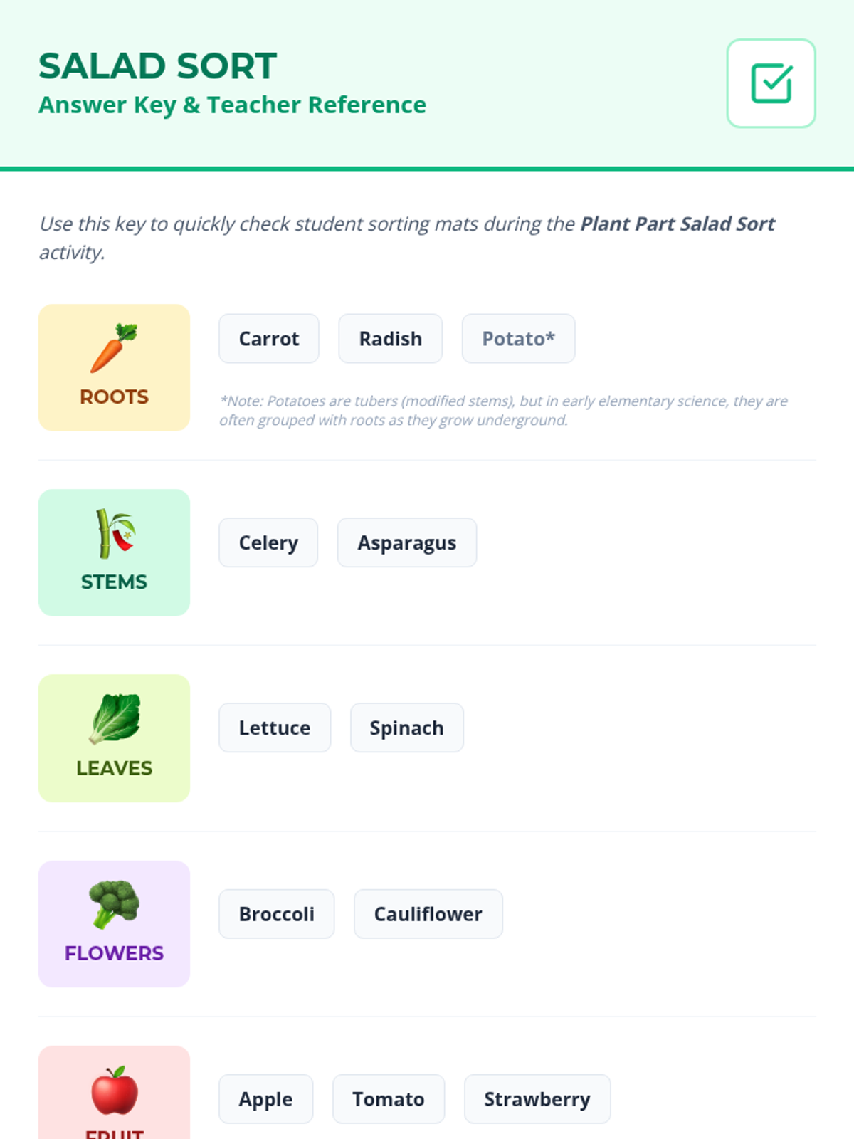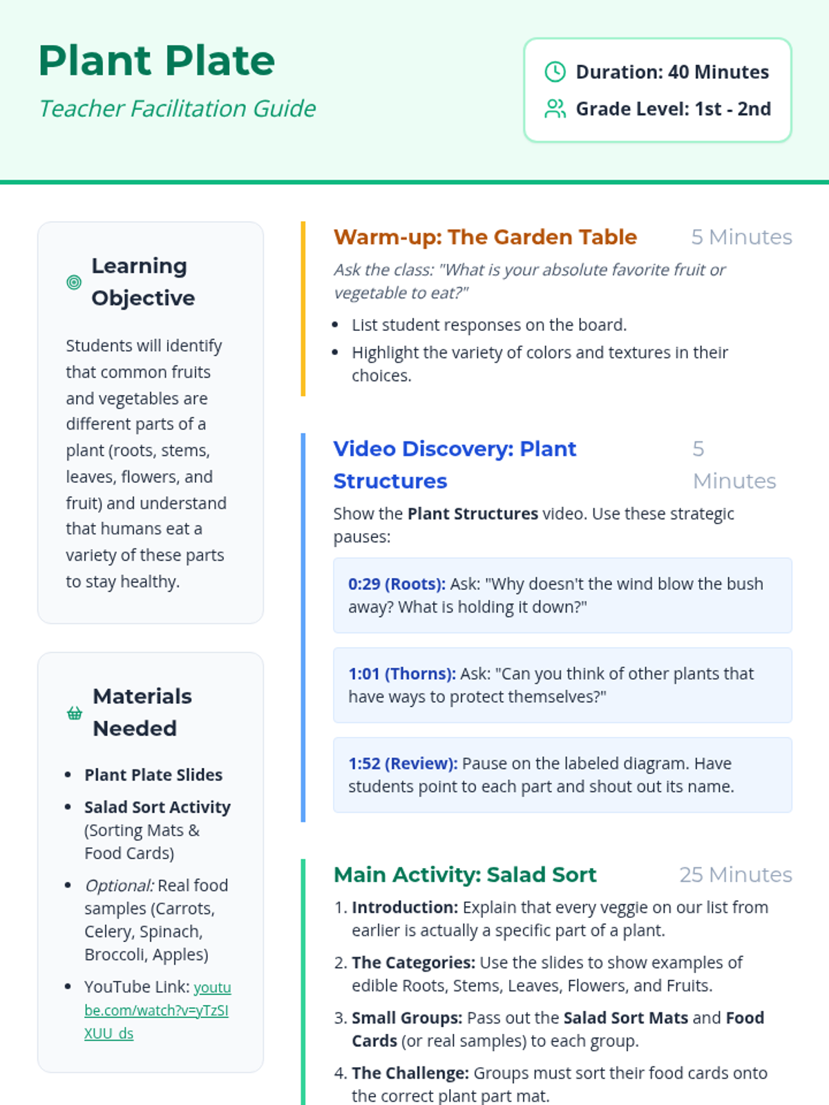 A hands-on science lesson for 1st and 2nd graders to explore the different parts of plants we eat, featuring a video on plant structures and a 'Plant Part Salad Sort' activity.
