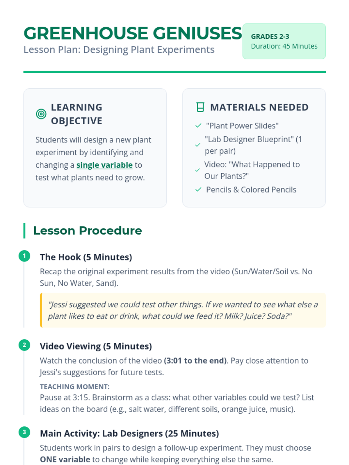 Students explore the scientific method by designing their own plant growth experiments, focusing on the concept of changing a single variable. This lesson builds on the results of the SciShow Kids 'What Happened to Our Plants?' experiment.