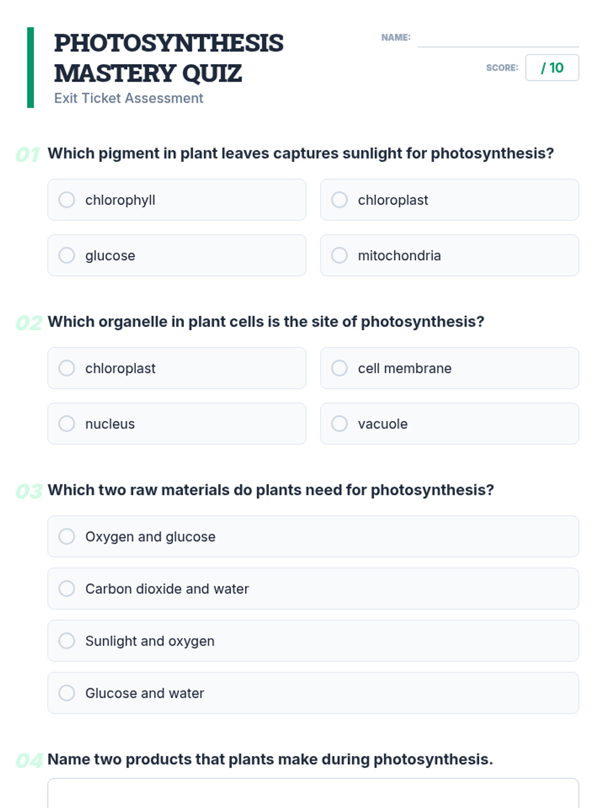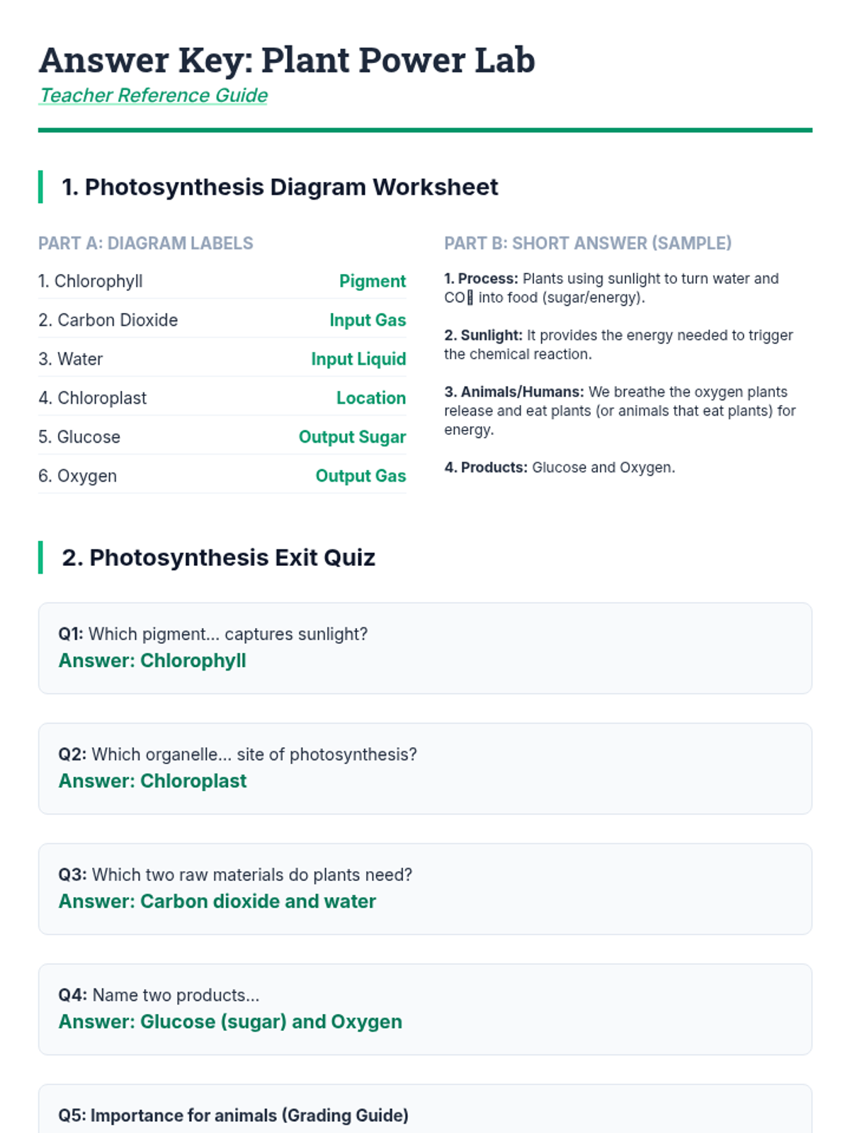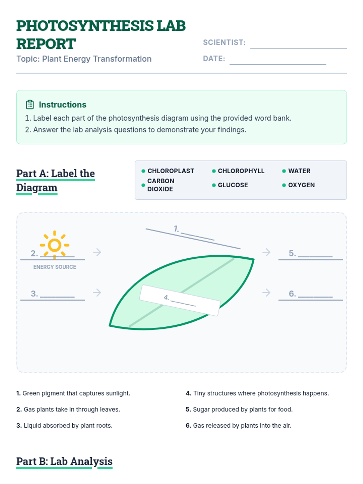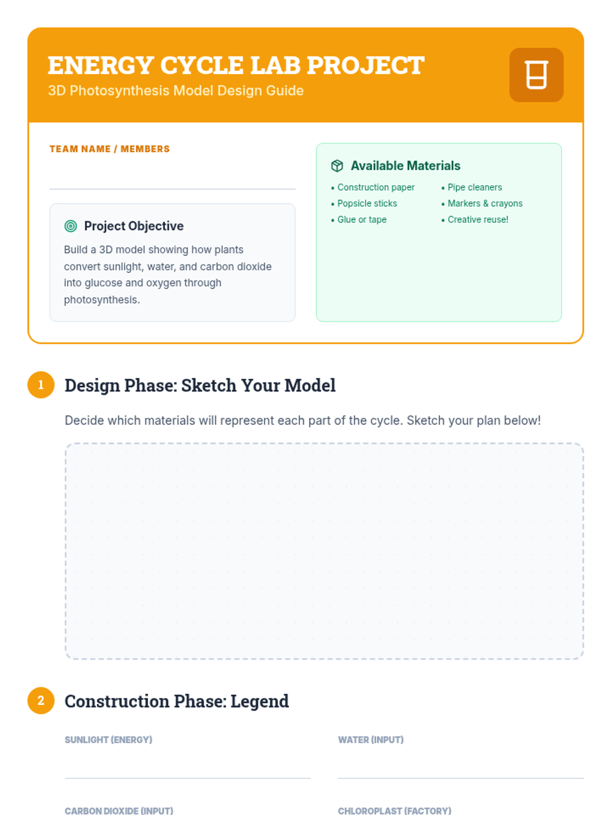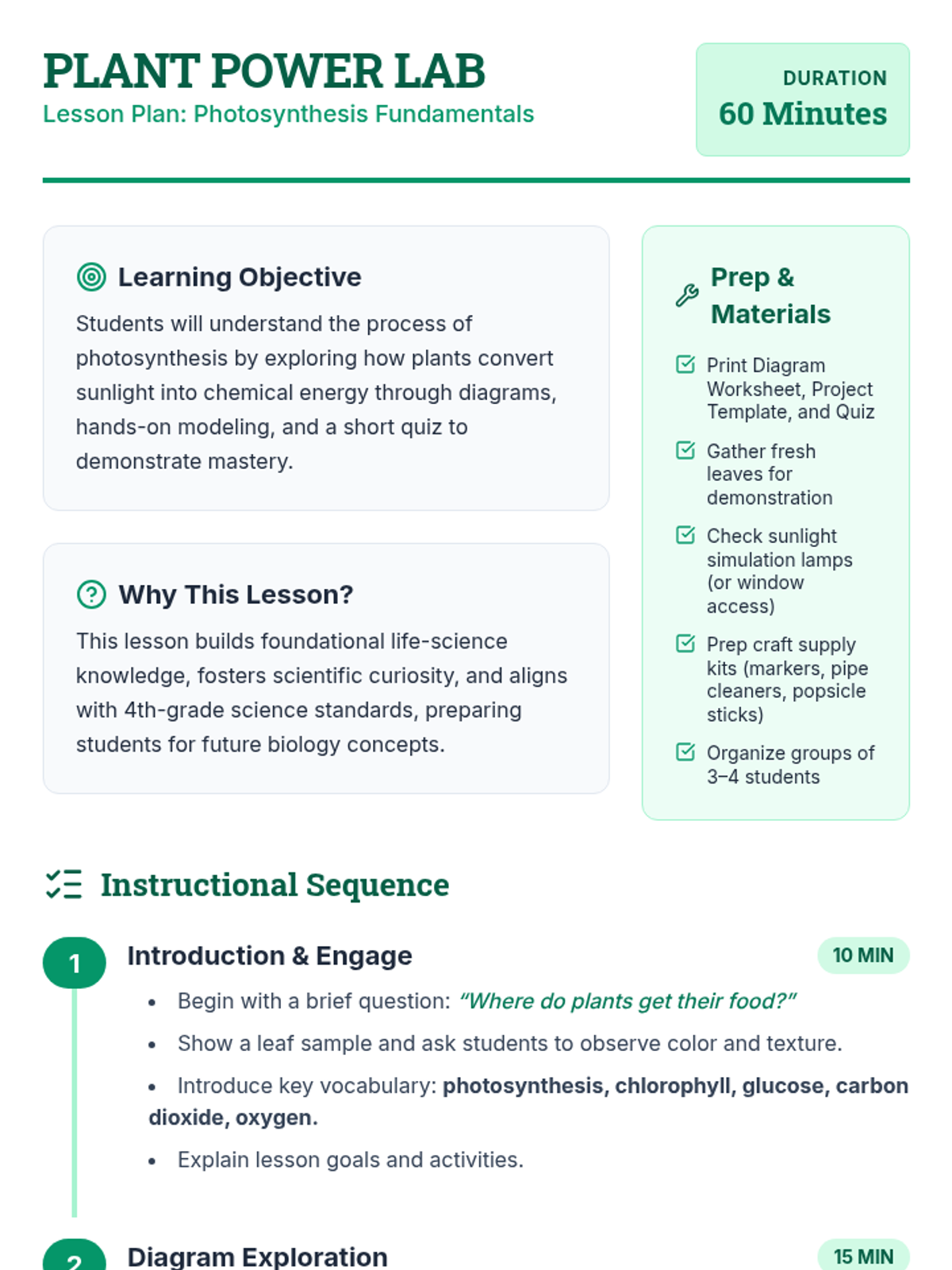 An interactive, hands-on 4th-grade science lesson where students explore photosynthesis through modeling, diagrams, and collaborative projects. Students will learn how plants transform sunlight, water, and carbon dioxide into energy and oxygen.