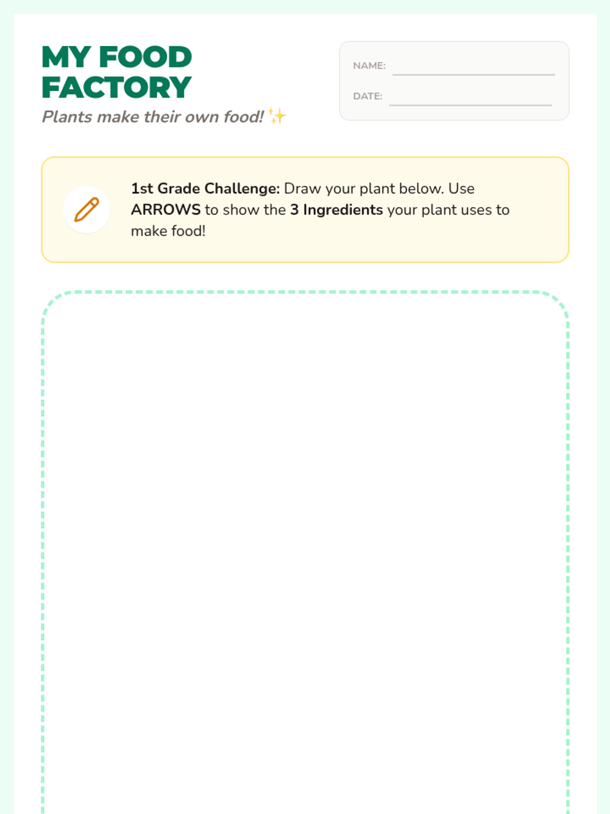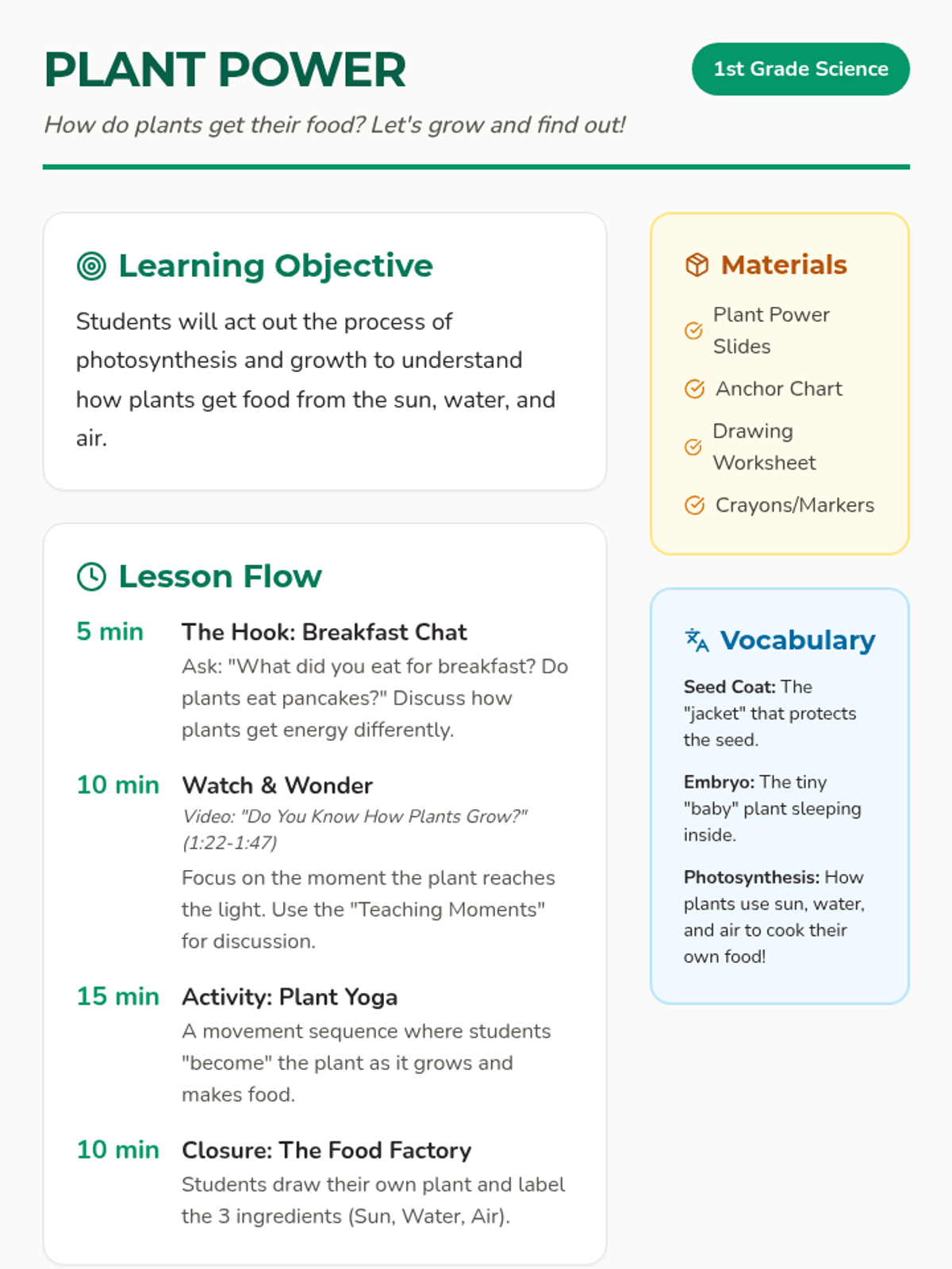 A 1st-grade science lesson where students explore the life cycle of a plant and the process of photosynthesis through a movement-based yoga activity and a creative drawing task.
