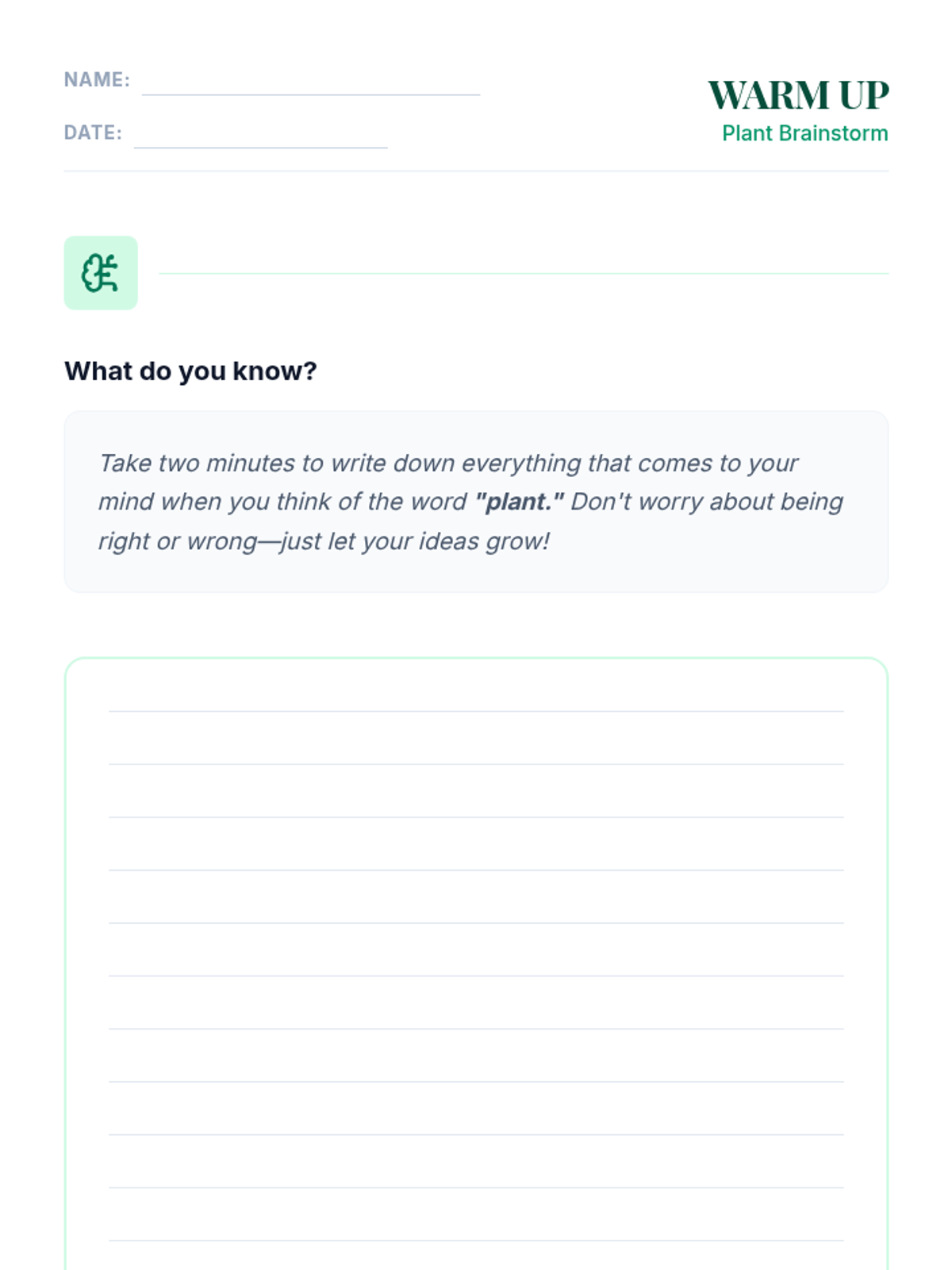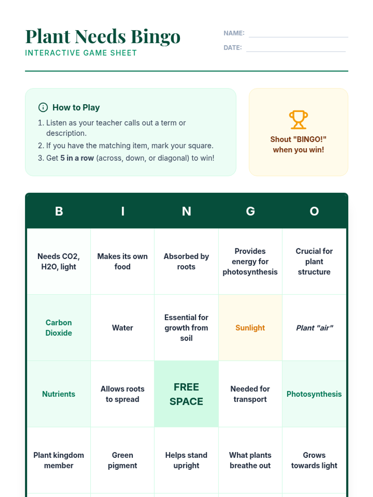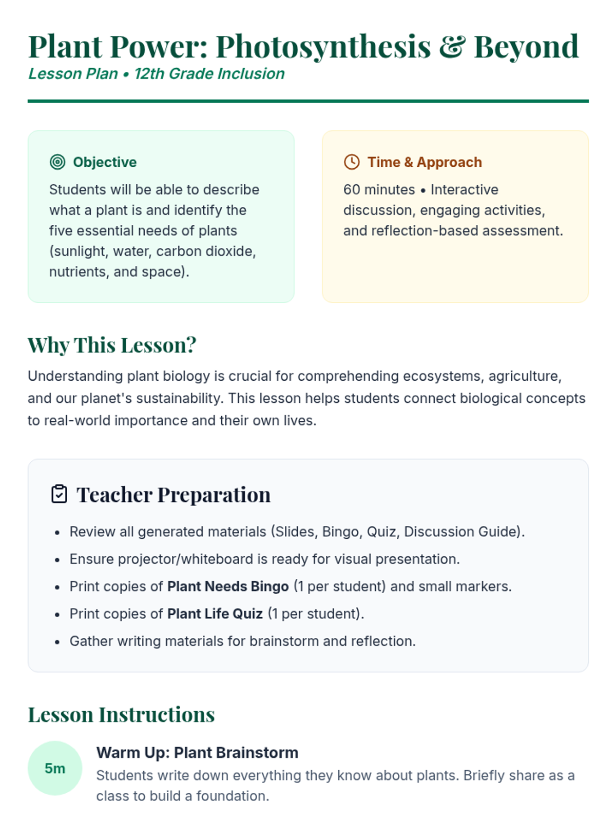 A 60-minute lesson for 12th-grade inclusion students exploring plant biology, photosynthesis, and essential growth needs. Students define what a plant is and identify five key survival requirements through interactive discussion and games.
