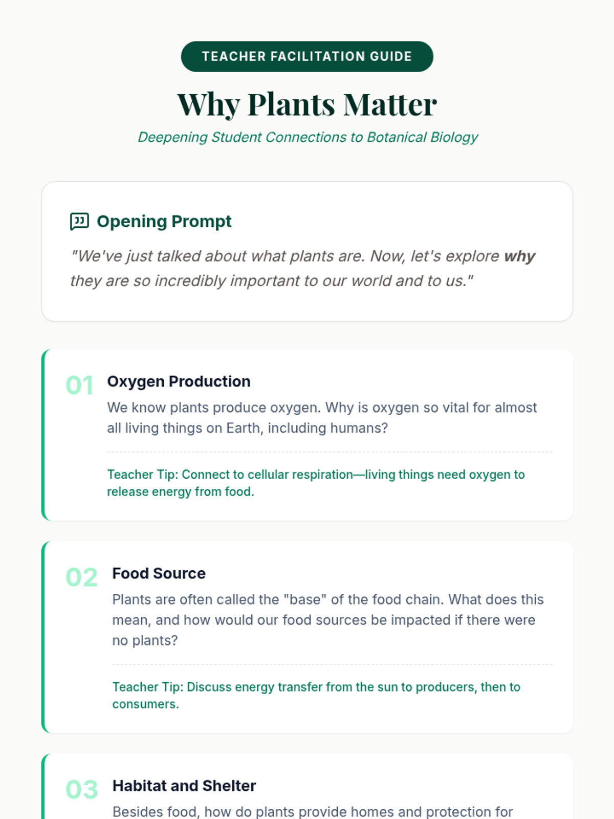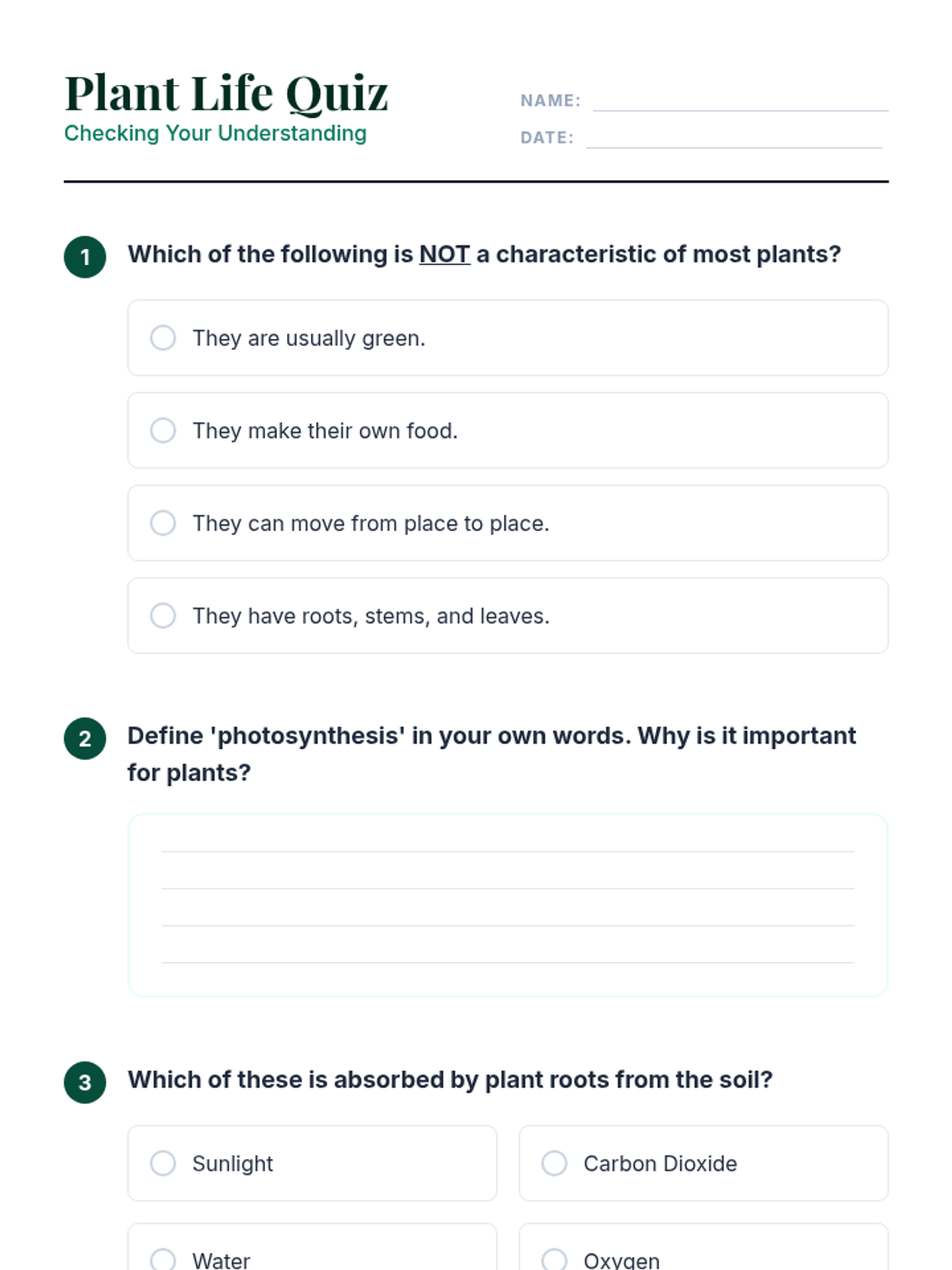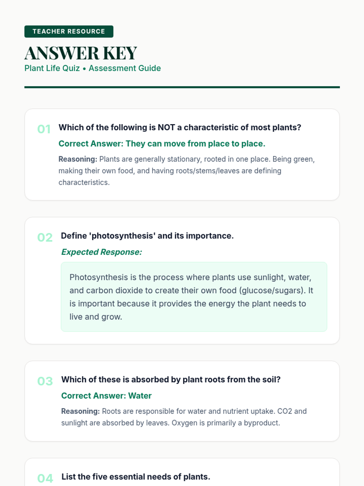 A 60-minute lesson for 12th-grade inclusion students exploring plant biology, photosynthesis, and essential growth needs. Students define what a plant is and identify five key survival requirements through interactive discussion and games.