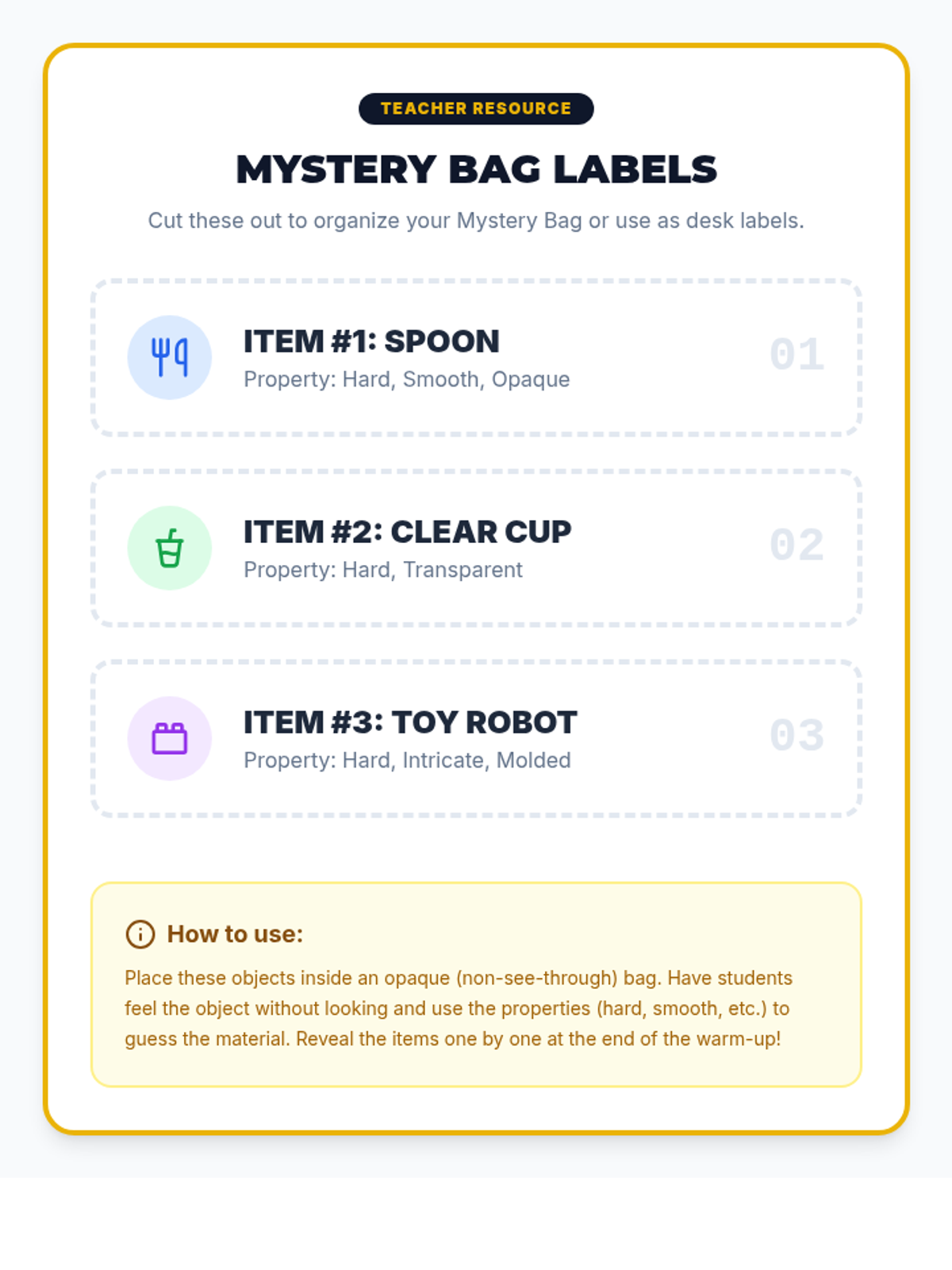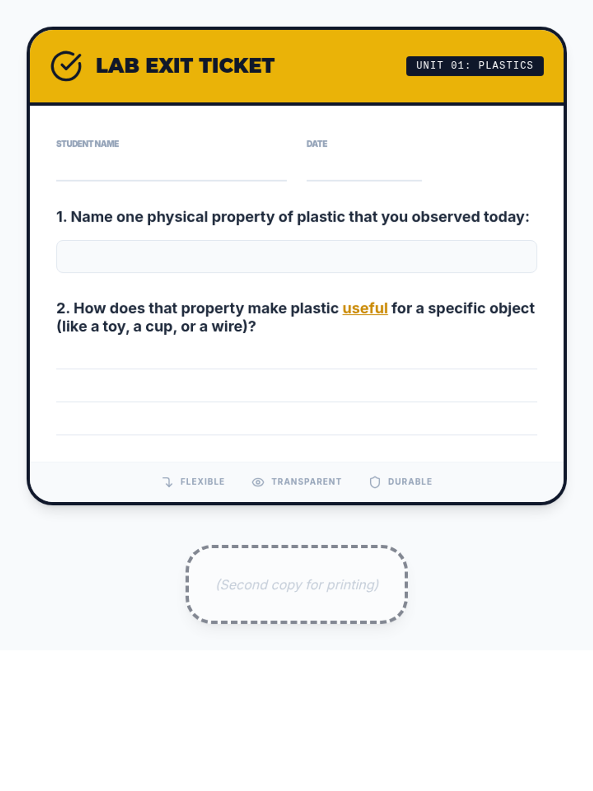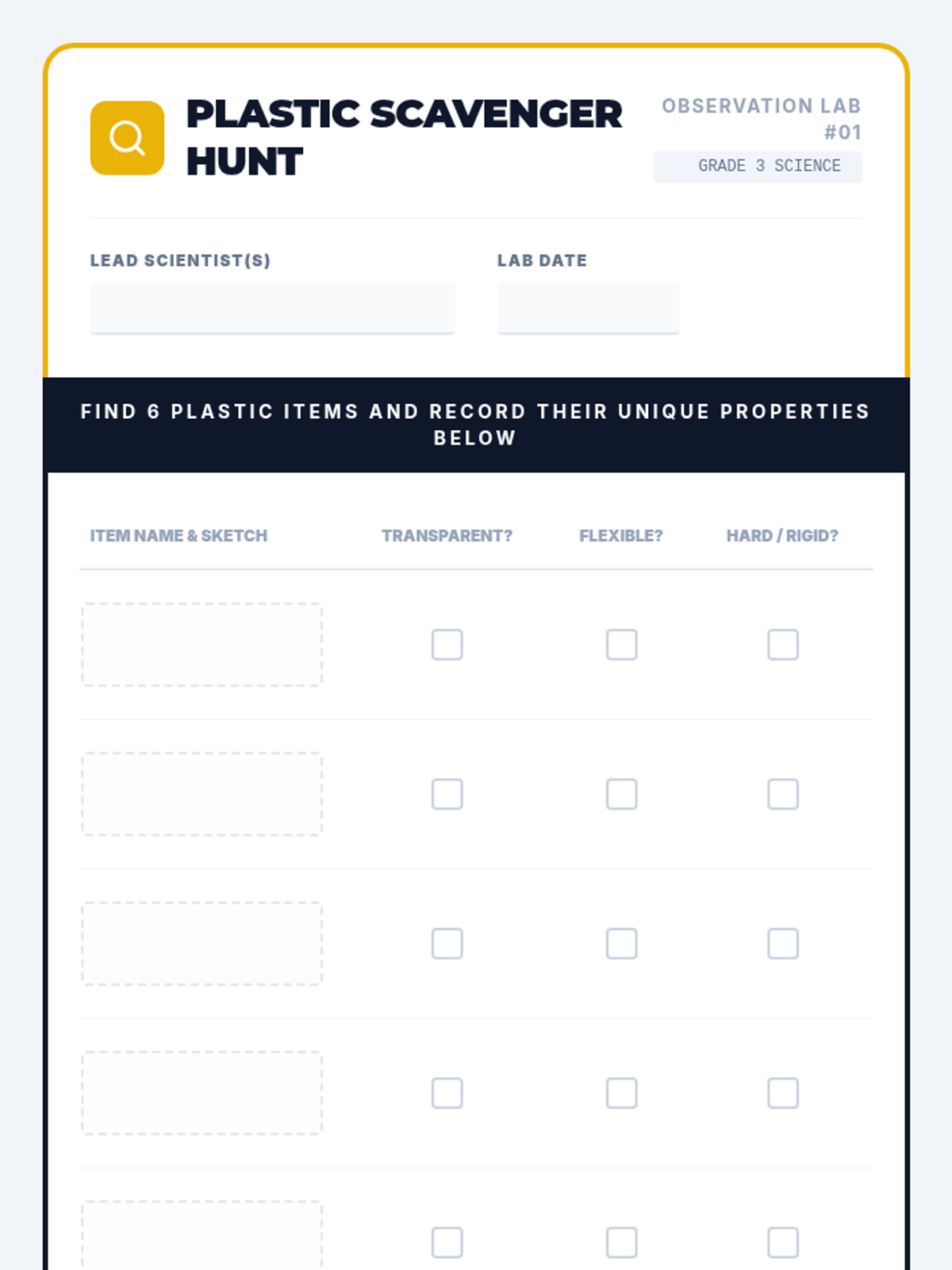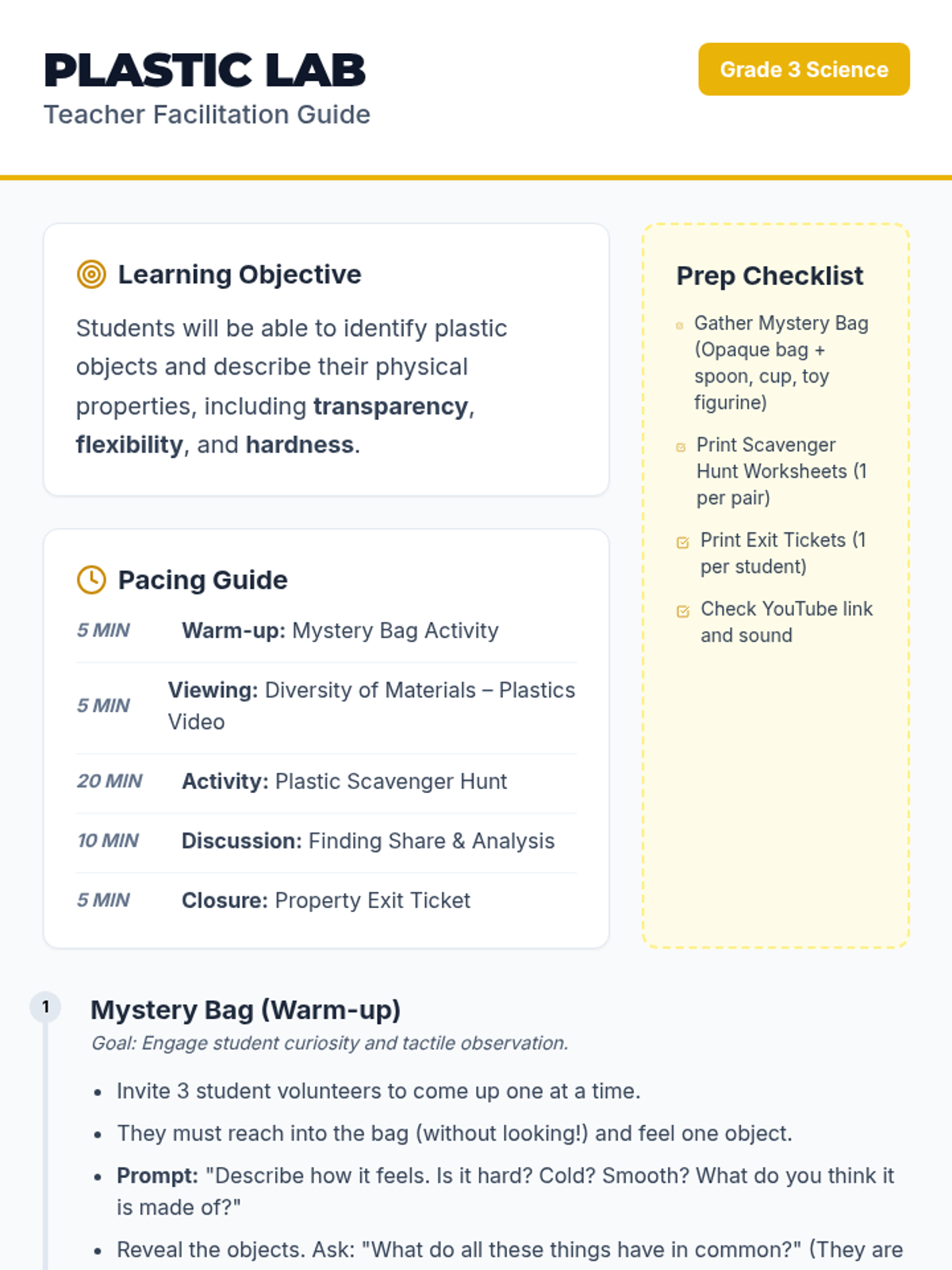 A hands-on introductory lesson for 3rd graders to explore the physical properties of plastic through a classroom scavenger hunt and video analysis. Students will learn to distinguish between transparent, opaque, flexible, and hard plastics while considering why these materials are chosen for specific uses.