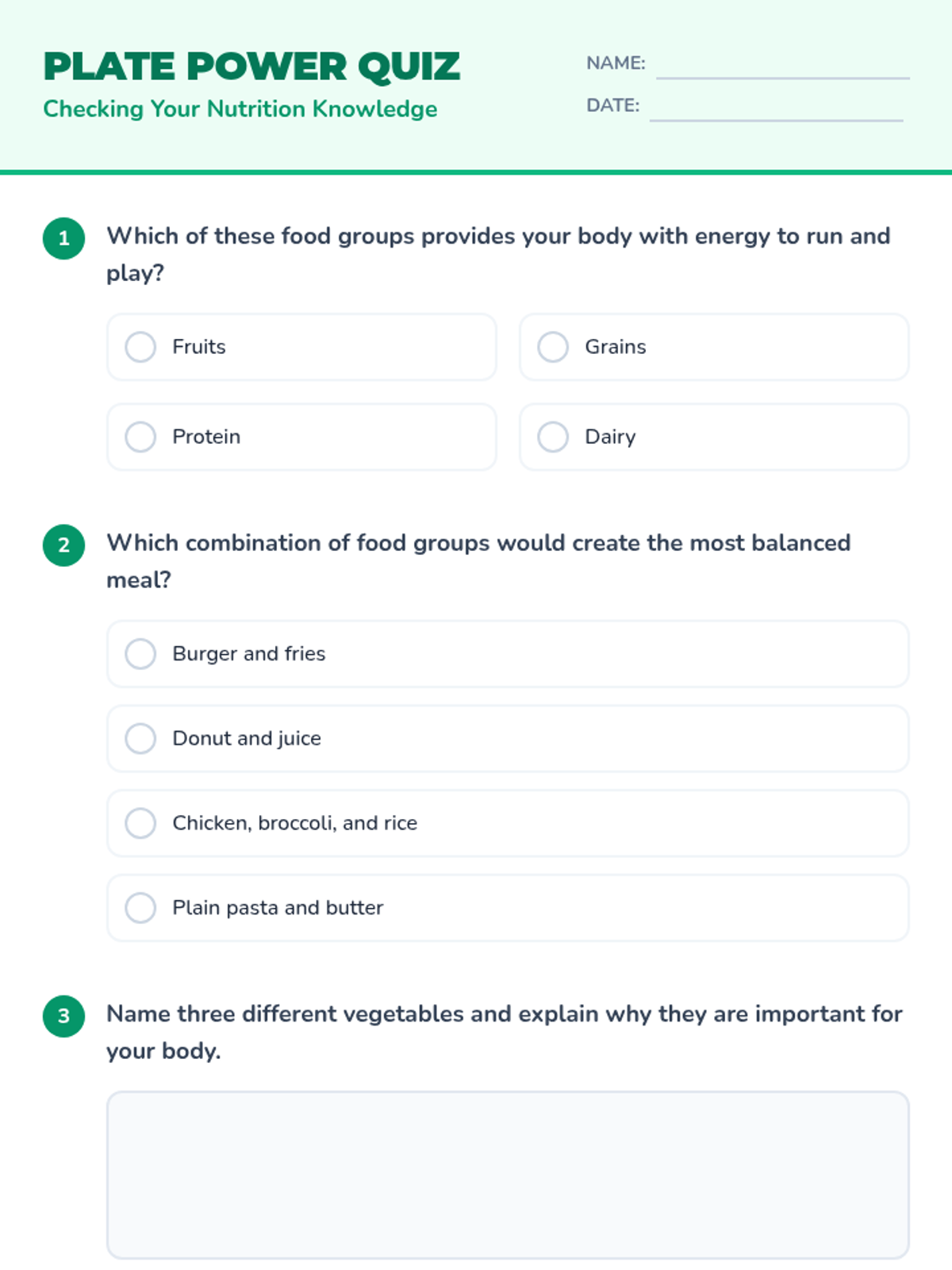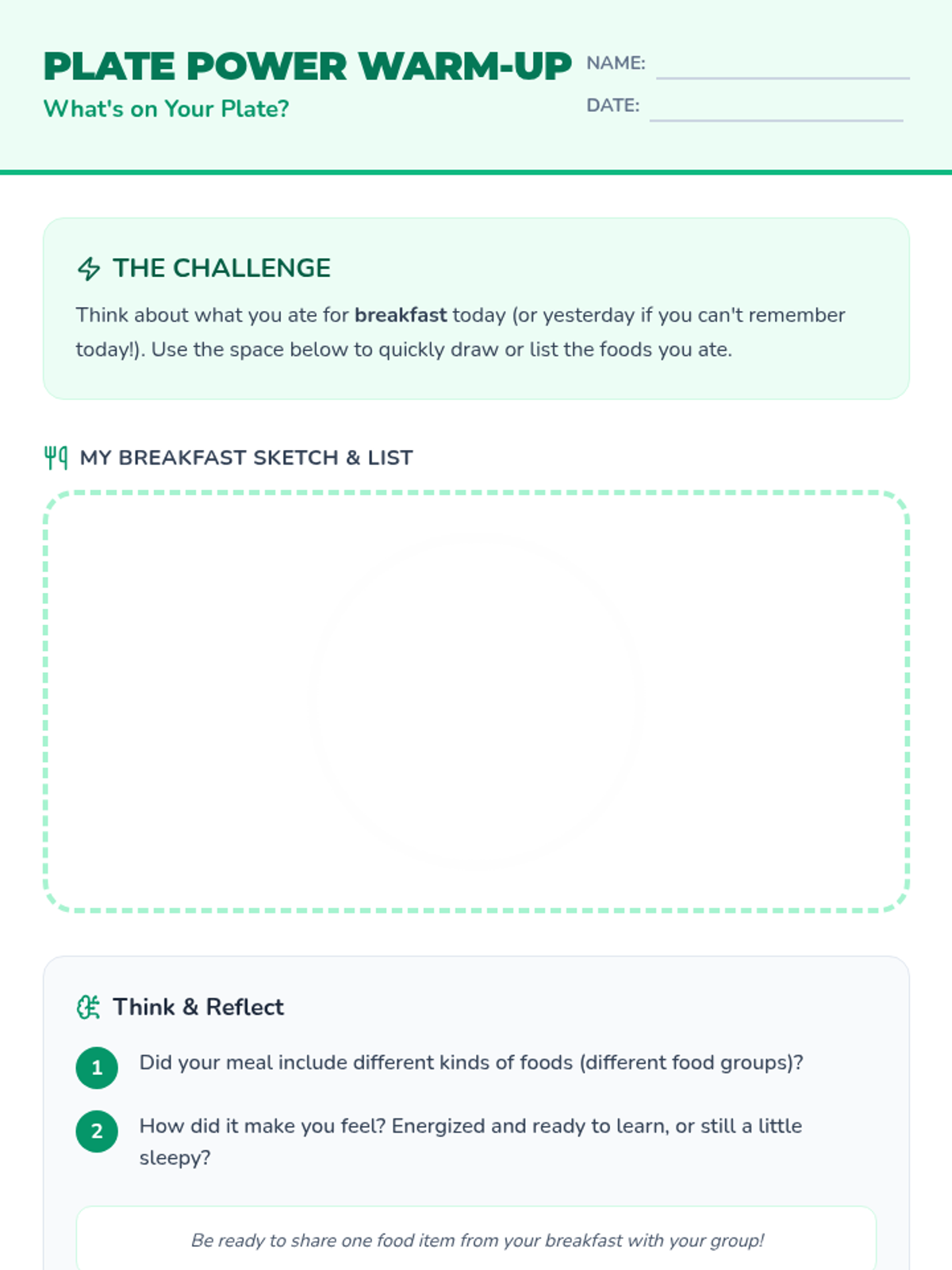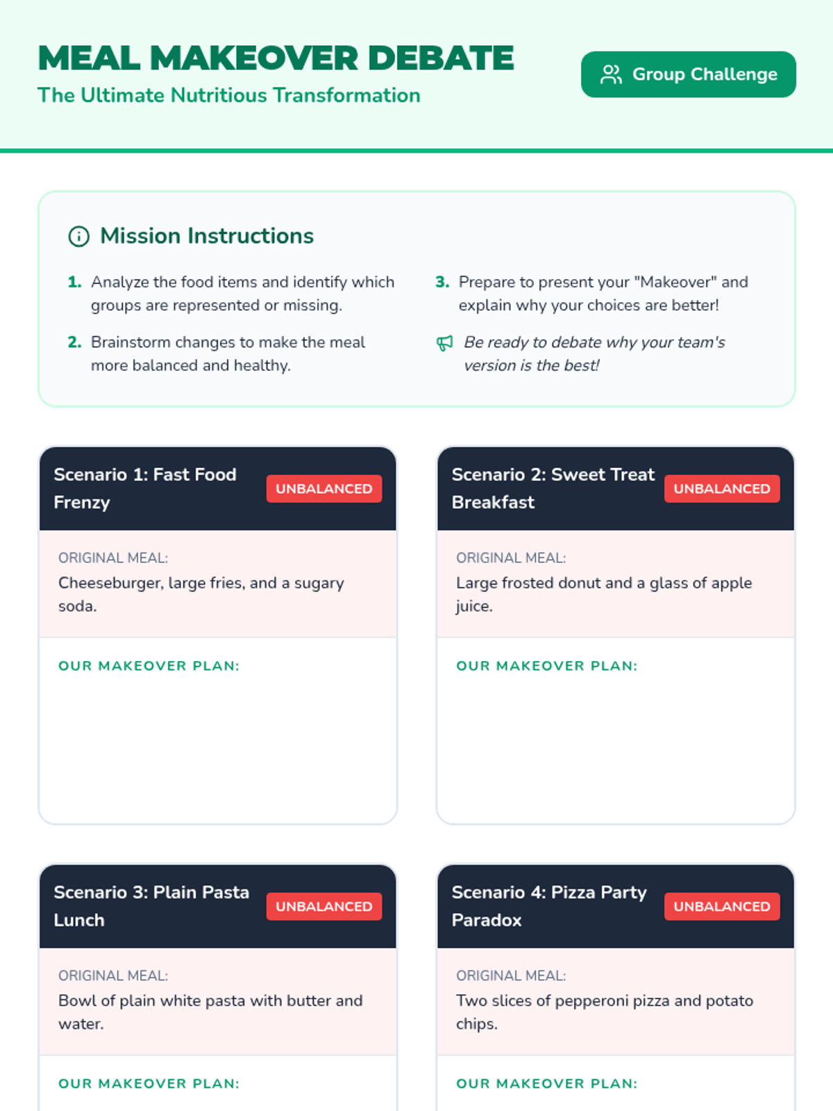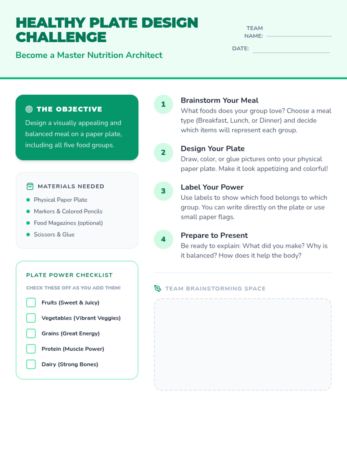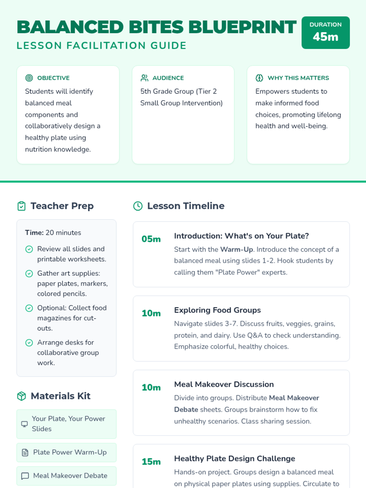 A 45-minute interactive lesson for 5th graders focused on building balanced meals through collaborative challenges and hands-on design.