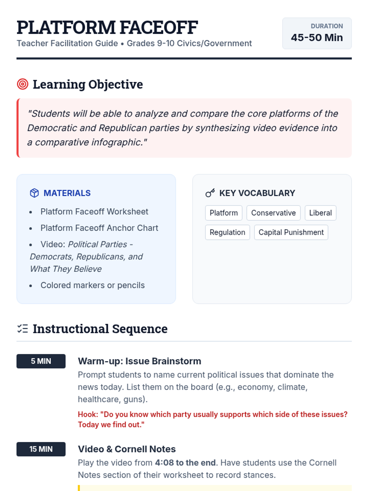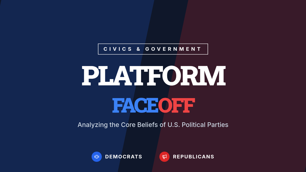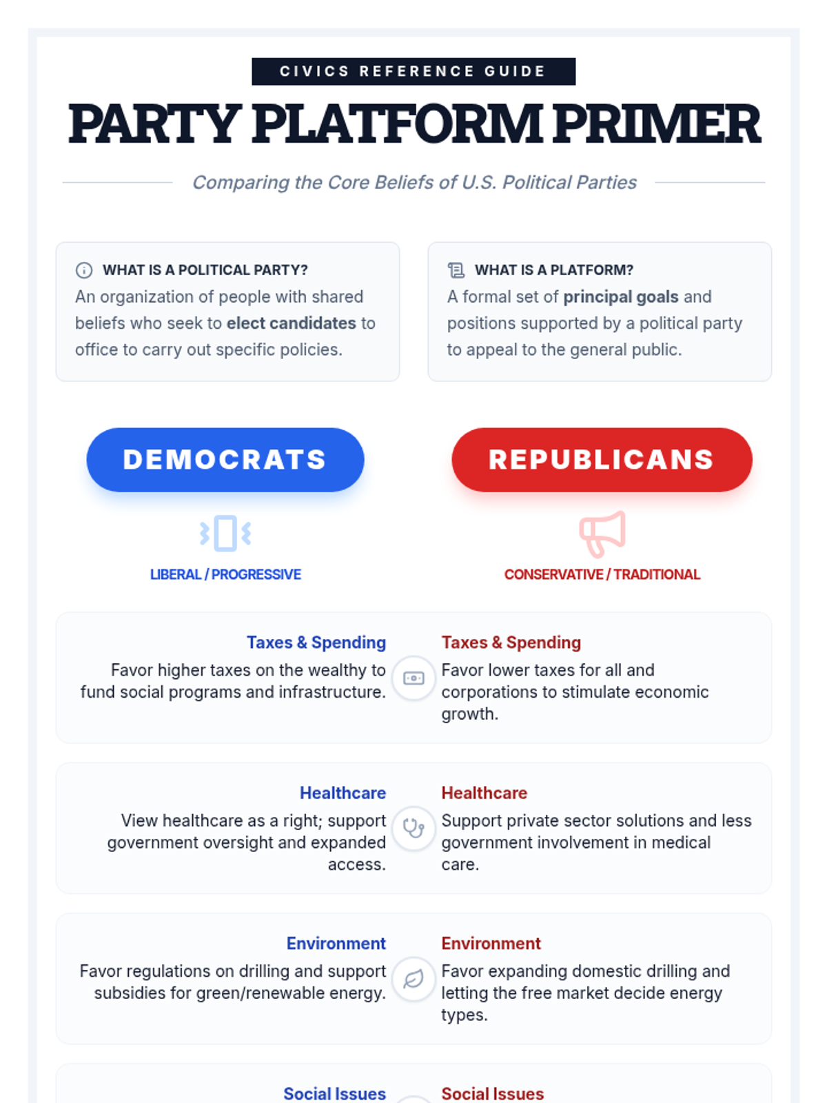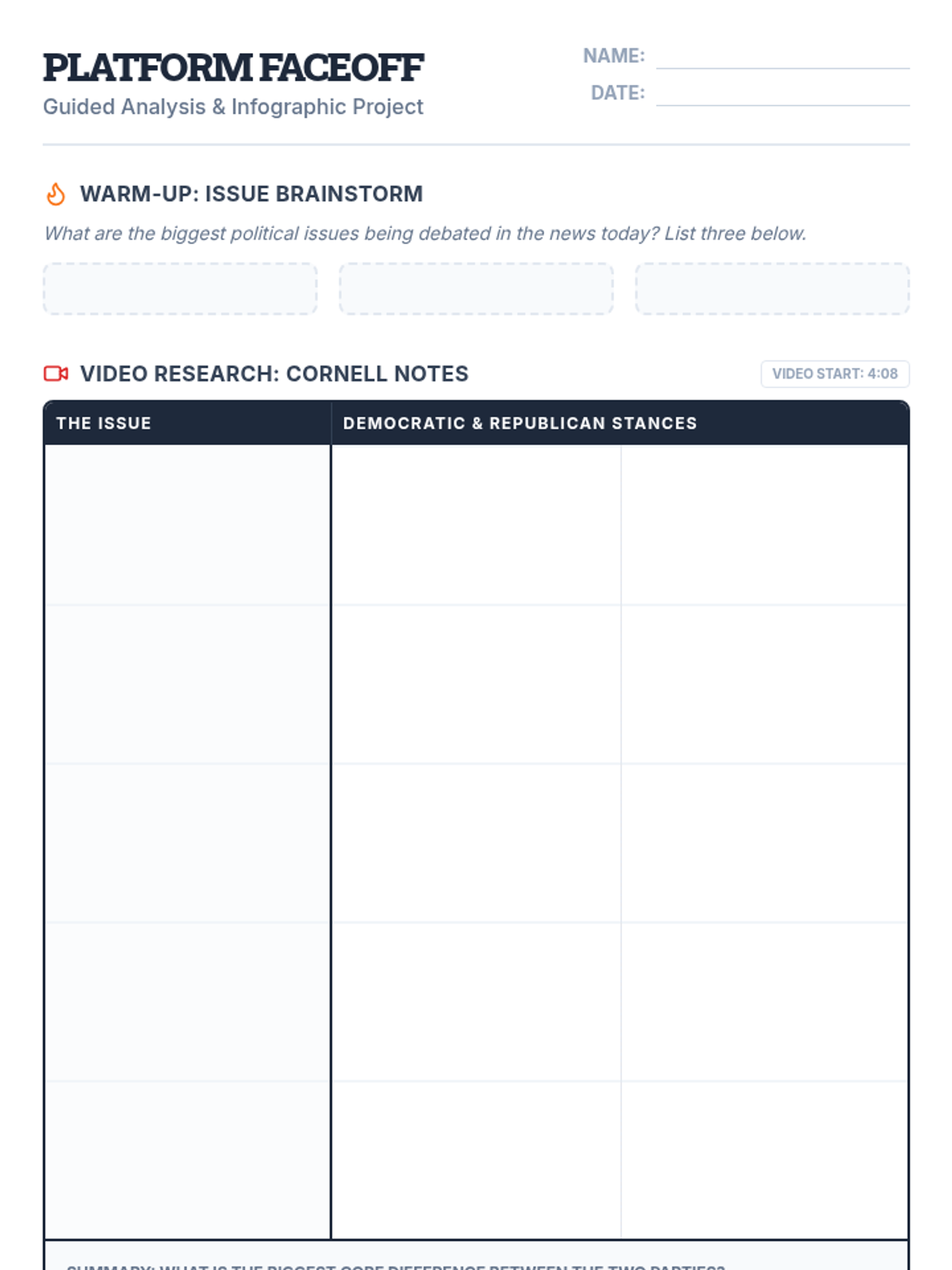 A high school civics lesson where students analyze and compare the core platforms of the Democratic and Republican parties using video-based research and infographic design.
