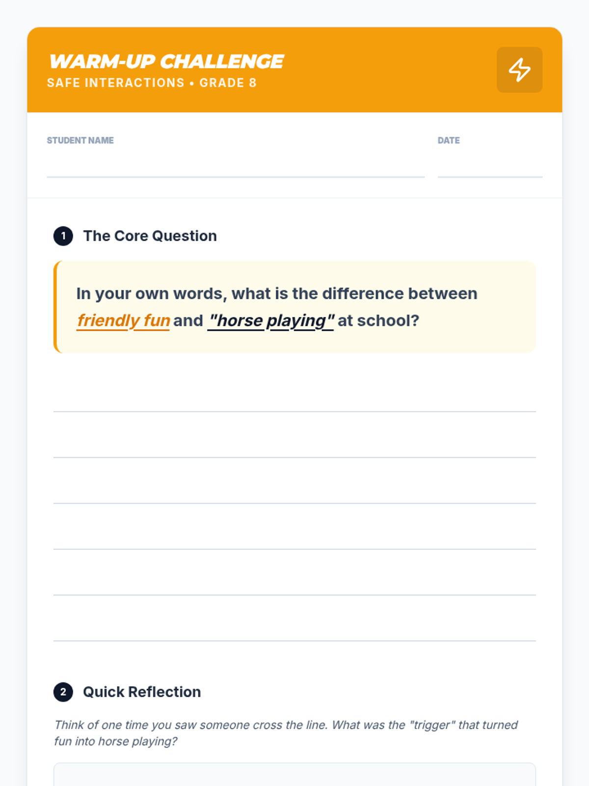 An interactive 30-minute session for 8th graders to navigate the boundaries of physical play, understand the impact of 'horse playing,' and establish a culture of mutual respect and safety.