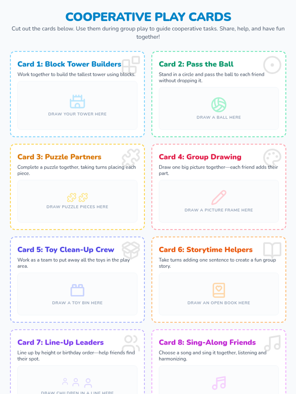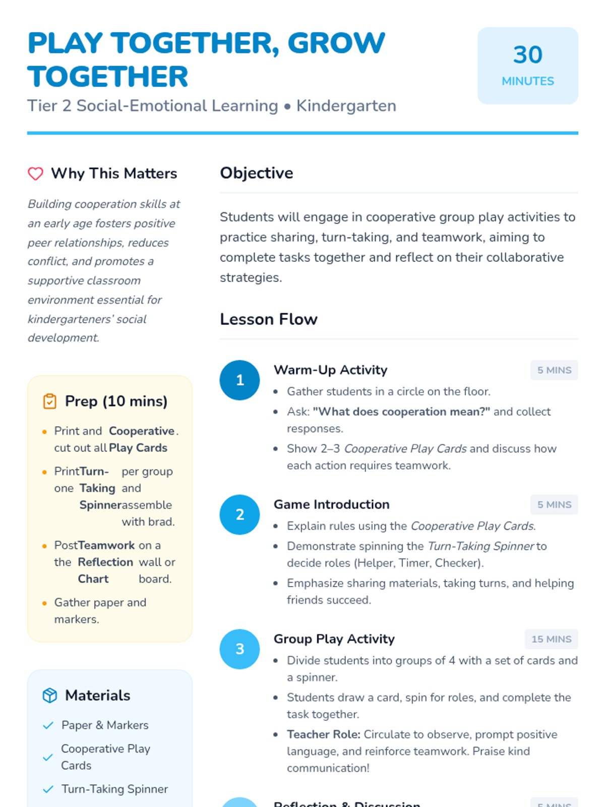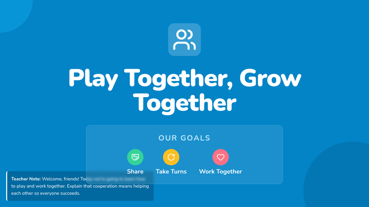 In this 30-minute Tier 2 lesson for kindergarteners, students will learn the value of cooperation and group play through engaging activities and games. By practicing sharing, turn-taking, and teamwork, young learners build essential social skills that support their development and classroom harmony.