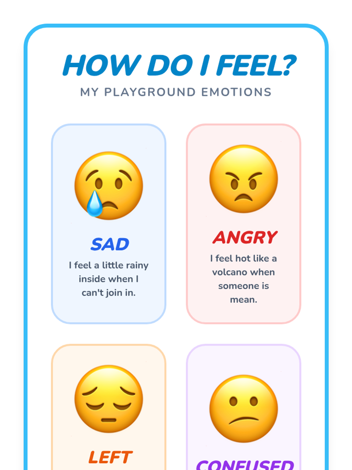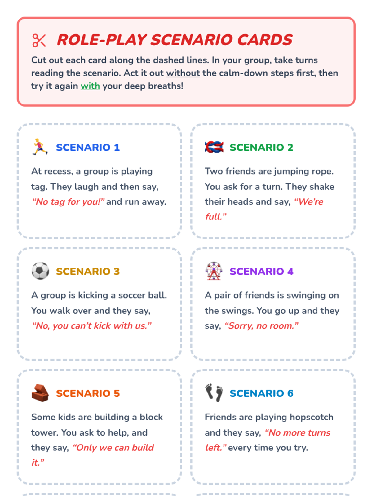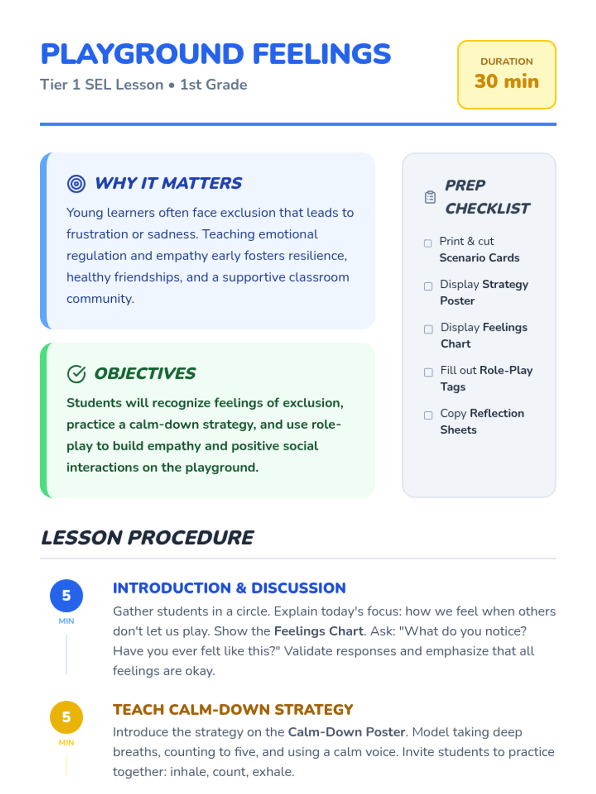 A 30-minute Tier 1 SEL lesson for 1st graders focusing on emotional regulation and empathy during playground exclusion. Students learn and practice a 3-step calm-down strategy through role-play.
