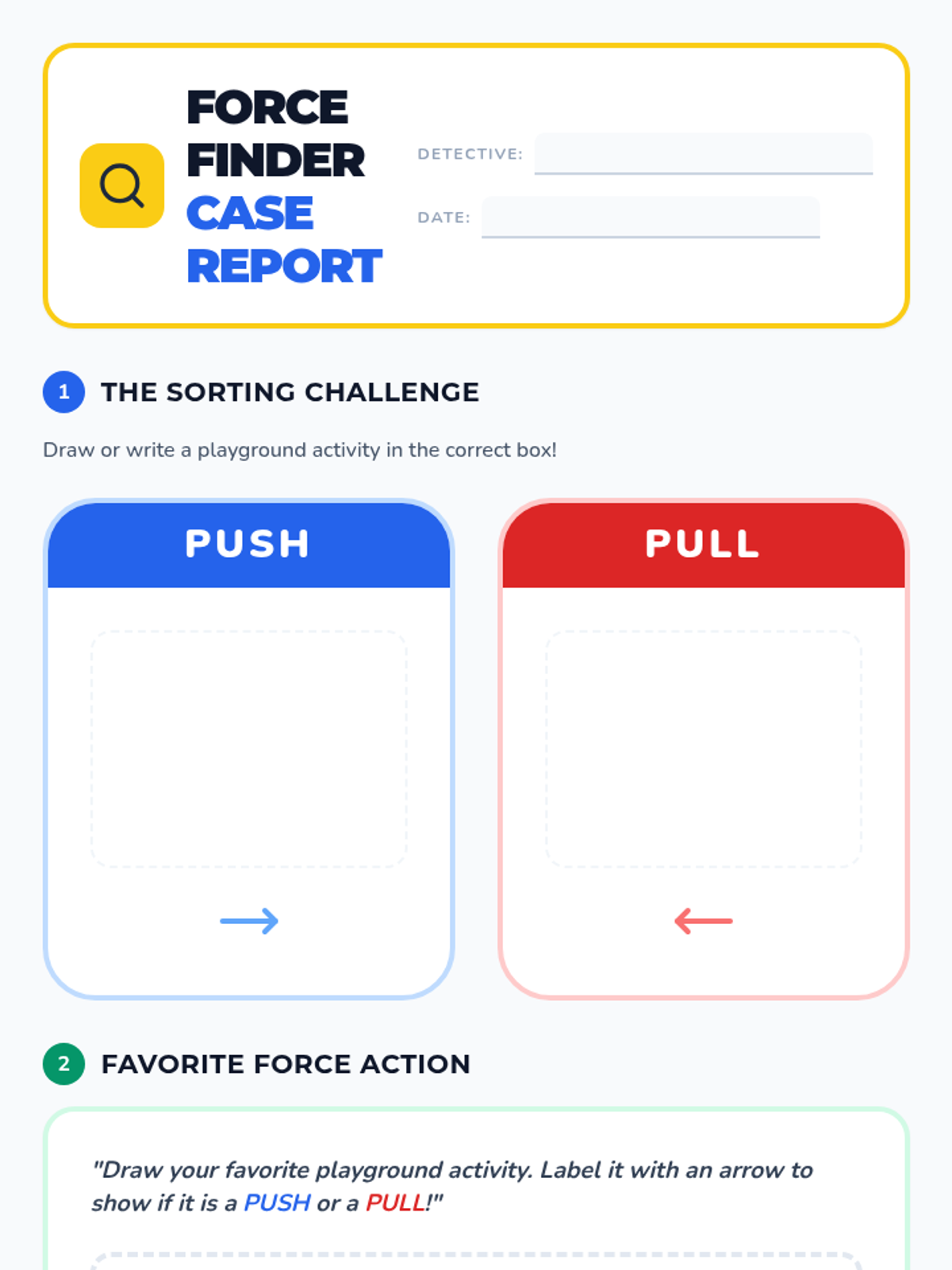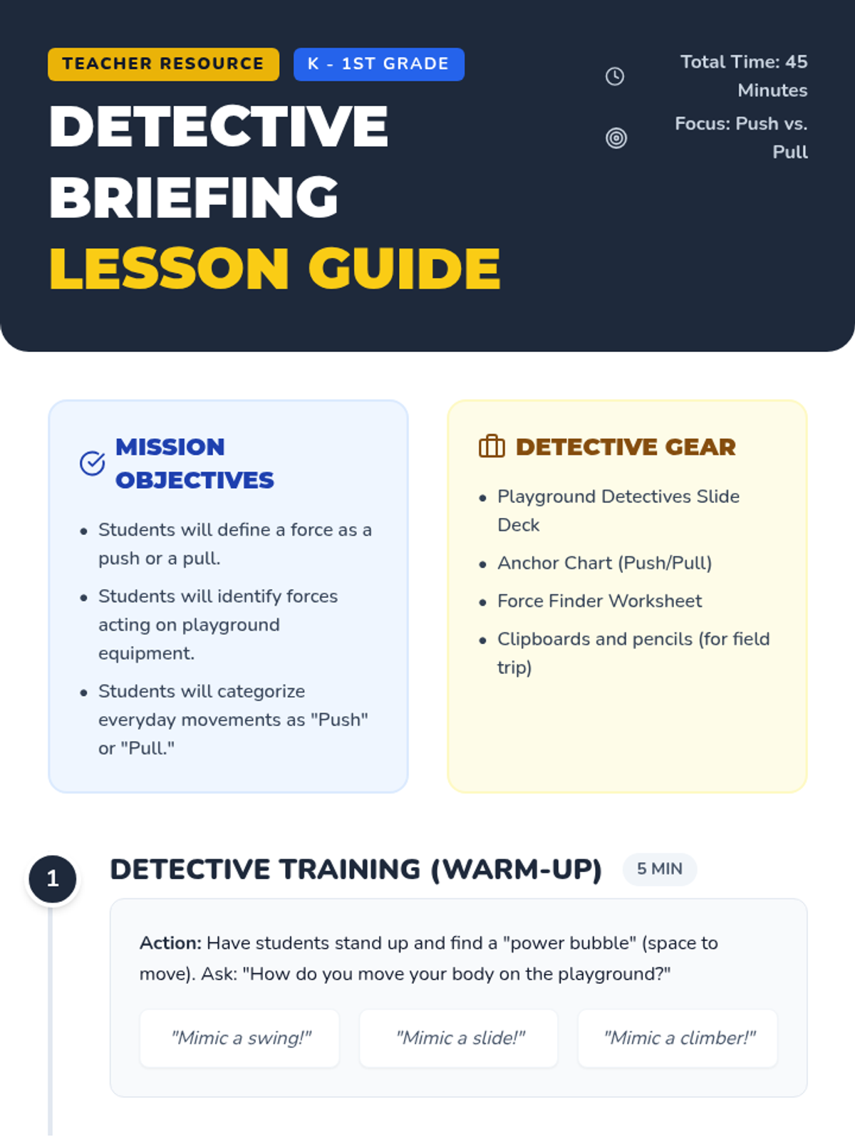 A Kindergarten to 1st Grade science lesson that uses the playground to explore the concepts of push and pull forces. Students act out motions, watch a video, and go on a 'field mission' to identify forces in action.