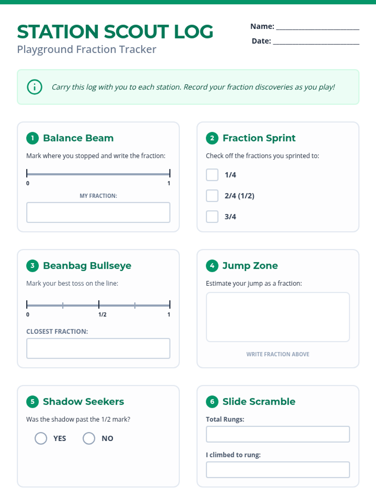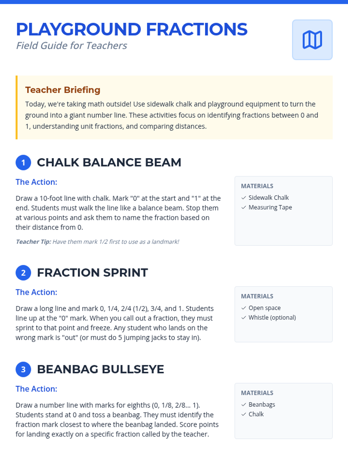 A series of active, outdoor playground activities designed to help 3rd graders master fractions on a number line through movement and play.