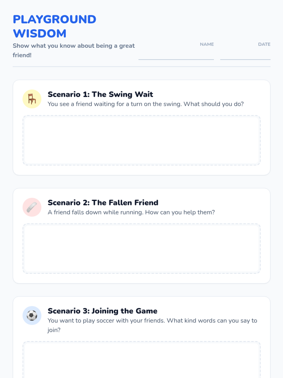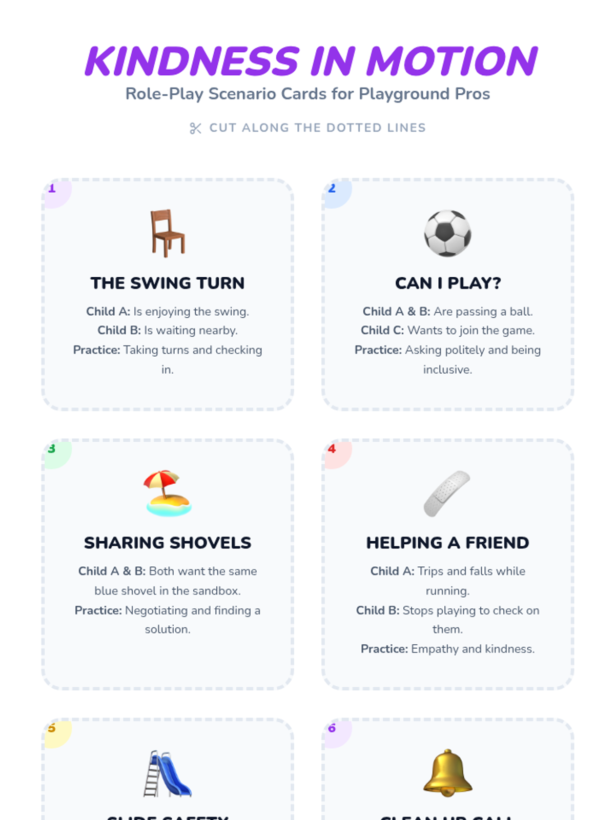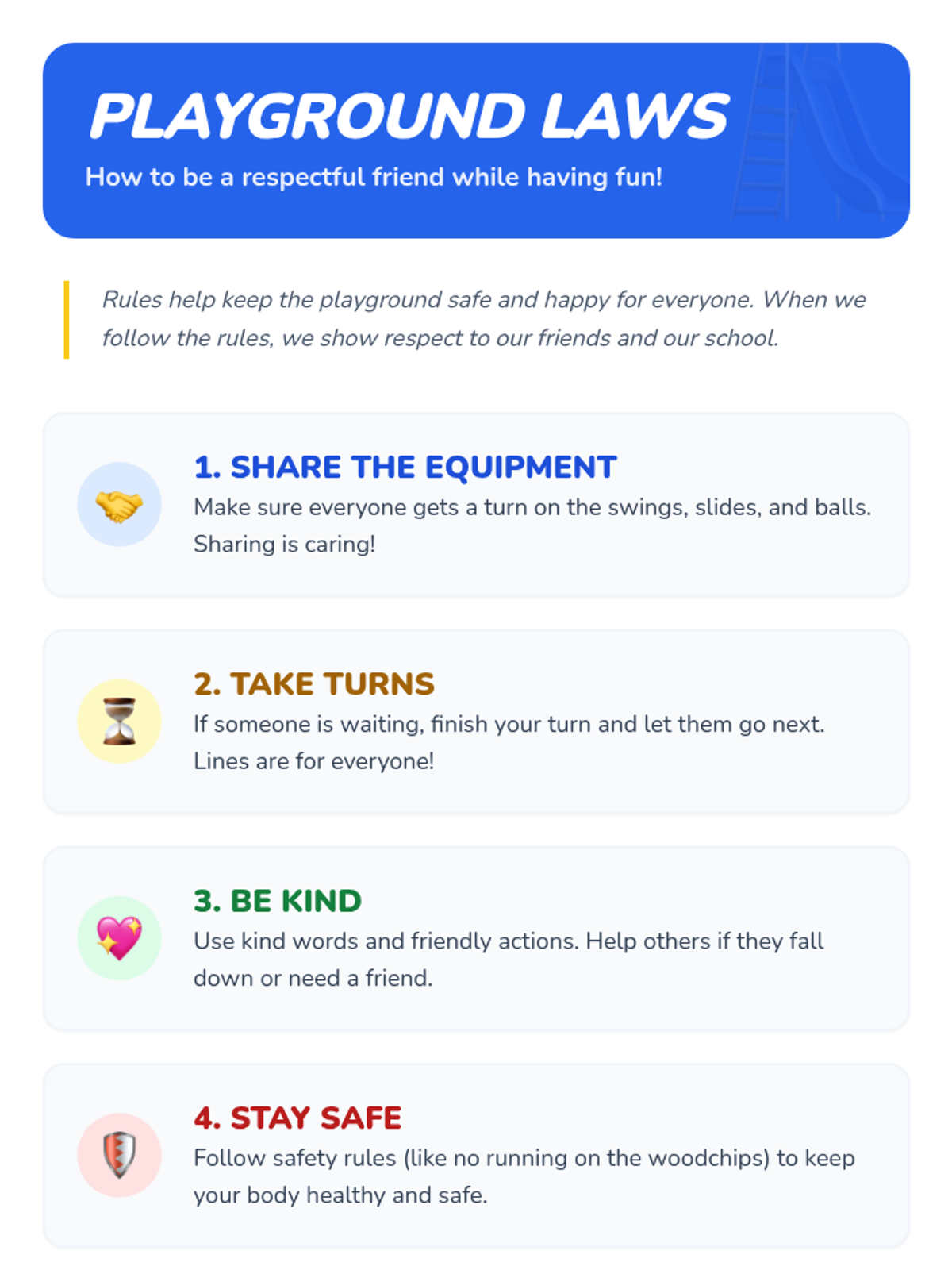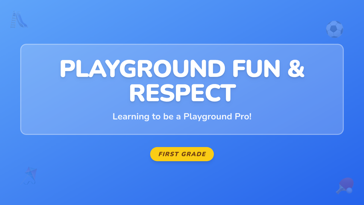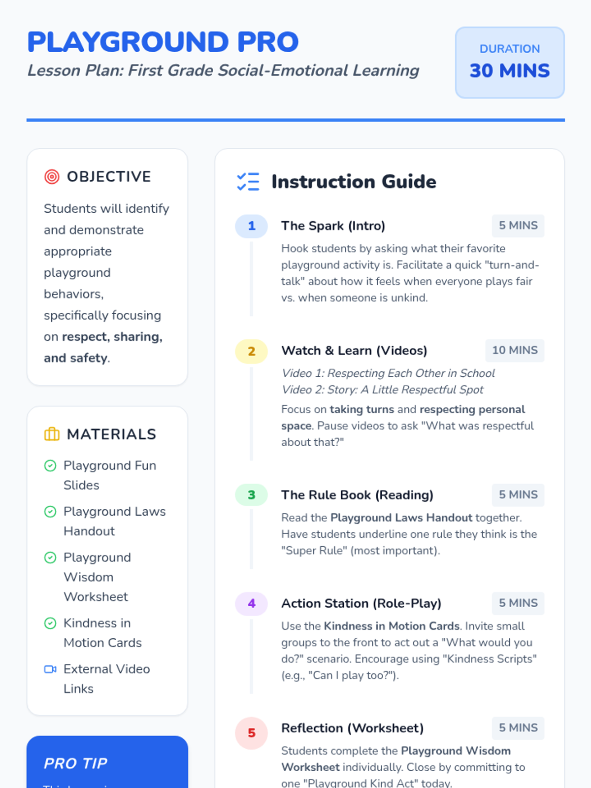 A comprehensive first-grade lesson on playground etiquette, focusing on respect, sharing, and safety through videos, reading, and interactive role-play.