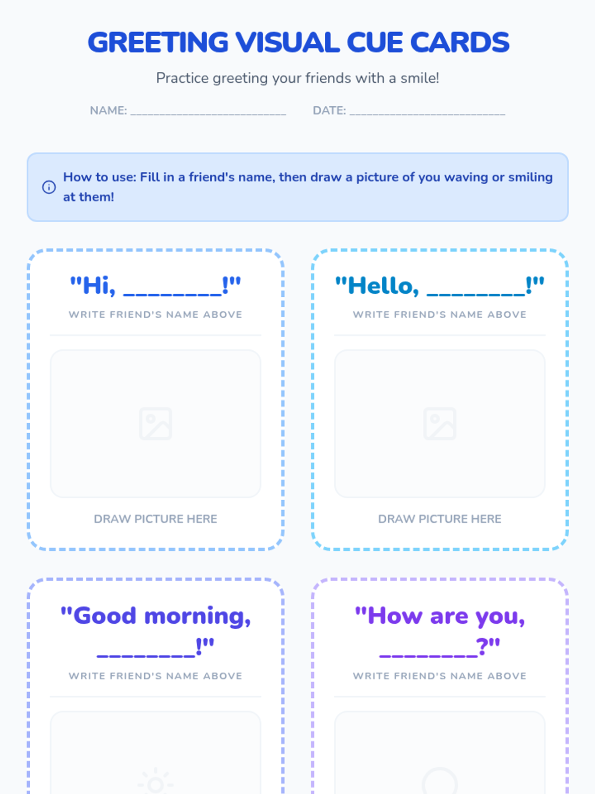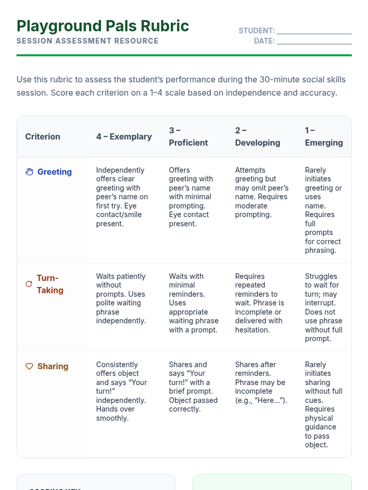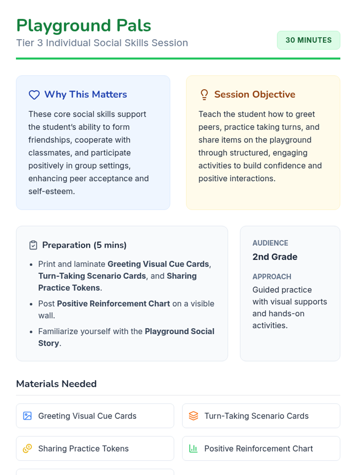 A targeted 30-minute social skills session designed for a 2nd grader with autism, focusing on greetings, turn-taking, and sharing. This individual Tier 3 lesson builds confidence and practical strategies for positive peer interactions.