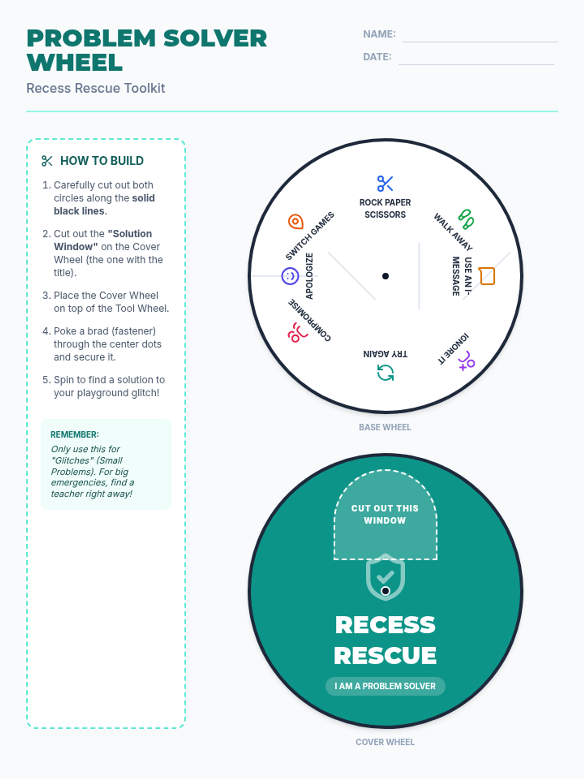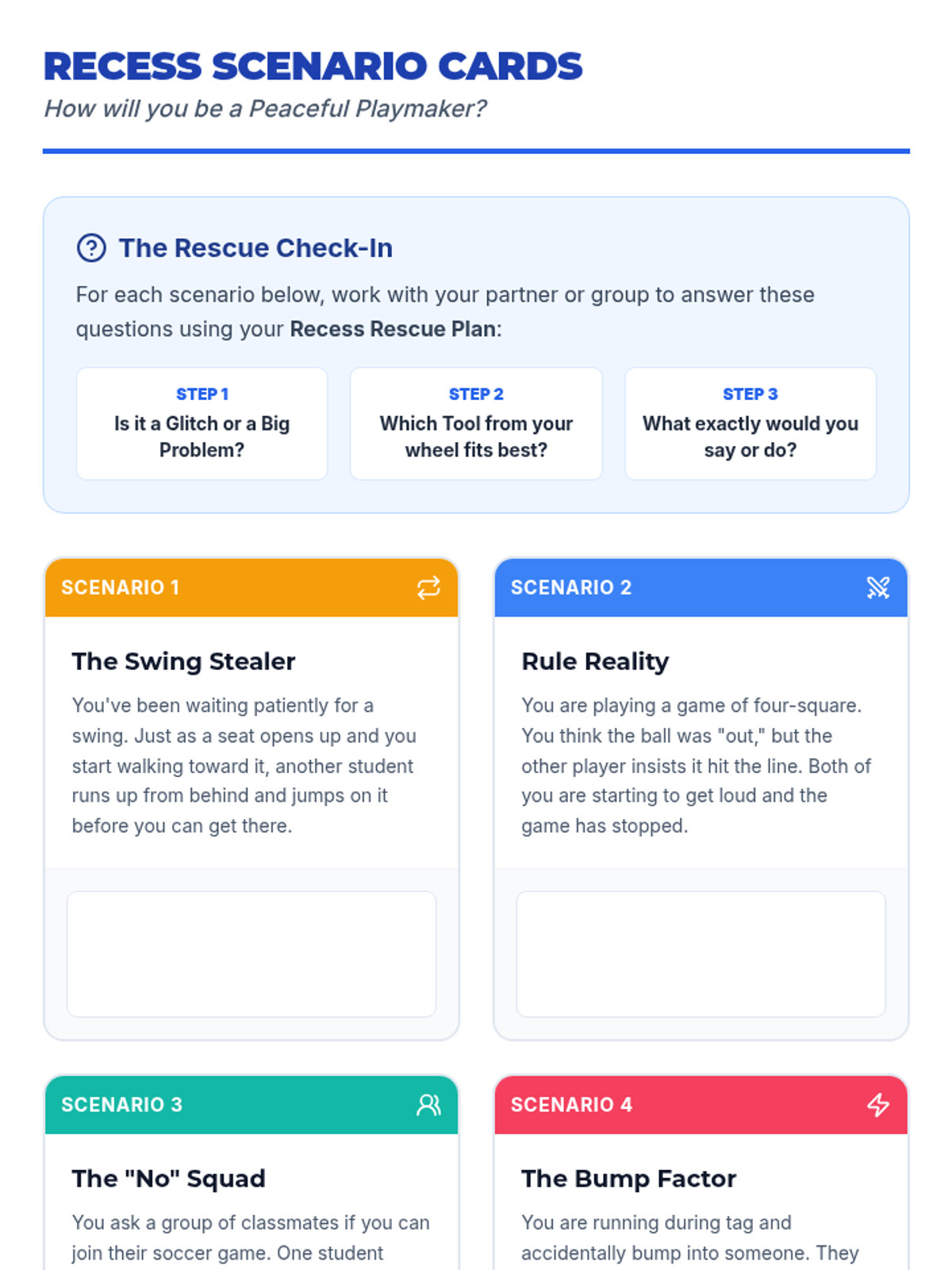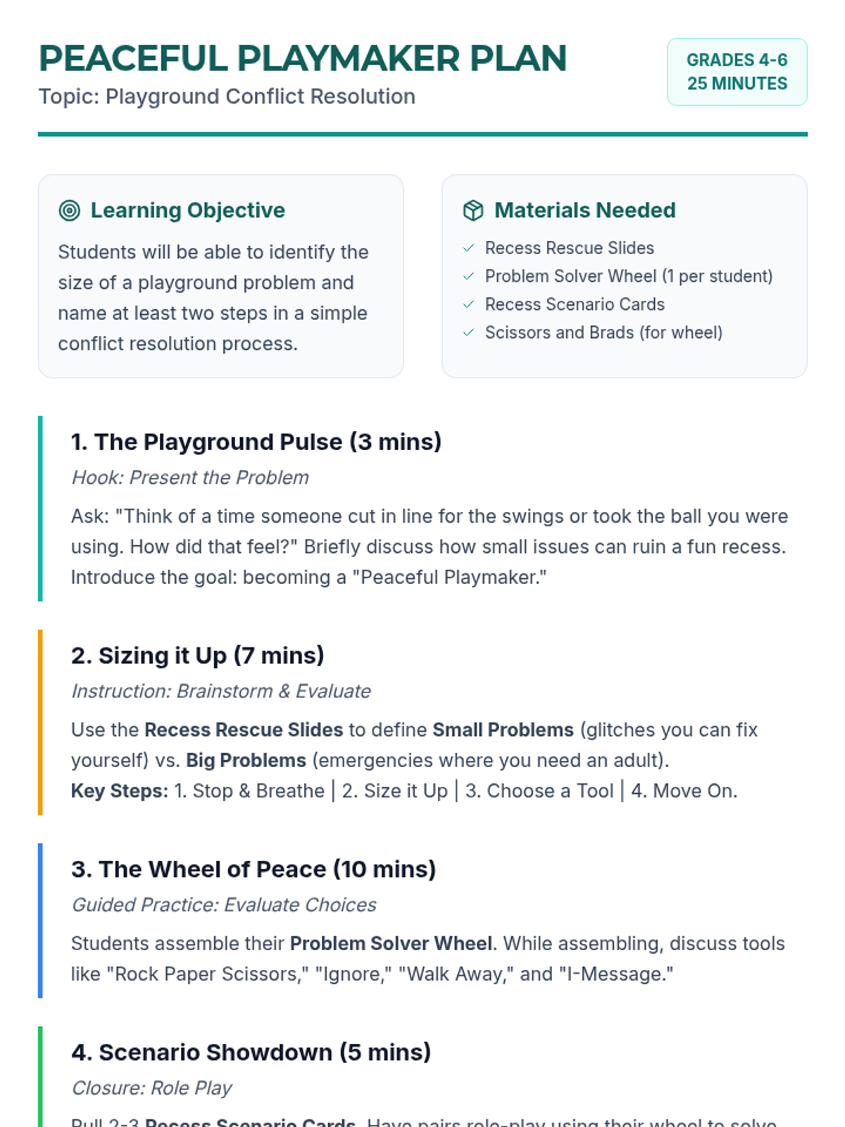 A 25-minute lesson for grades 4-6 on resolving common playground conflicts using a simple problem-solving process, focusing on problem size and effective communication.