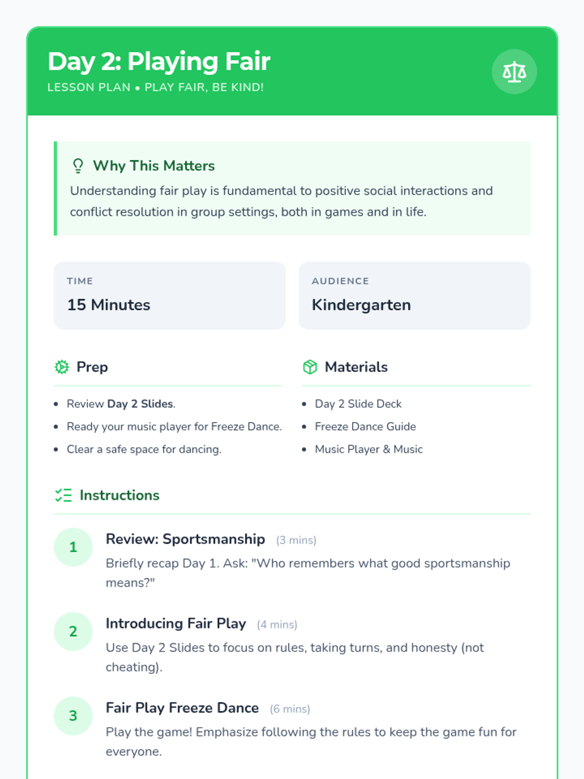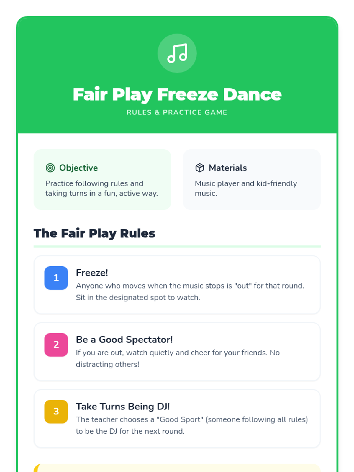 Focuses specifically on the concept of playing fair, including following rules and taking turns, with an interactive Freeze Dance game.