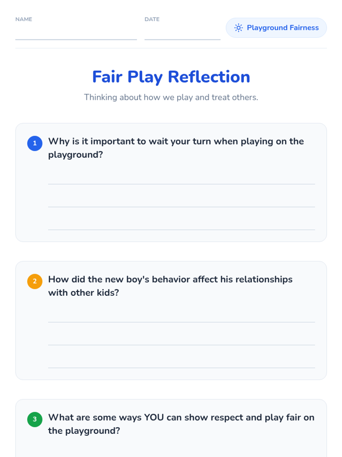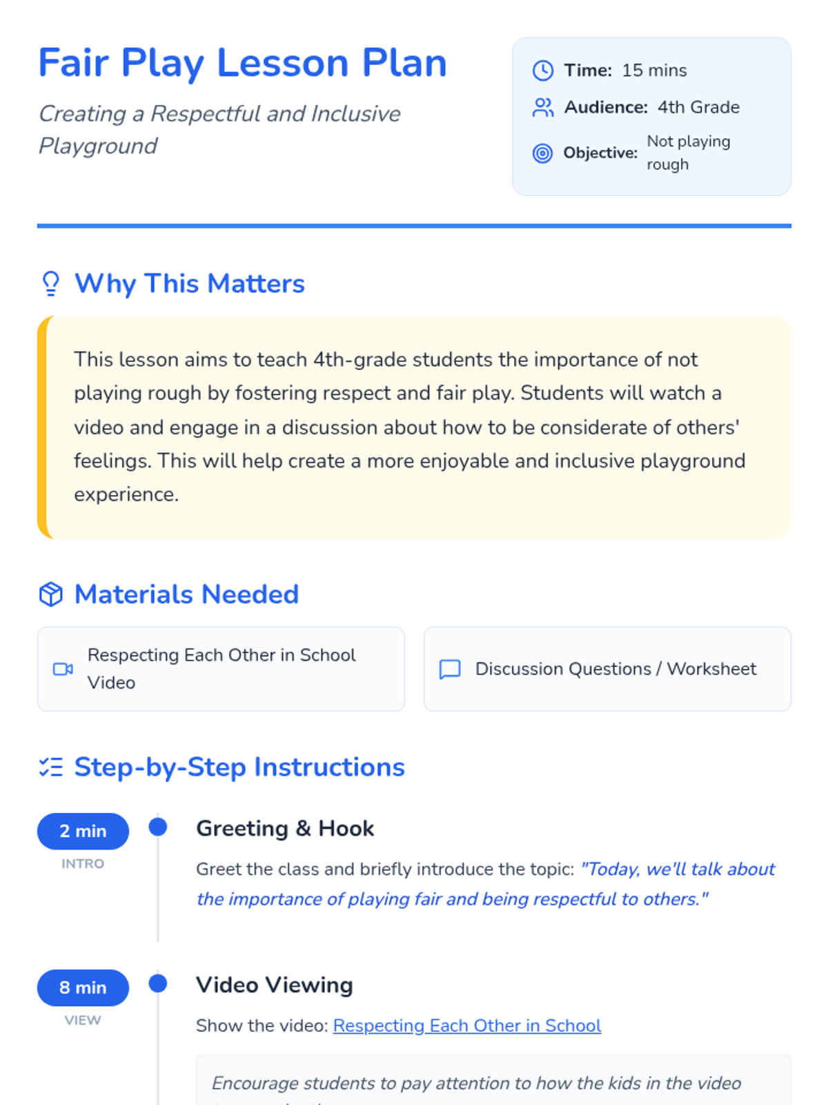 A 15-minute lesson for 4th graders on the importance of playing fair, taking turns, and avoiding rough play to build better friendships and an inclusive playground.