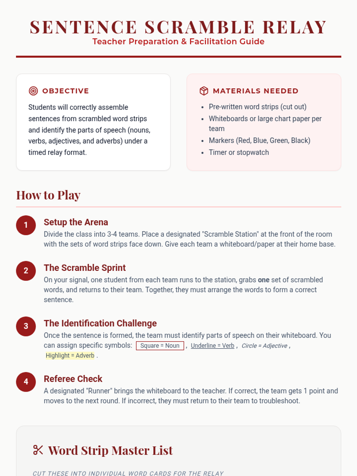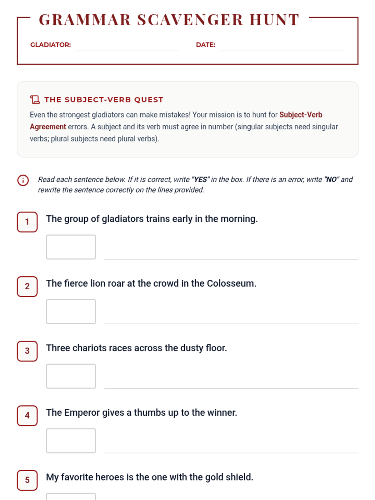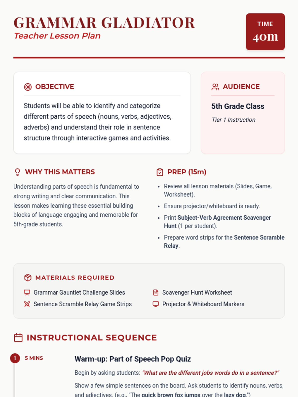 A 5th-grade grammar lesson where students become 'grammar gladiators' to master nouns, verbs, adjectives, and adverbs through games and interactive challenges.