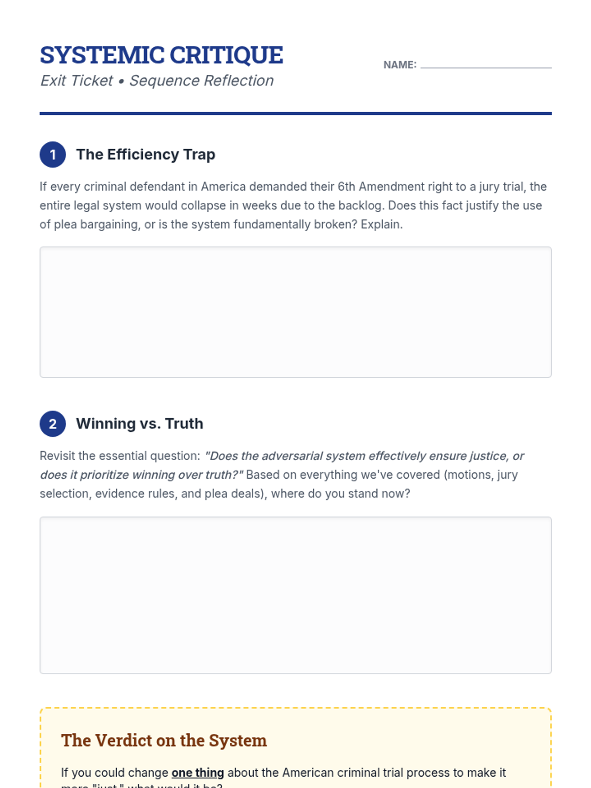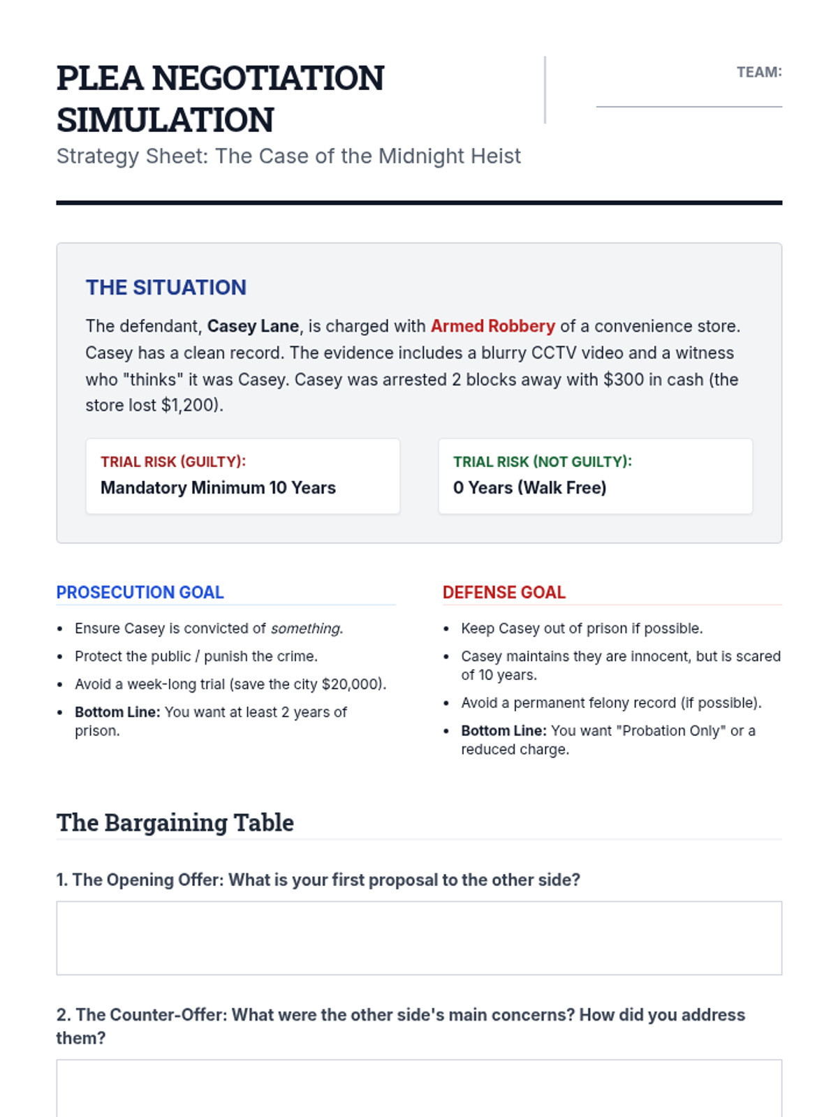 Students investigate the prevalence of plea bargaining in the US legal system and participate in a negotiation simulation to understand the trade-offs between efficiency and justice.