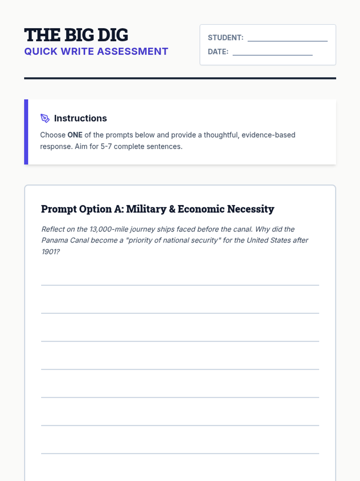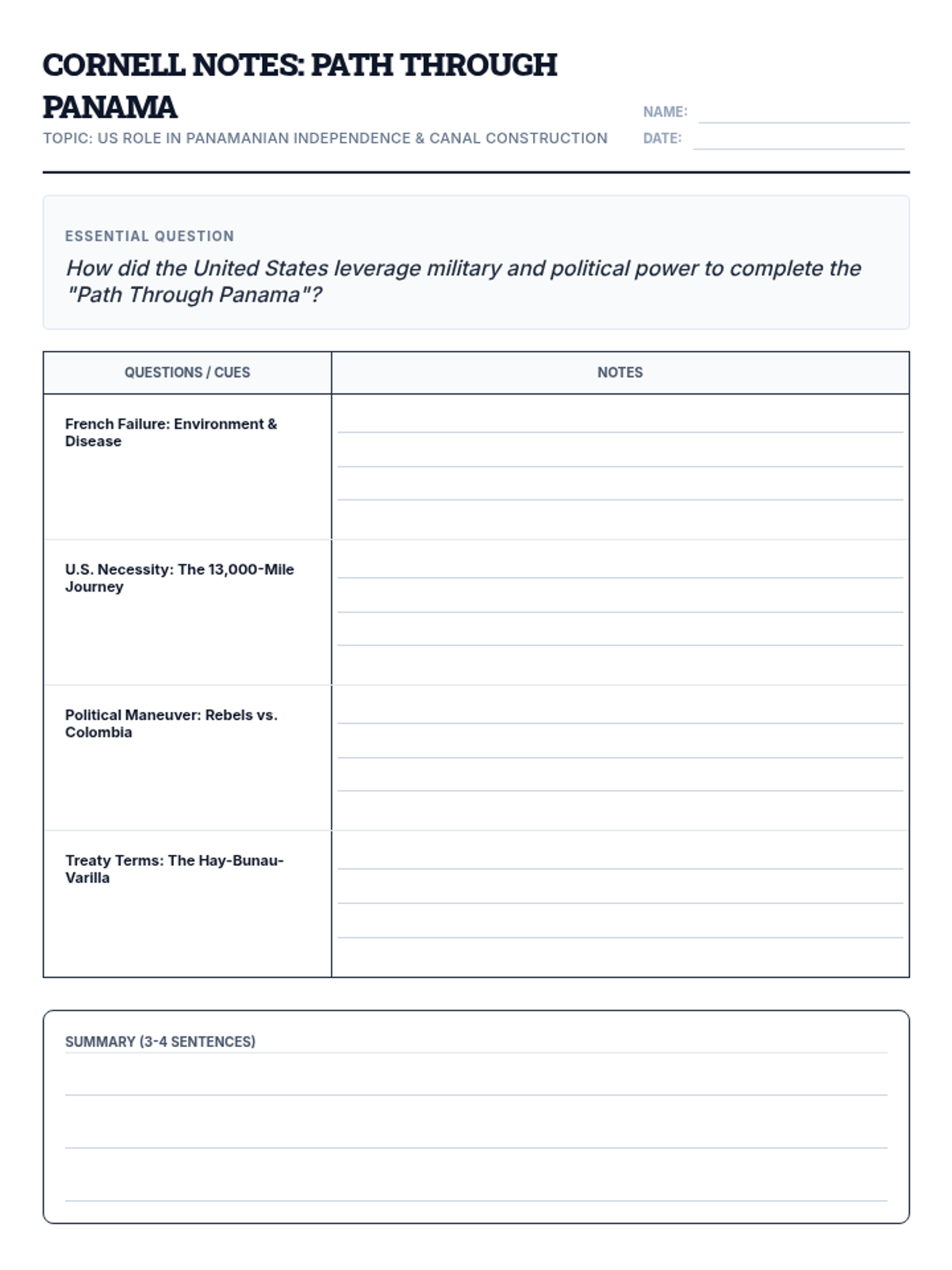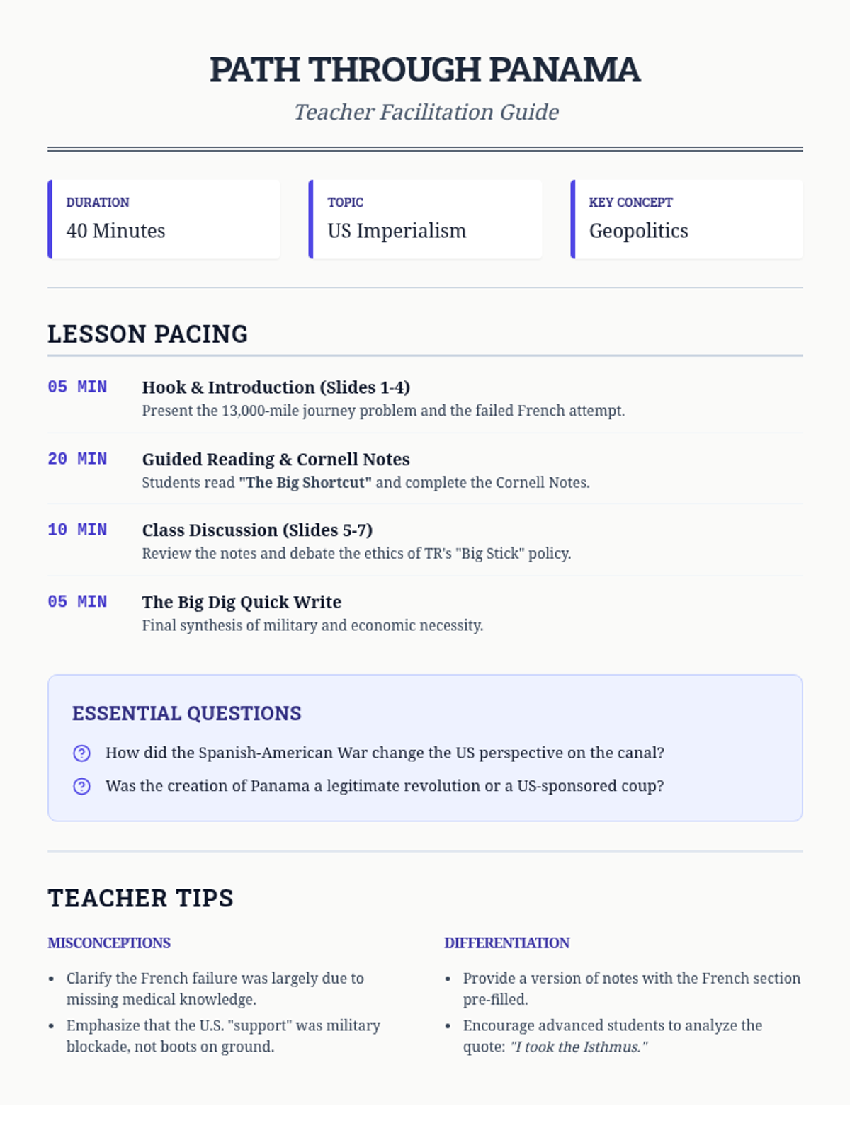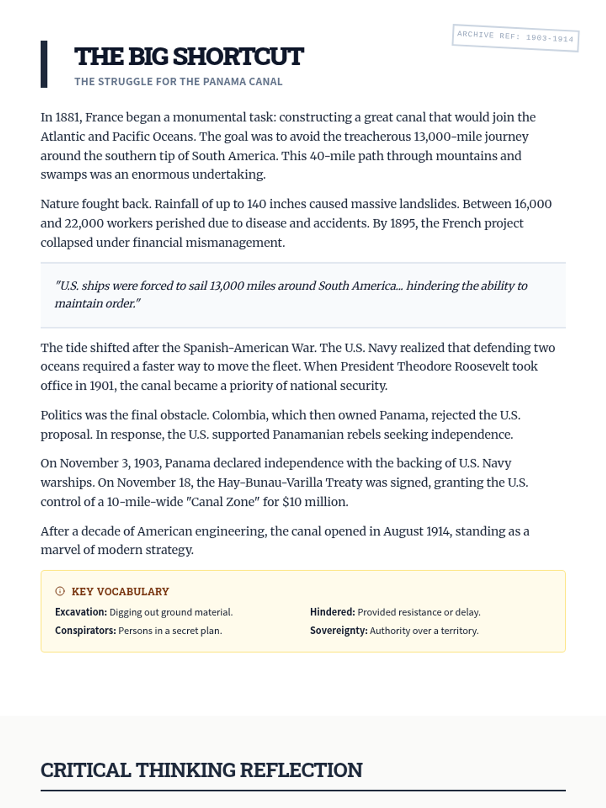 A 40-minute introductory lesson exploring the geopolitical, military, and economic motivations behind the US involvement in the Panama Canal's construction and Panamanian independence.